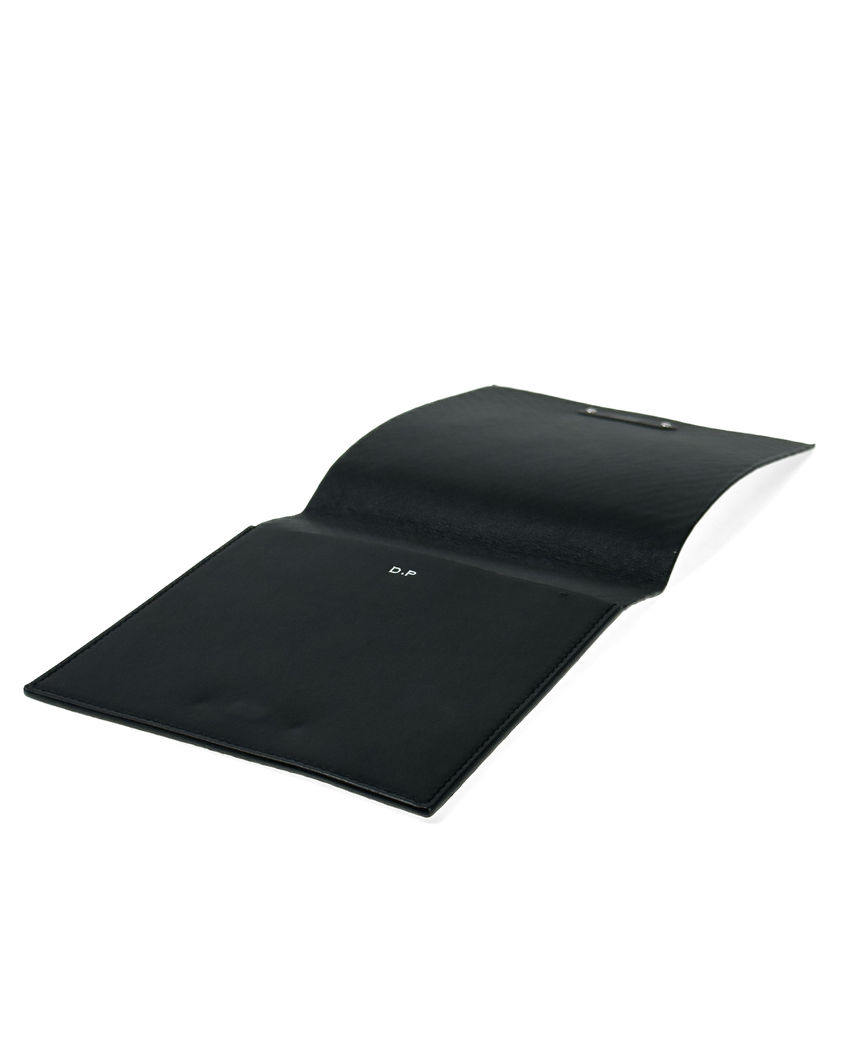 "Etui na wizytówki, tłoczona skóra lakierowana, z mieniącym się brokatem w kolorach czerwieni oraz niebieskiego, w jasnoróżowe plami, srebrne blaszka z logo marki na przodzie, wnętrze wykonane z matowej skóry ozdobione inicjałami "D.P". Stan bardzo dobry. Wymiary: 14,5cm x14,5cm."
