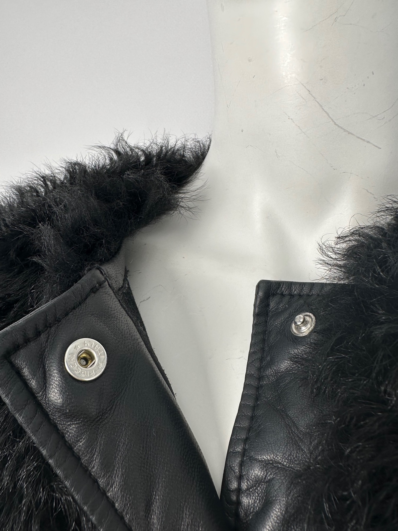 "czarne krótkie futerko ze skórzanymi elementami zapinane na zatrzaski. Wycięte metki ze składem, marką oraz rozmiarem.
