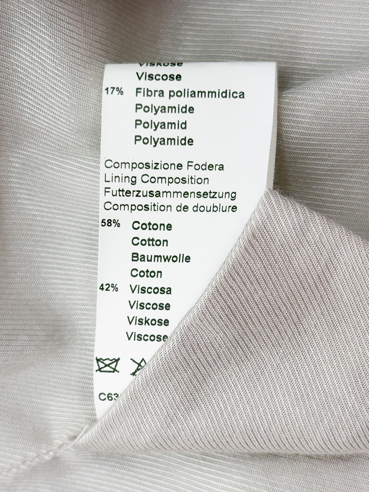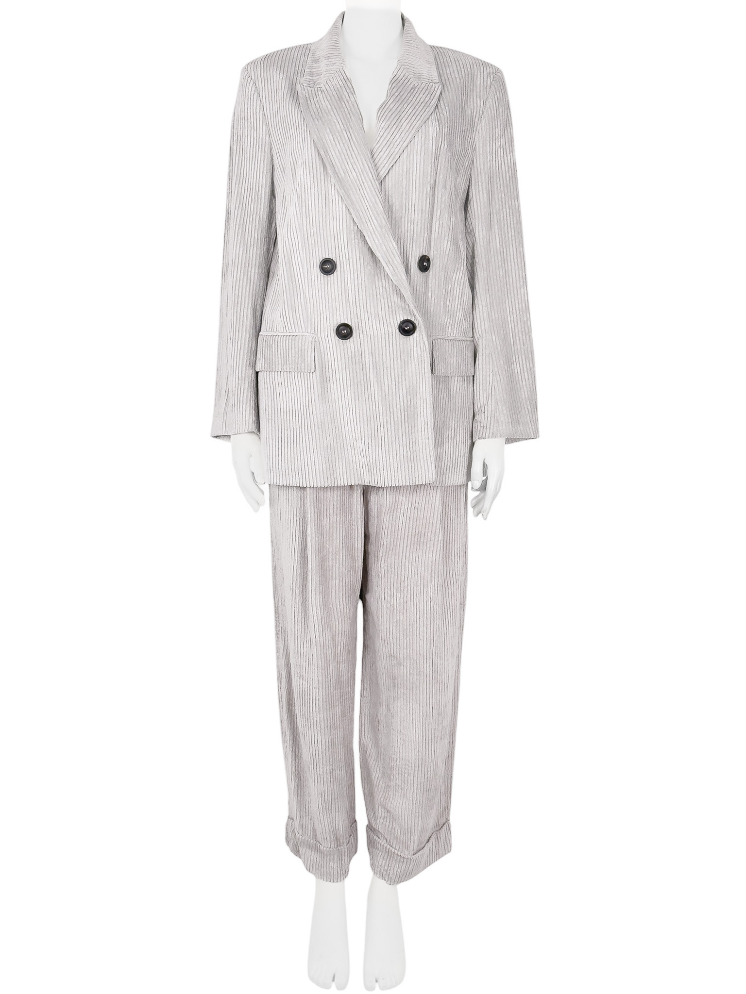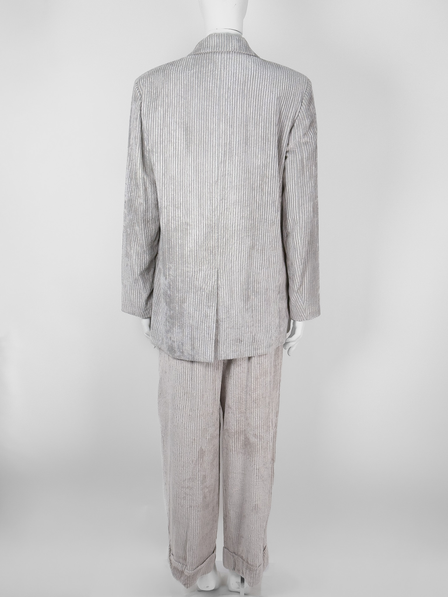 "Jasnoszary prążkowany garnitur, komplet: marynarka+ spodnie, marynarka zapinana na dwa brązowe guziki na przodzie, dwurzędowa, prosty, dłuższy krój, głęboki dekolt, dwie zaszyte kieszenie z klapami, małe poduszki na ramionach, rozporek, spodnie zapinane na kryty suwak, dwie haftki oraz guzik, regulowany pasek ze srebrną klamrą w pasie, wysoki stan, proste nogawki podwinięte na końcach, dwie kryte kieszenie po bokach oraz dwie zaszyte z tyłu. Nowy z metkami. Rozmiar z metki IT 44. Skład marynarki: materiał 1: 83% wiskoza, 17% poliamid; podszewka: 58% bawełna, 42% wiskoza. Skład spodni: materiał 1: 83% wiskoza, 17% poliamid;; materiał 2: 61% acetat, 39% kupro."