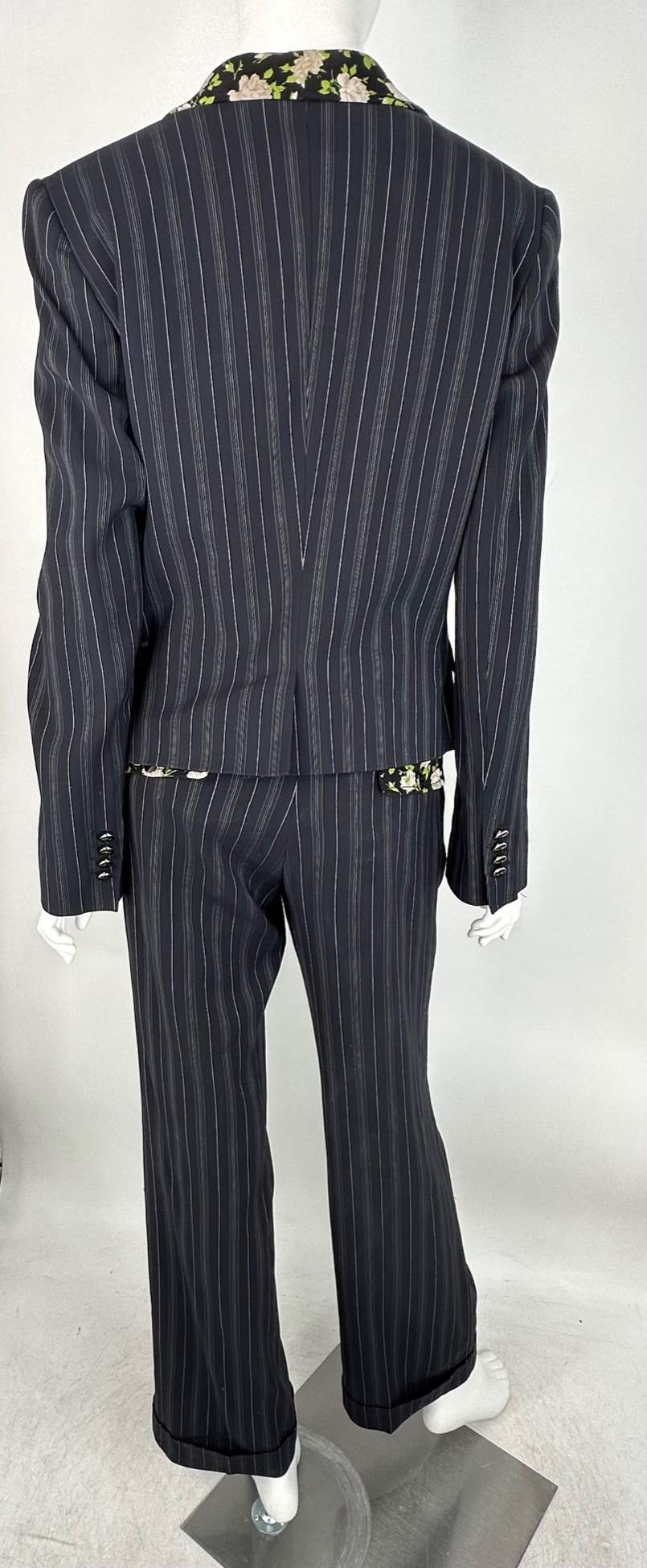 "garnitur w kolorze granatowym w białe podłużne paseczki, z kwiatowymi wstawkami przy kołnierzu oraz na spodniach, marynarka zapinana na jeden guzik, boczne kieszenie, bufki na ramionach, podszewka w panterkę, spodnie w kant, z mankietami na dole, zapinane w talii na dwa guziki oraz suwak, boczne i tylne kieszenie. Rozmiar 44. Skład: 45% bawełna, 33% wiskoza, 20% jedwab, 1% poliester, 1% lycra. Wymiary: żakiet: dł. całkowita 57 cm, szer. biust 50 cm, szer. talia 43cm ; spodnie: szer. talia 43 cm, dł. całkowita 99 cm, szer. biodra 49 cm"