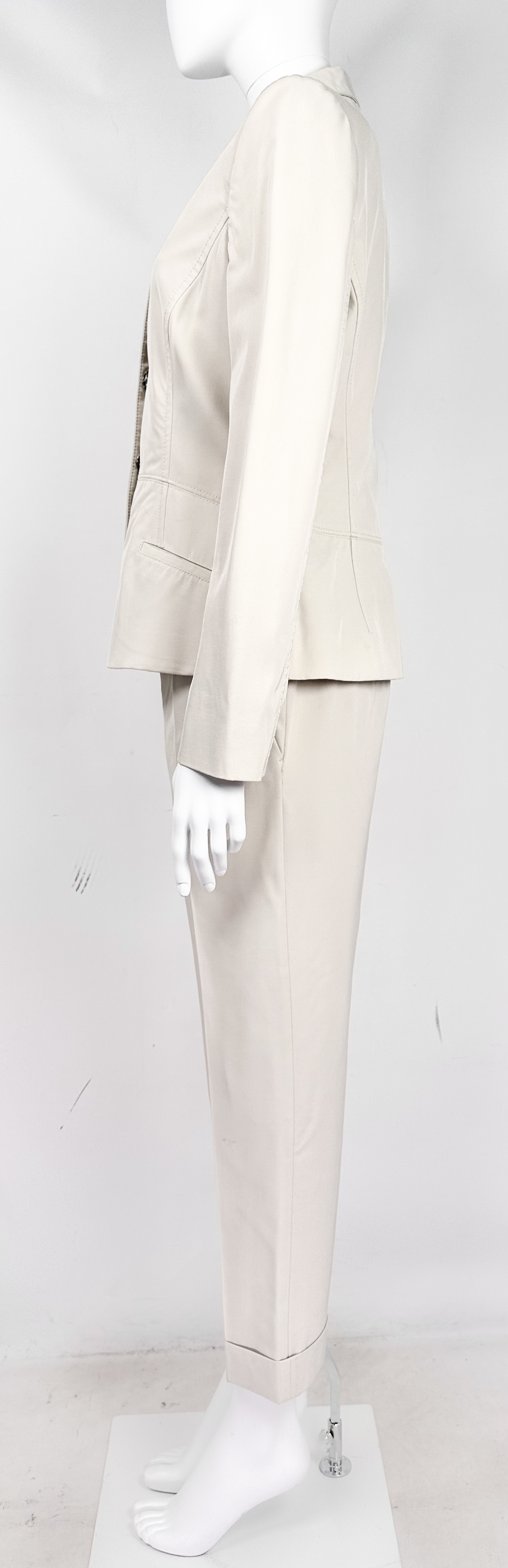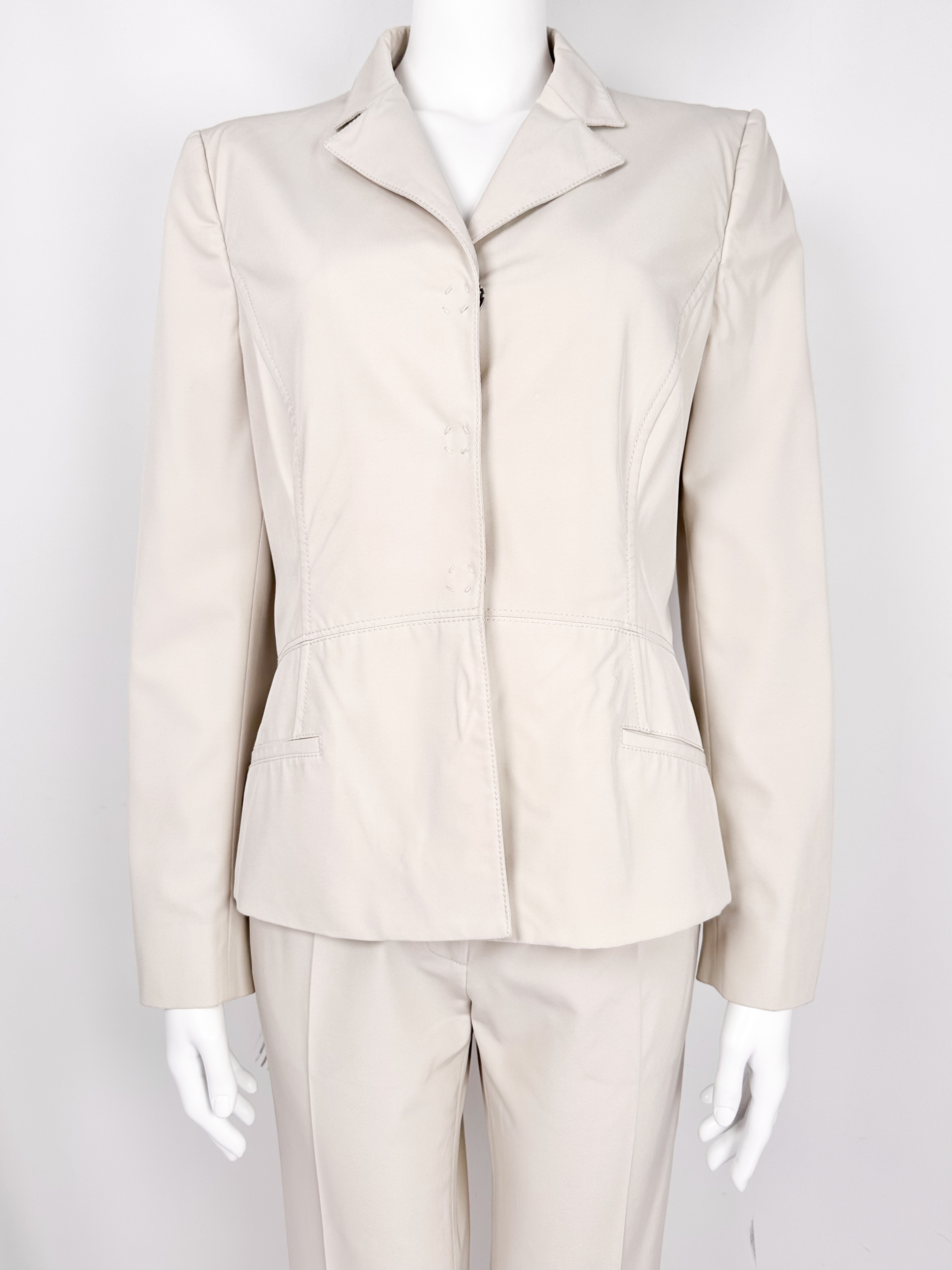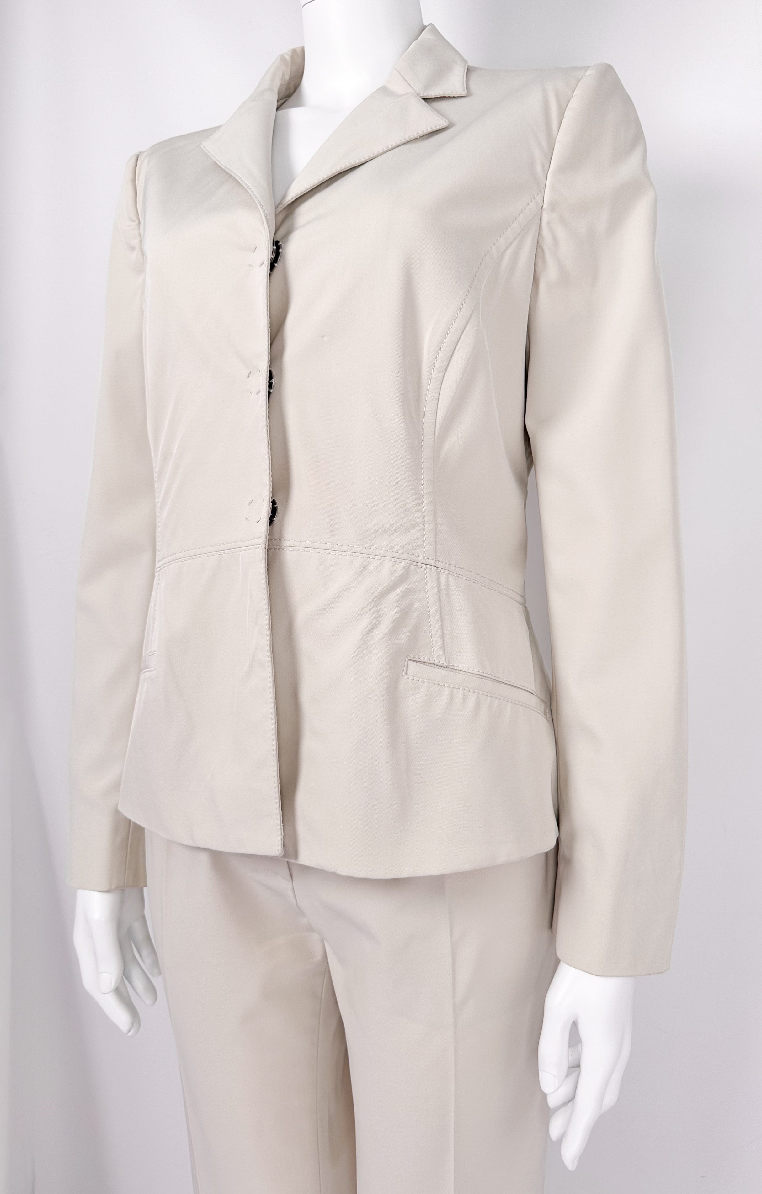 "Jasnobeżowy( w chłodnym odcieniu) garnitur, żakiet z przeszyciami zapinany z przodu na zatrzaski, długi rękaw, boczne kieszenie podszyte, podszewka, spodnie w kant z podwiniętymi mankietami, boczne kieszenie, zapinana w talii na suwak. Rozmiar IT 44. Skład: 90% poliester, 10% elastan. Wymiary żakietu: szerokość mierzona od pachy do pachy 47cm, długość całkowita 62cm; wymiary spodni: szerokość w pasie 45cm, długość całkowita mierzona od zewnętrznej strony nogawki 90cm."