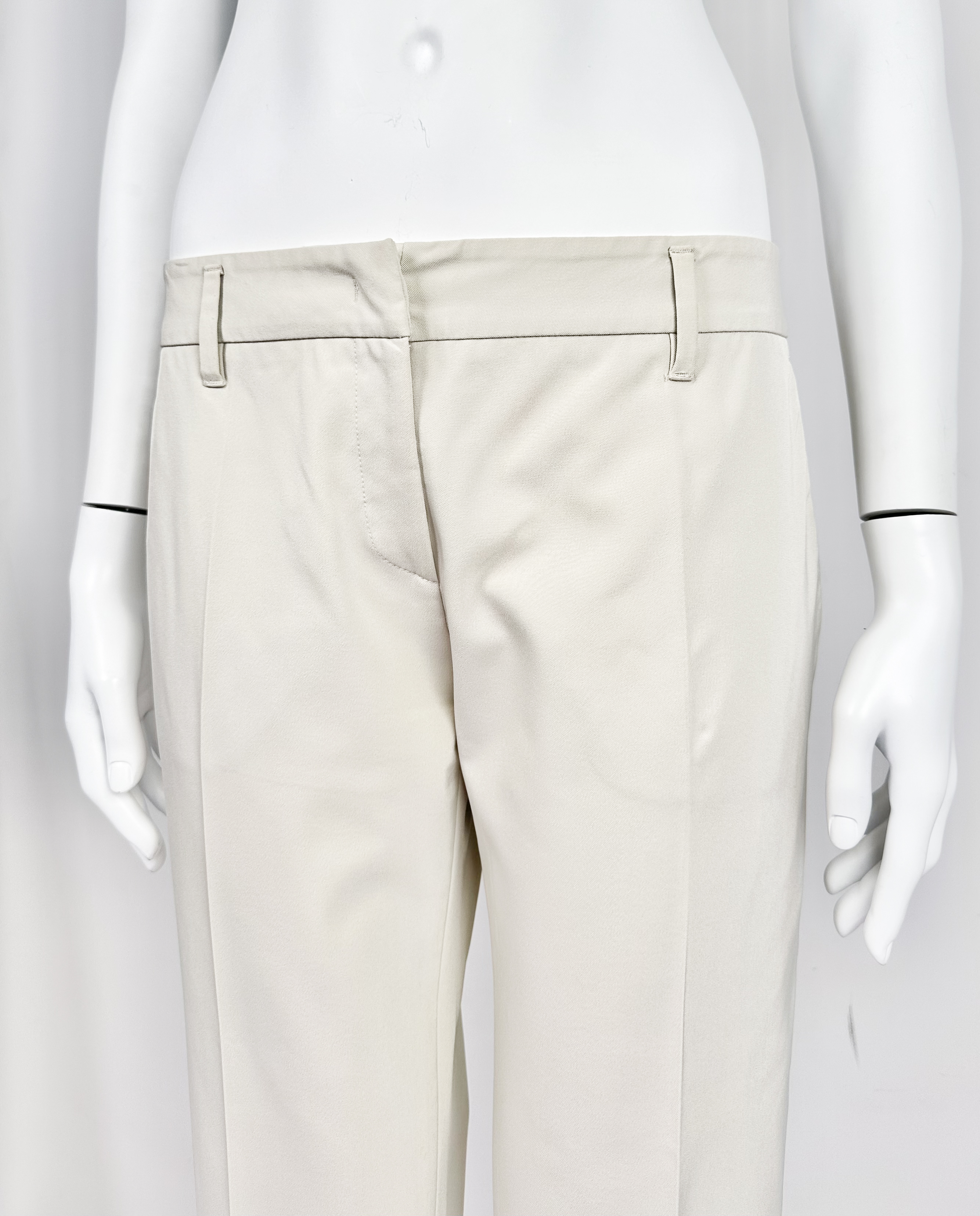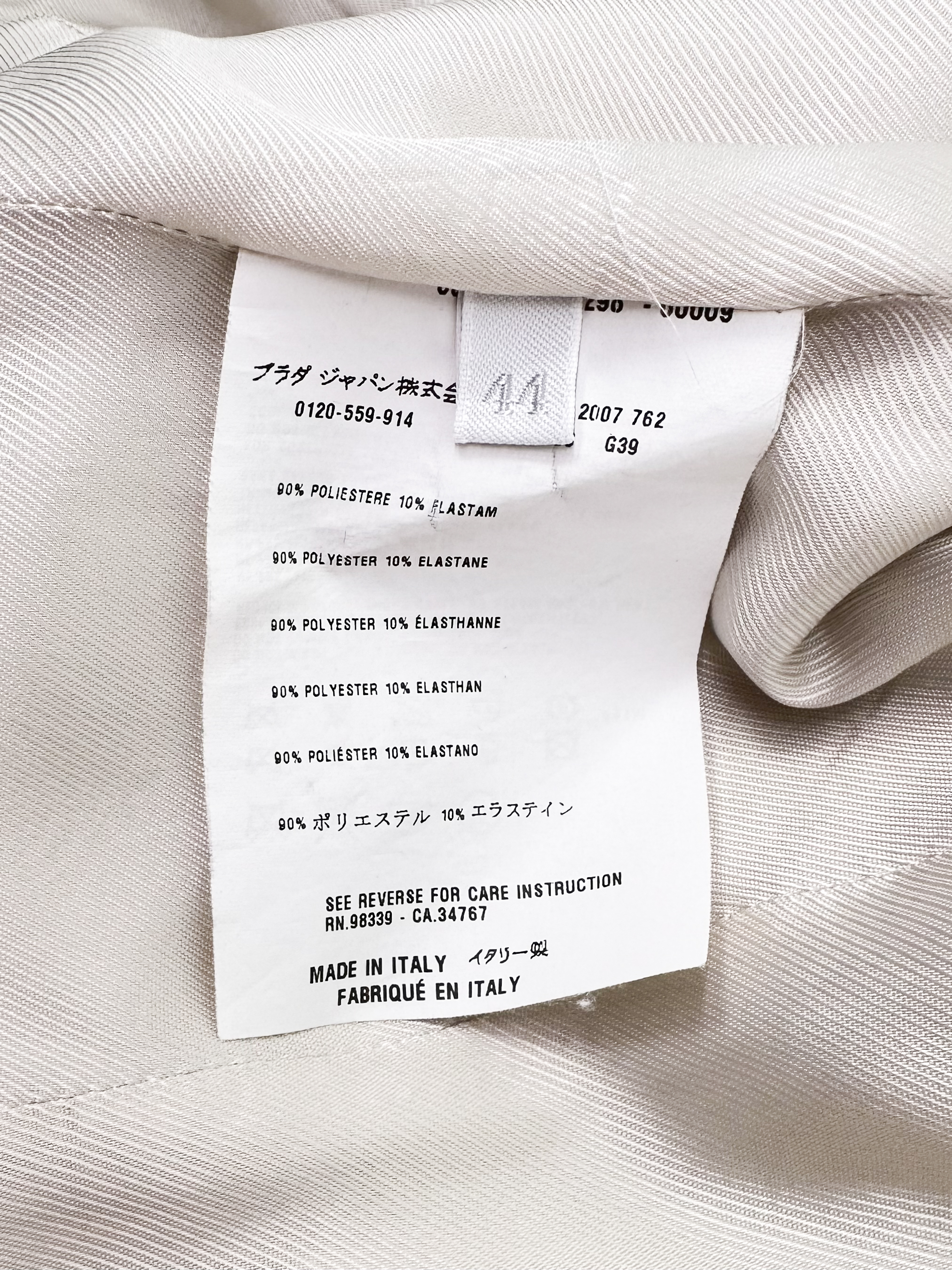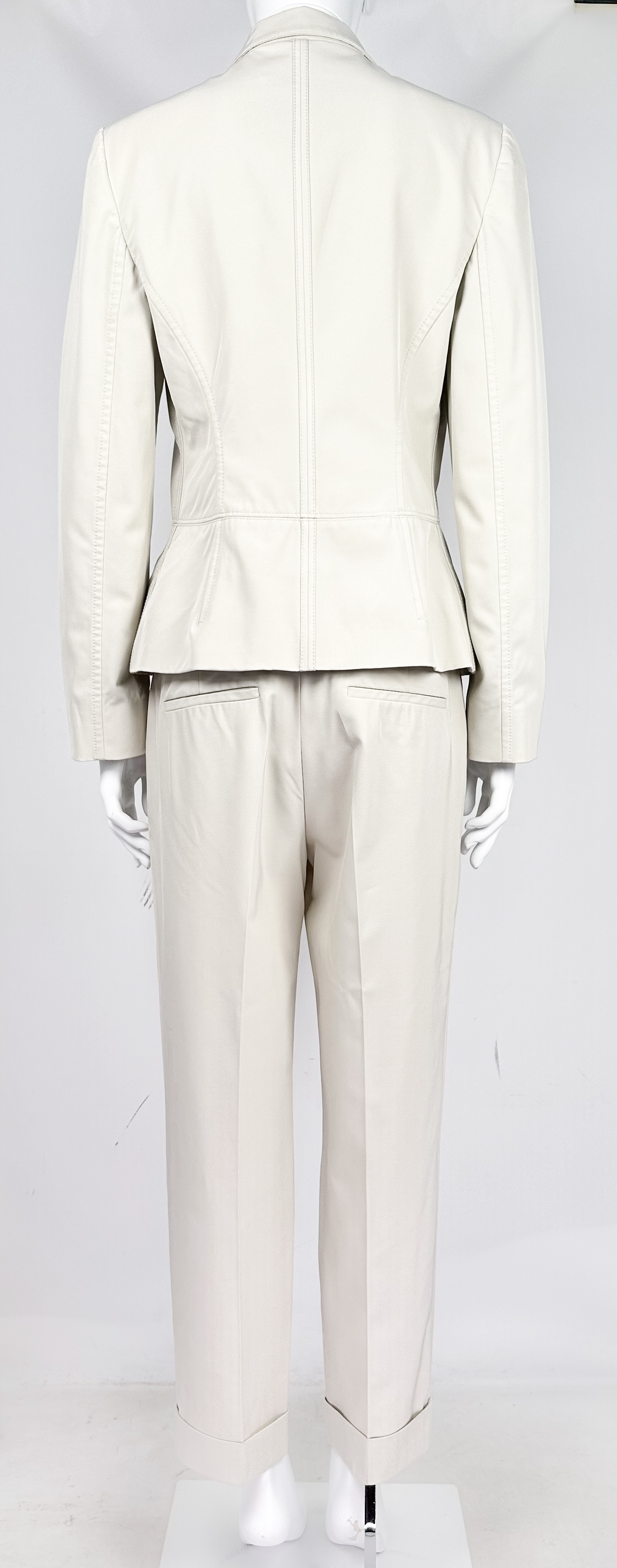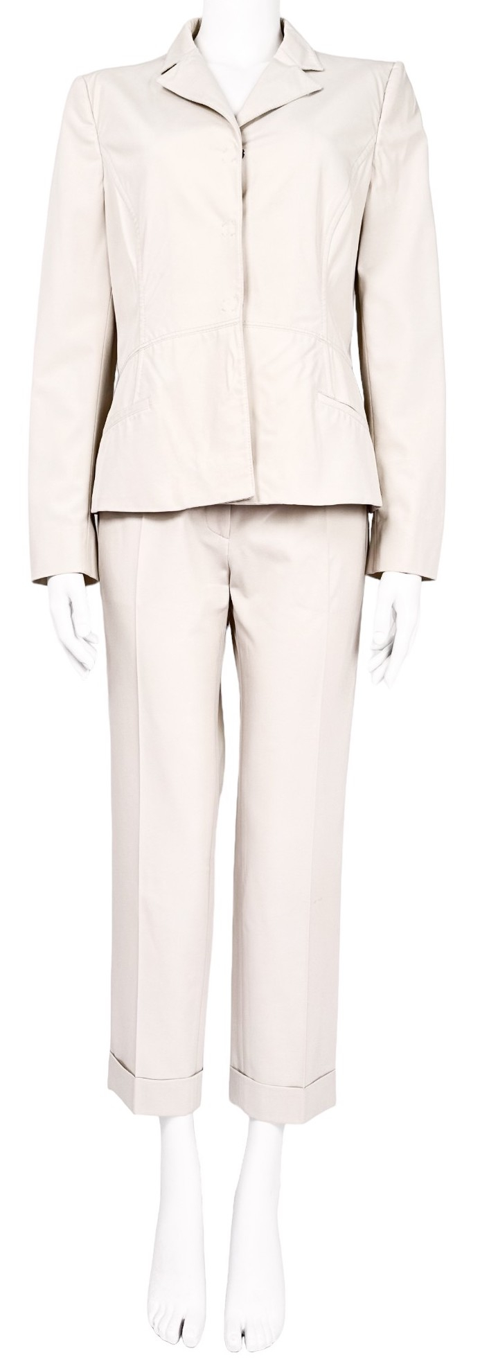 "Jasnobeżowy( w chłodnym odcieniu) garnitur, żakiet z przeszyciami zapinany z przodu na zatrzaski, długi rękaw, boczne kieszenie podszyte, podszewka, spodnie w kant z podwiniętymi mankietami, boczne kieszenie, zapinana w talii na suwak. Rozmiar IT 44. Skład: 90% poliester, 10% elastan. Wymiary żakietu: szerokość mierzona od pachy do pachy 47cm, długość całkowita 62cm; wymiary spodni: szerokość w pasie 45cm, długość całkowita mierzona od zewnętrznej strony nogawki 90cm."