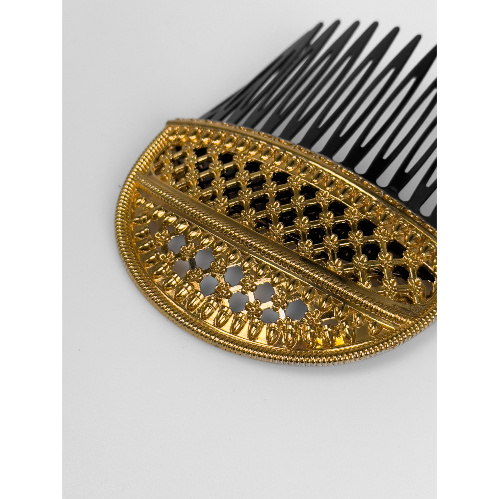 "Czarno-złoty grzebień wtykowy, ozdoba do włosów, motyw kwiatowy, połyskujący, półokrągły kształt. W zestawie z pudełkiem. Stan dobry, delikatnie zakrzywione zęby."