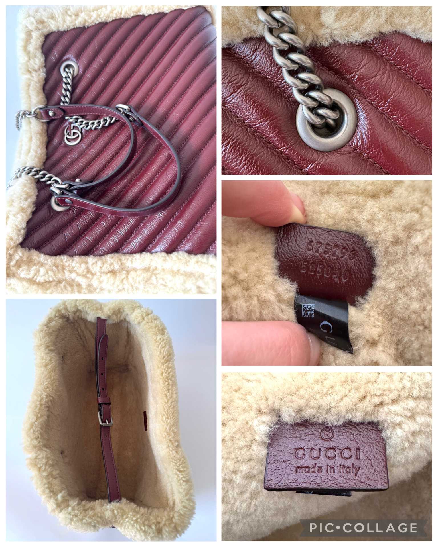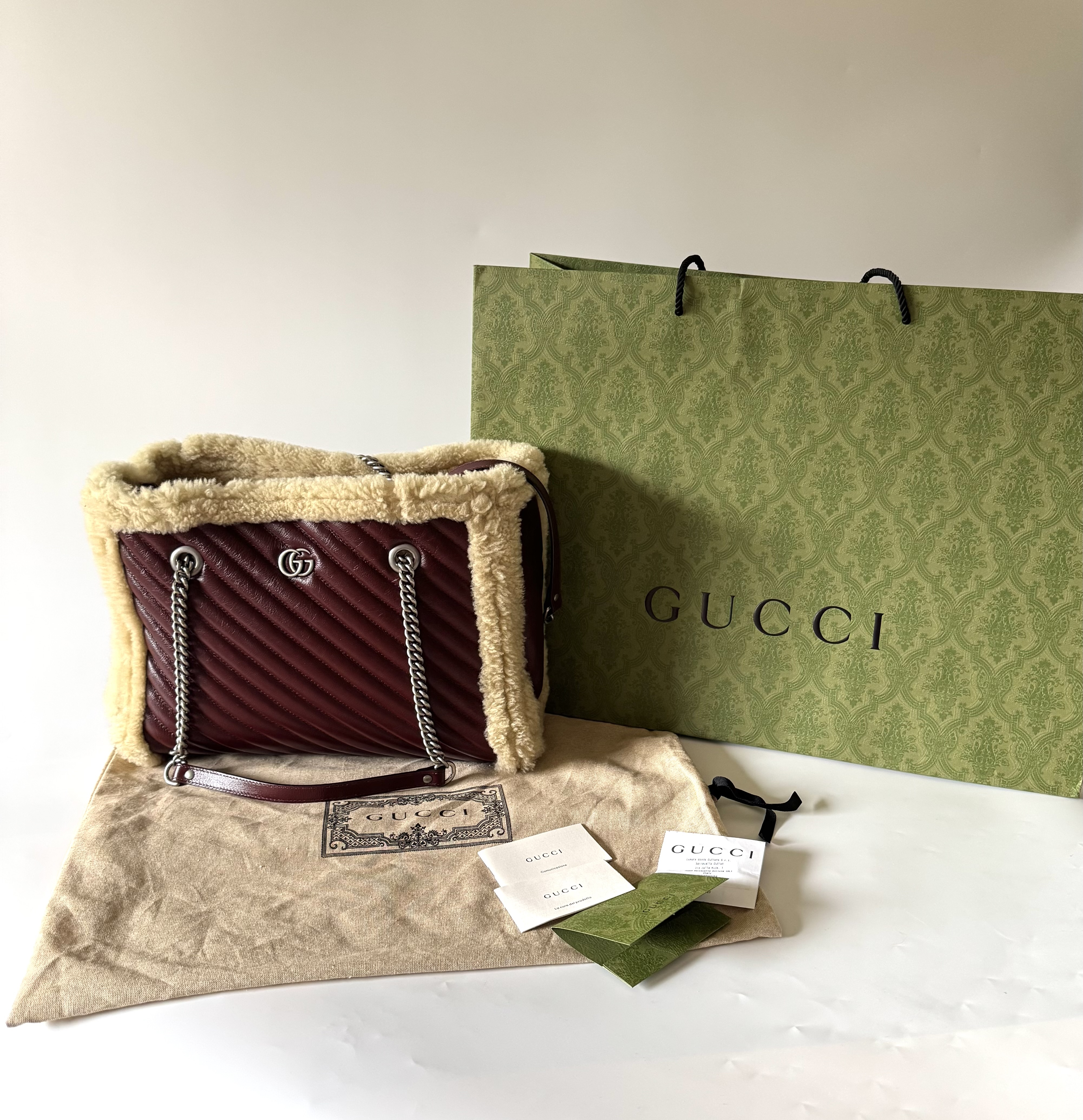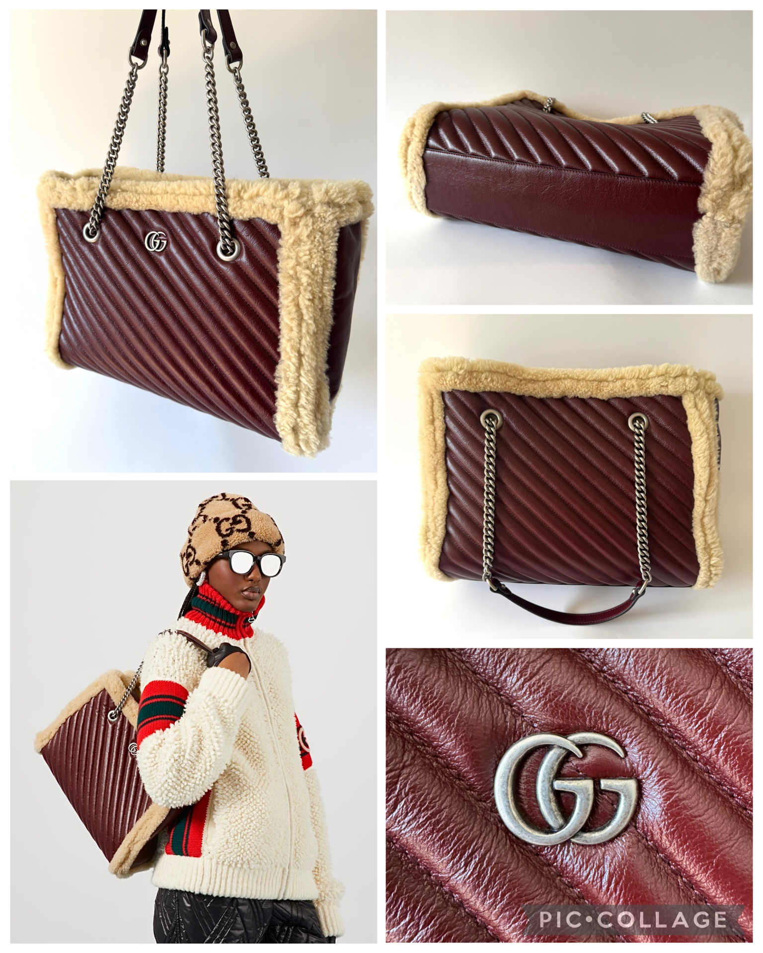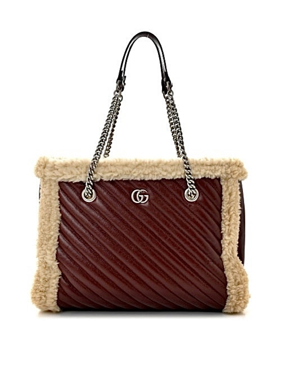 "GUCCI Azalea Calfskin Matelasse Diagonal Shearling Medium GG Marmont Tote with wool trim - torebka