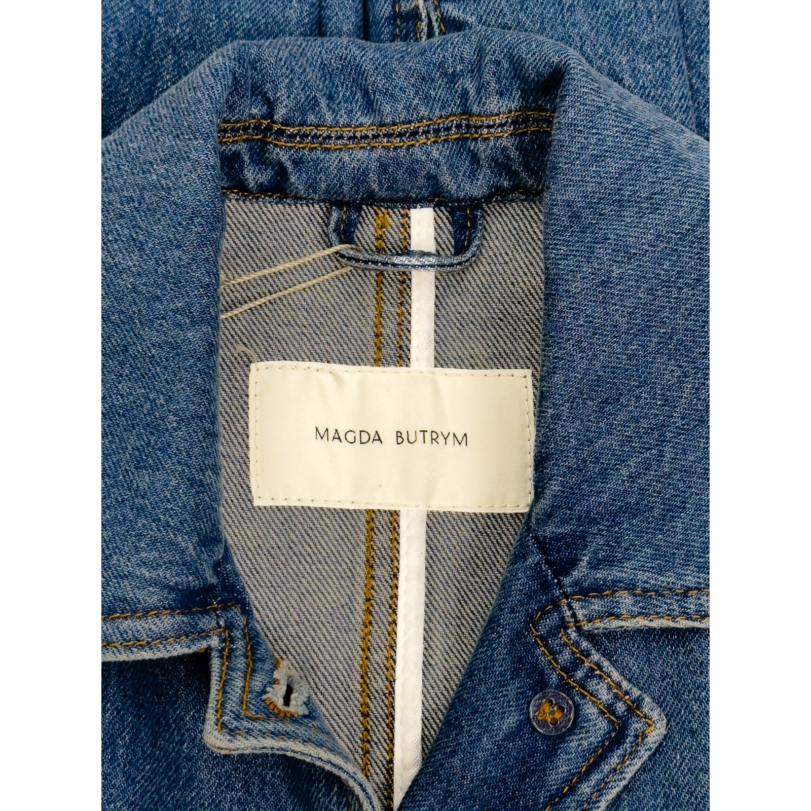 "Niebieski jeansowy płaszcz, długość maxi, szpiczasty kołnierz, zapinany na szylkretowe, logowane guziki, wiązany pasek w talii, dwie kryte kieszenie po bokach, rozporek, wykończony musztardową nitką. Rozmiar z metki 34. Skład: 100% bawełna. Wymiary: szerokość mierzona od pachy do pachy 56cm, długość całkowita 126cm."