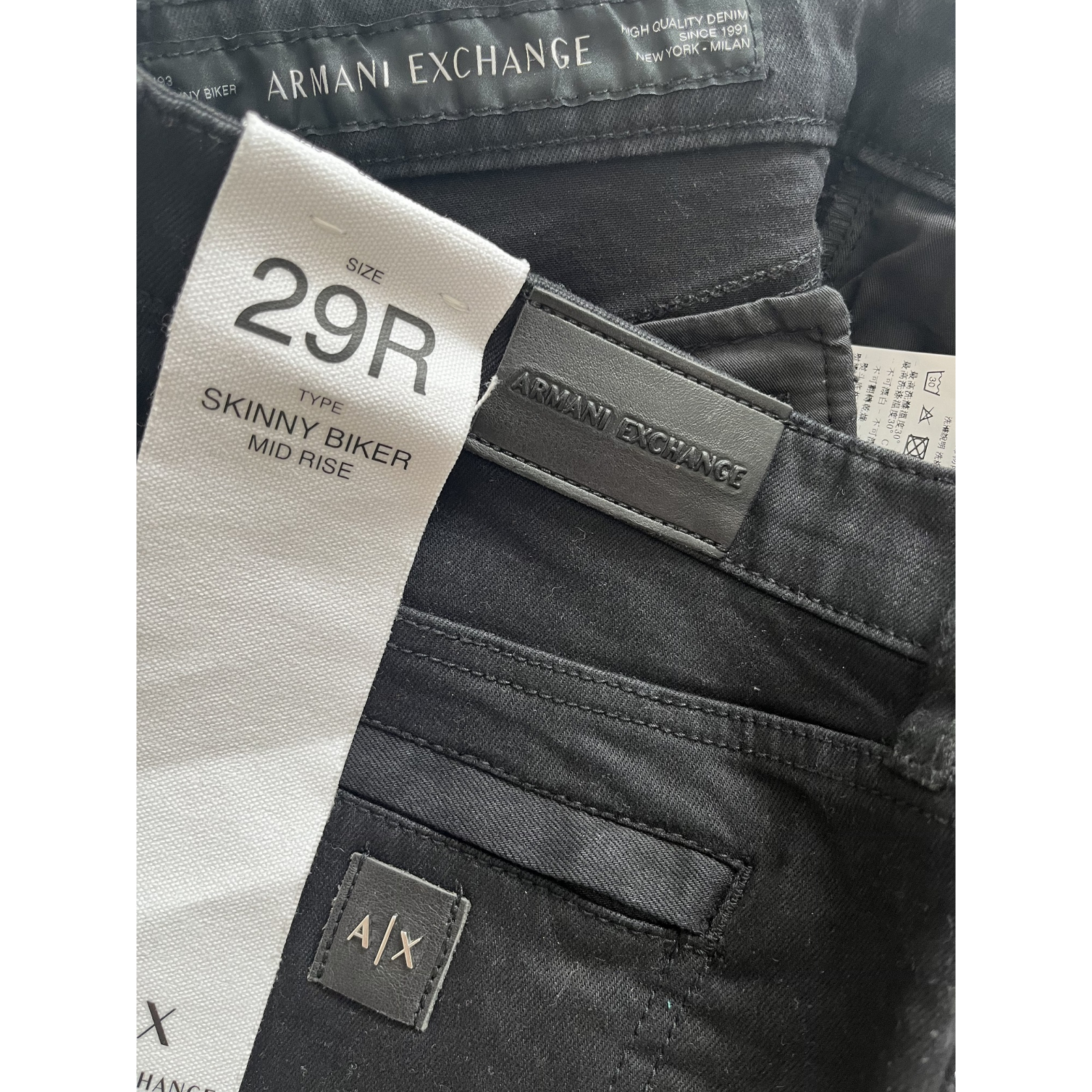 "Nowe z metkami jeansy marki Armani Exchange. Kolor czarny. Z przodu boczne kieszenie plus kieszonka na suwak. Tylne kieszenie kryte - również na suwak. Jeansy mają przetarcia (bez widocznych dziur) na całej długości spodni z przodu. Tył spodni gładki. Wymiary: w pasie ok. 80 cm, biodra ok. 92-94 cm, długość całkowita ok. 98 cm (wszystkie wymiary na płasko, bez naciągania). Skład: 91% bawełna, 7% poliester, 2 % elastan."