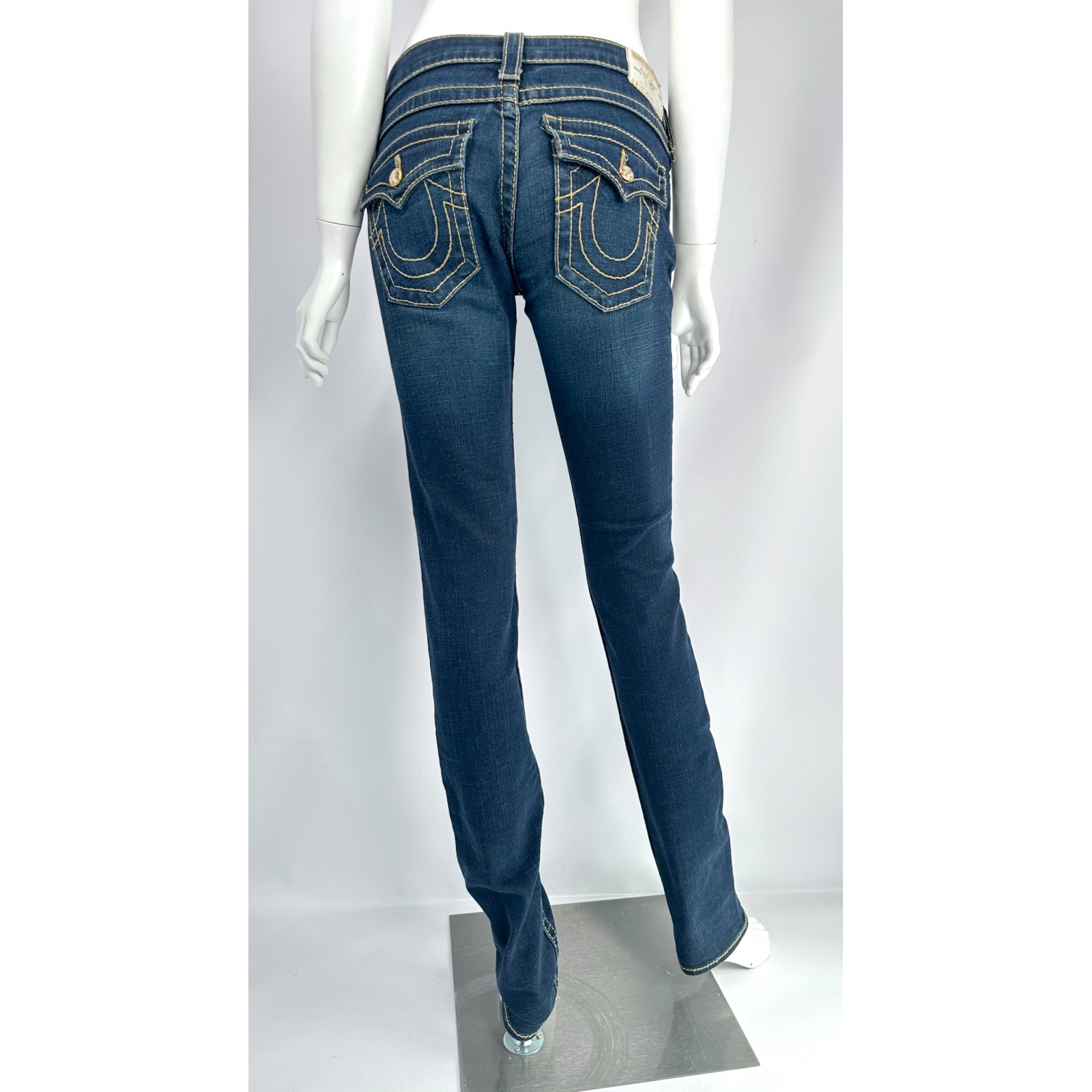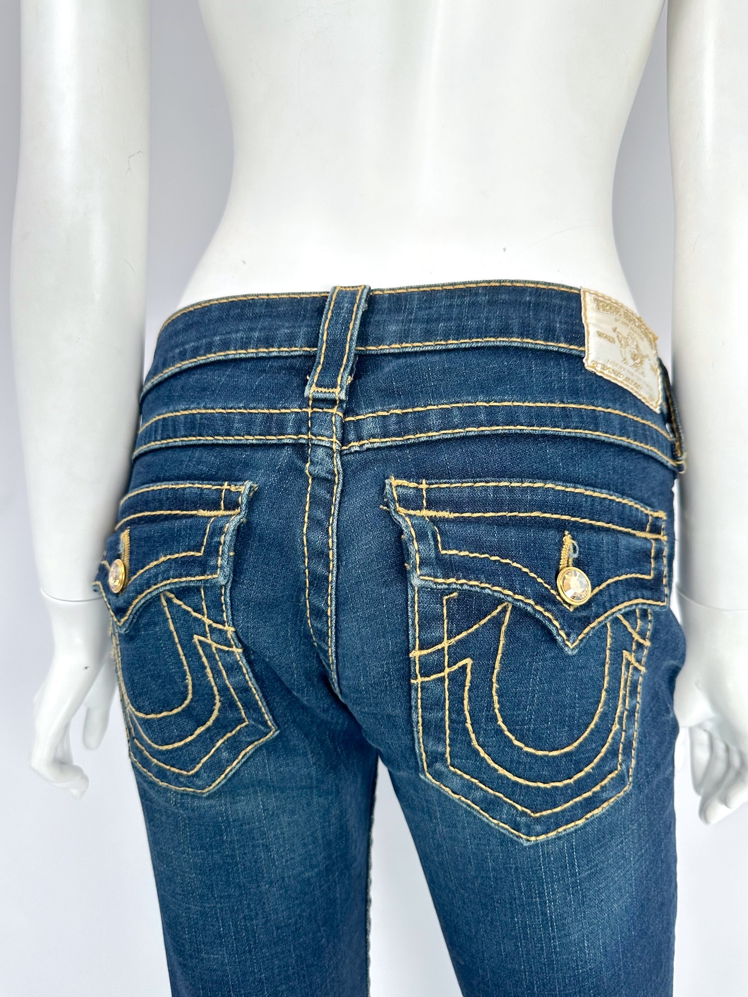"granatowe cieniowane jeansy, z musztardowymi obszyciami i ozdobnymi guzikami z cyrkonii, tylne kieszenie z klapami, w talii naszywka z logiem. Rozmiar 27. Skład: 99% bawełna, 1% elastan. Wymiary: szer. talii 38 cm, szer. bioder 44 cm, dł. całkowita 112 cm."