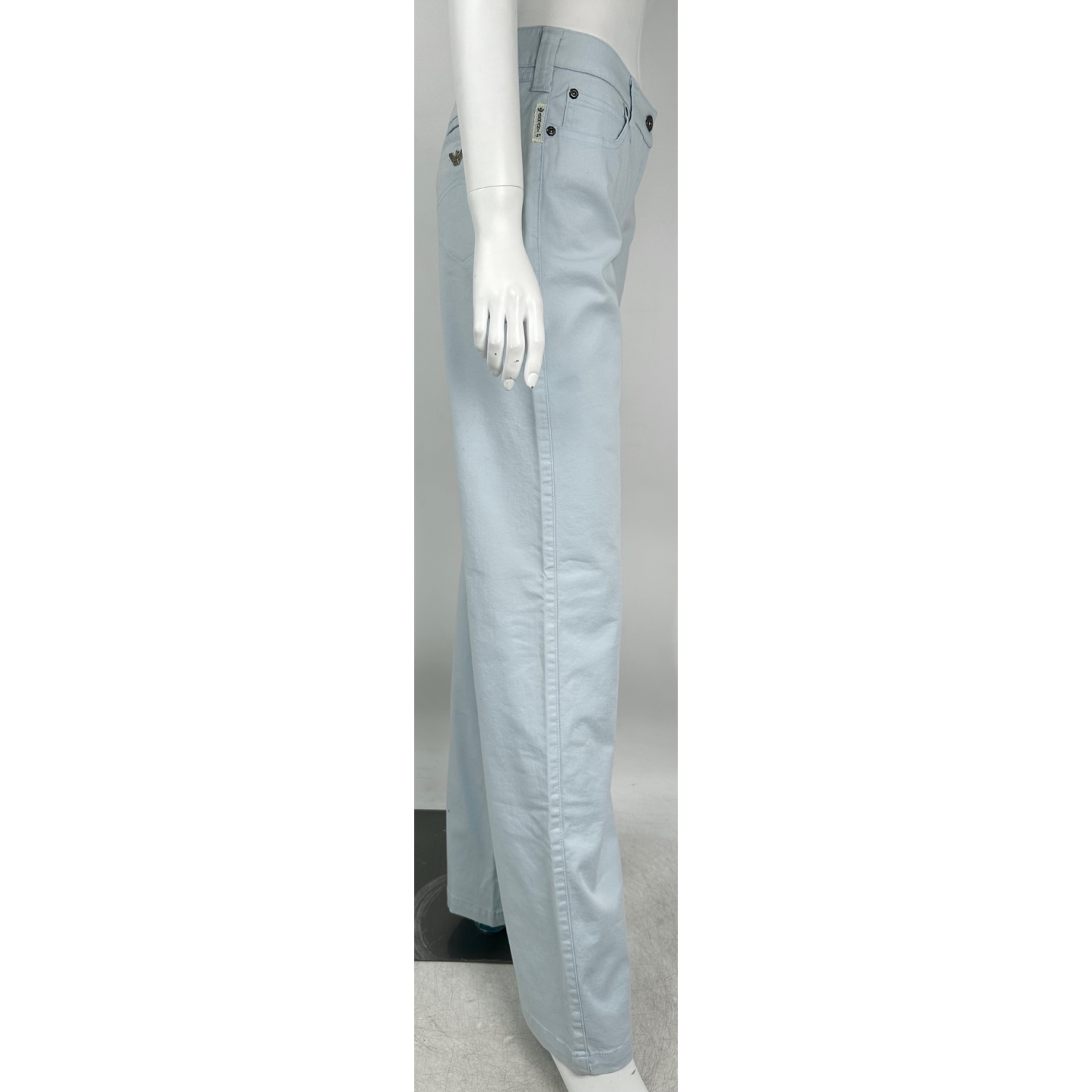 "jasnoniebieskie jeansy z szerokimi nogawkami, metalowe logo na tylnej kieszeni, zapięcie w talii na suwak i guzik. Nowe z metkami. Rozmiar IT 42. Skład: 96% bawełna, 4% elastan. Wymiary: szer. talii 38 cm, szer. bioder 46 cm, dł. całkowita 109 cm."