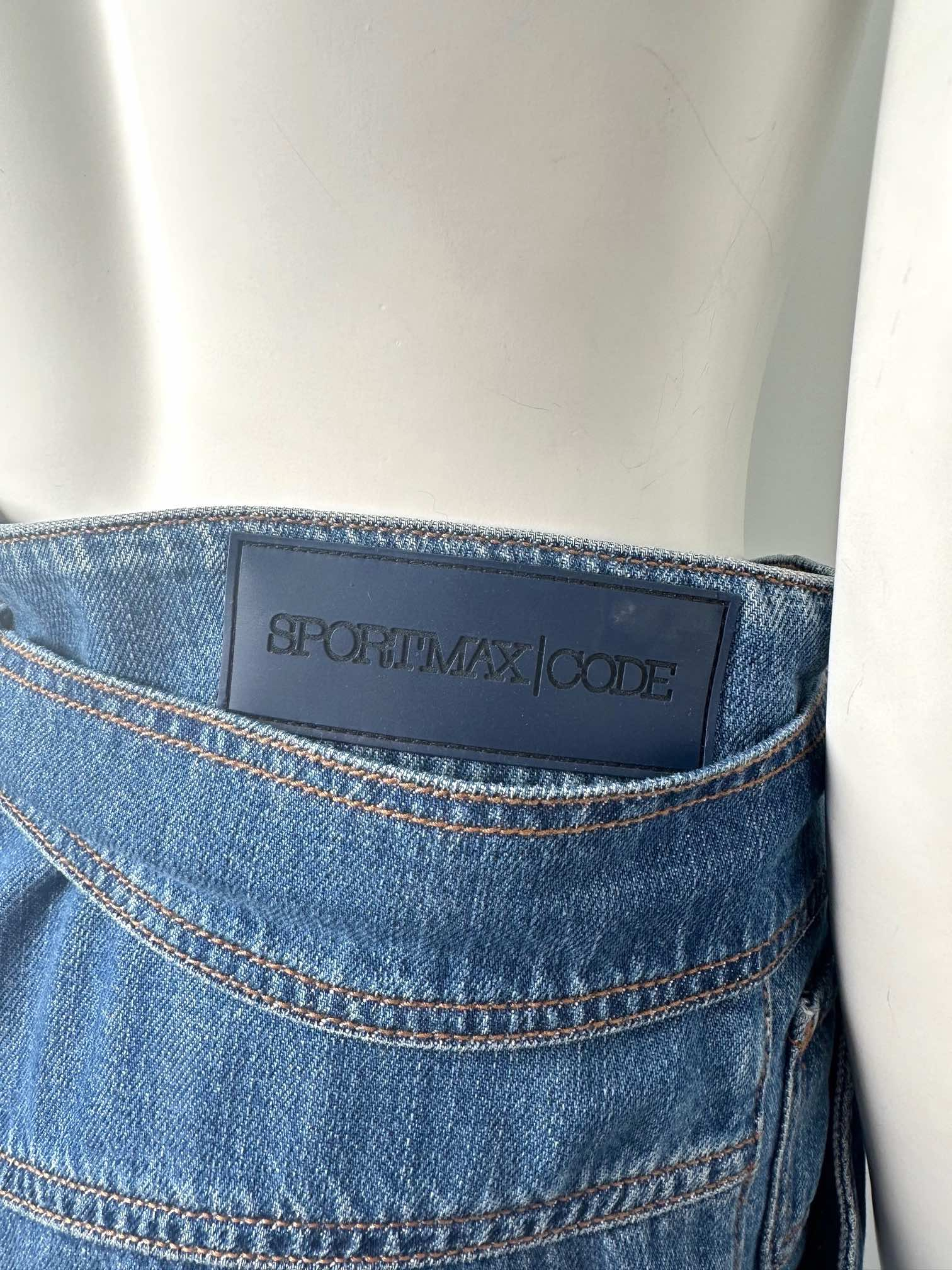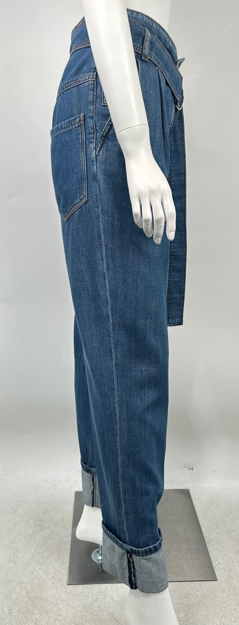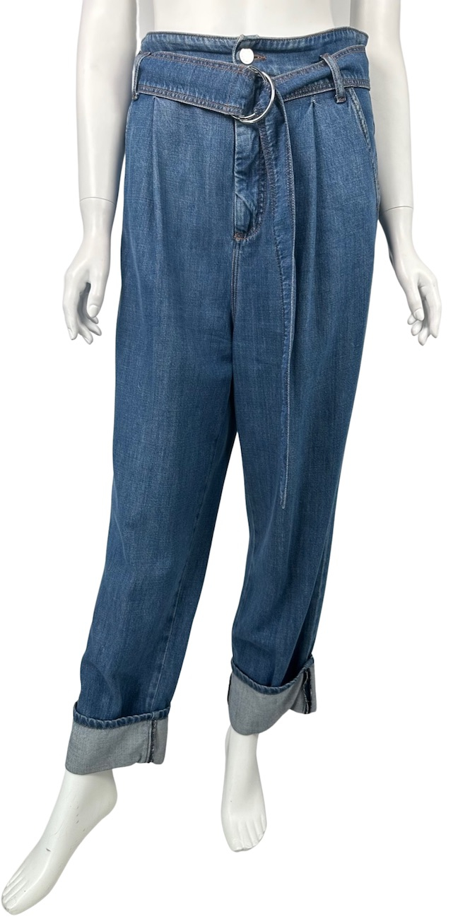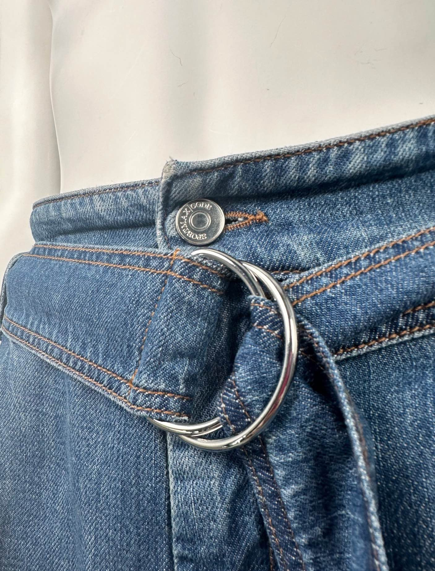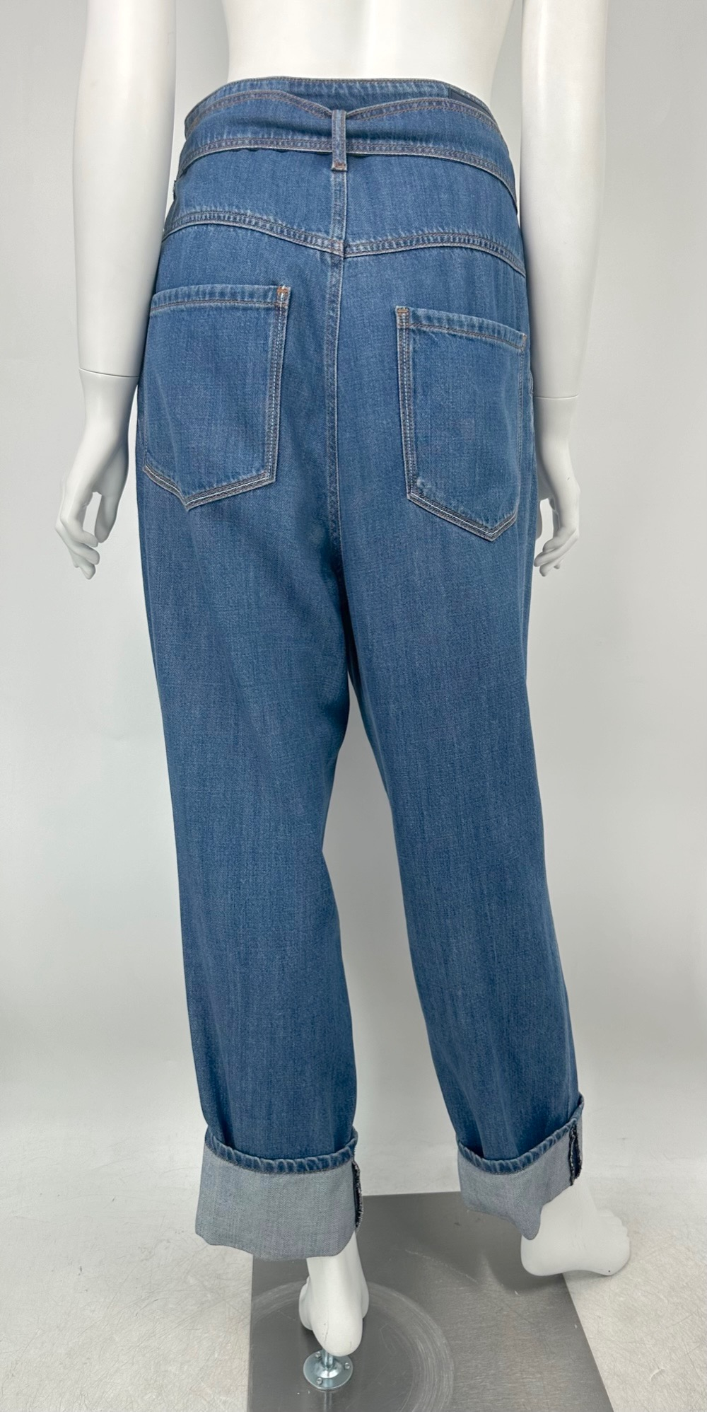 "jeansy z wysokim stanem z ozdobnym paskiem w talii. Szeroka podwijana nogawka. Pomarańczowe przeszycia. Rozmiar z metki 27. Wymiary: szer. talii 37 cm, szer. bioder 43 cm, dł. całkowita 102 cm."