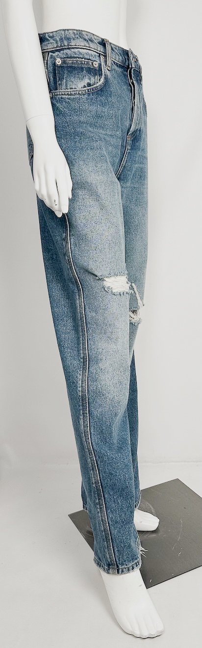 "Niebieskie jeansy z przetarciami na kolanach, lekki efekt wytarcia, wysoki stan, prosta nogawka, zapinane na srebrne logowane guziki, trzy kieszenie na przodzie, dwie z tyłu, wykończone jasnobrązową nitką, duże brązowe skórzane logo marki przy szlufkach. Nowe z metką. Rozmiar z metki IT 38. Skład: 100% bawełna. Wymiary: szerokość w pasie 39cm, długość mierzona od zewnętrznej strony 110cm."