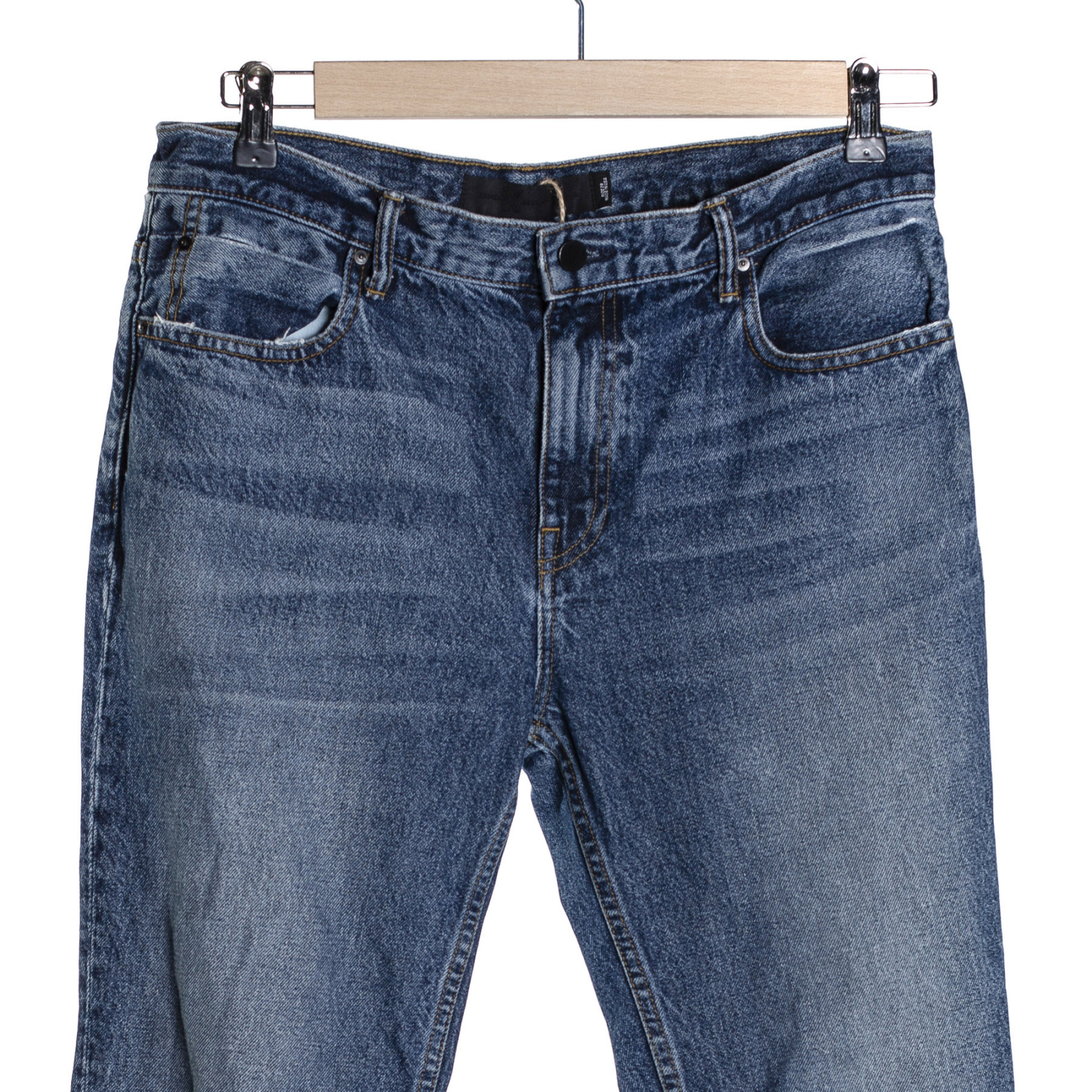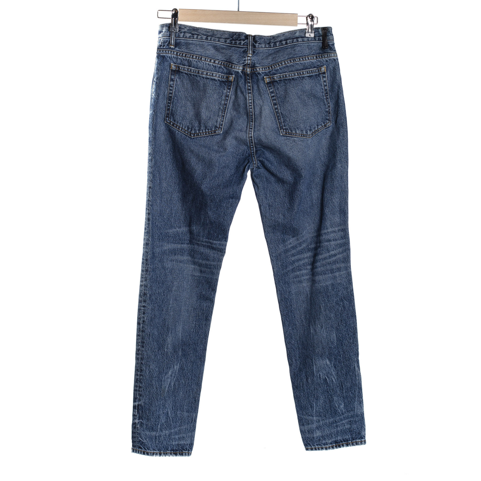 "Granatowe jeansy, wysoki stan, delikatnie zwężane na dole. Rozmiar z metki 29."