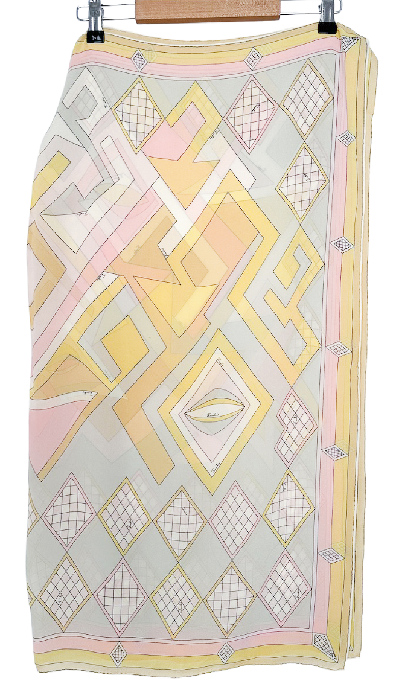 "Jedwabna apaszka w pastelowych kolorach, w geometryczne wzory, cienka, delikatnie transparentna, biała lamówka, kwadratowy kształt, czarne logo marki na grafice. Brak metki ze składem. Wymiary: 82cm x 80cm."
