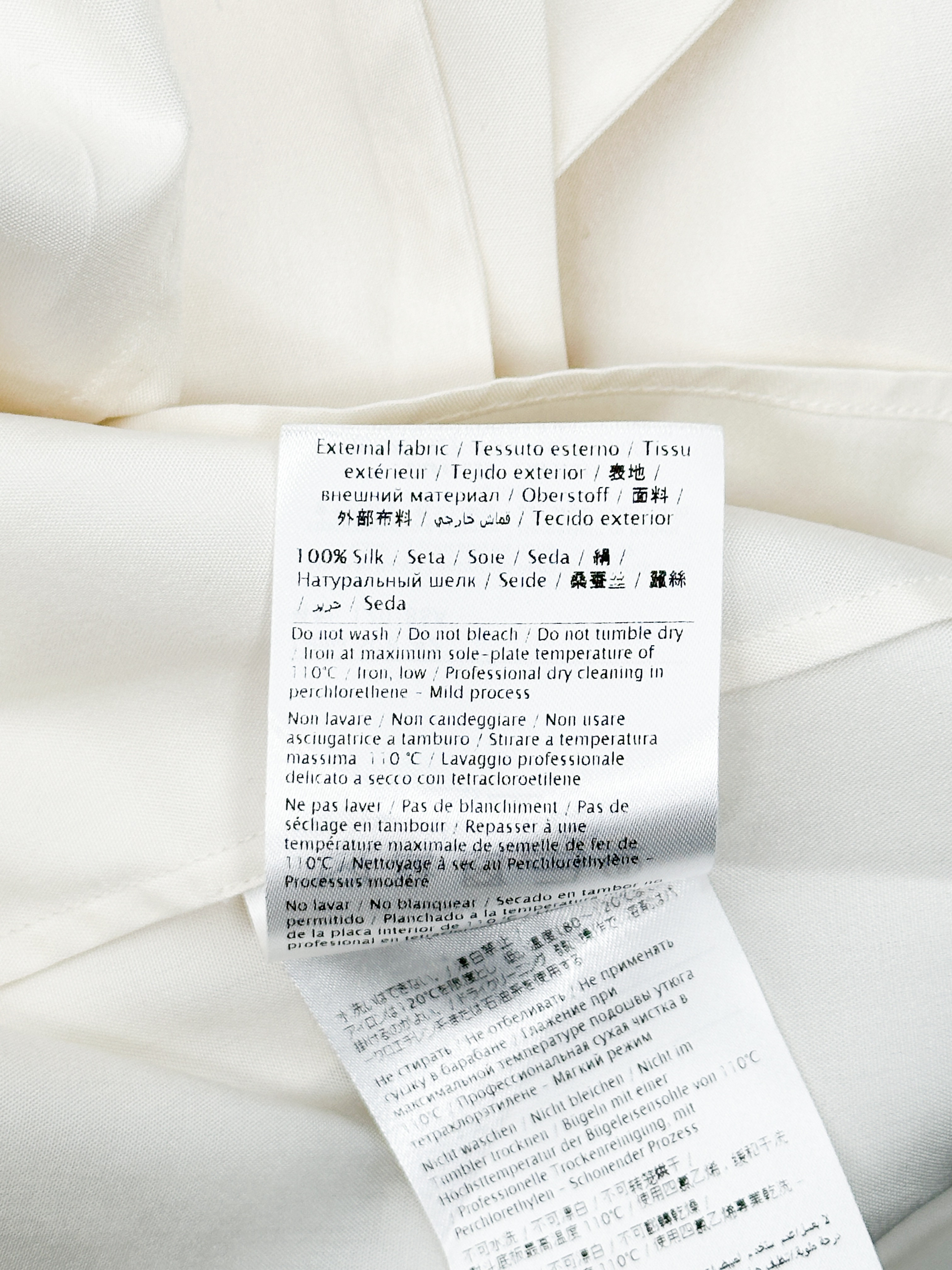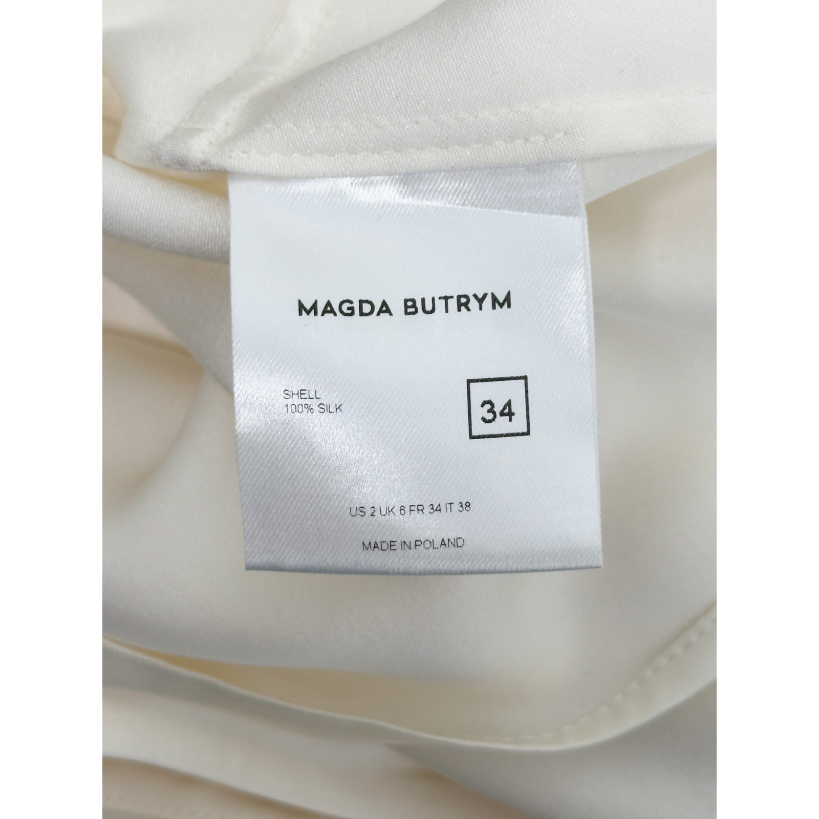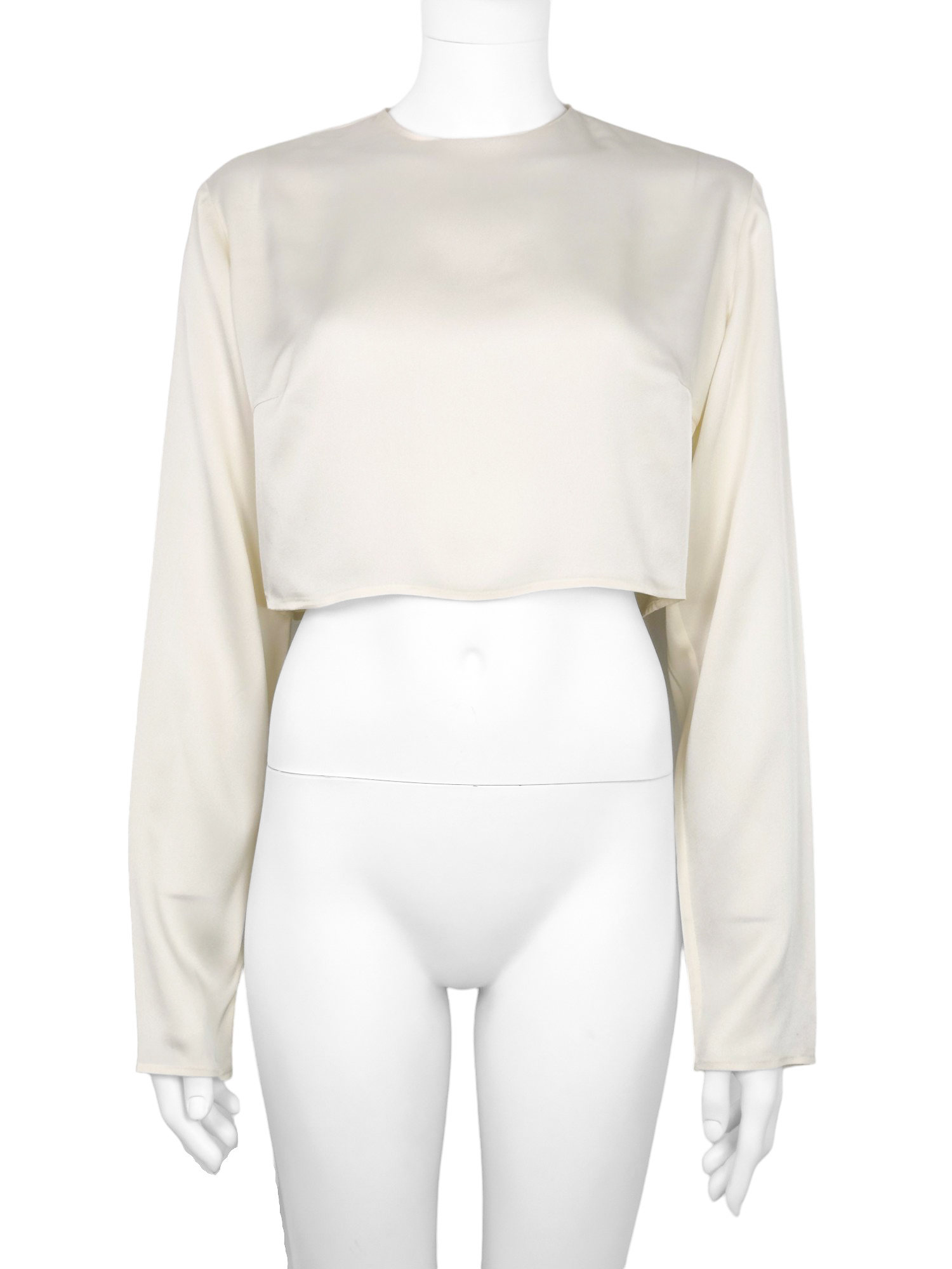 "Jedwabna kremowa krótka bluzka z długim rękawem, prosty krój, zapinane wycięcie w kształcie łezki na plechach, zaokrąglony dekolt. Rozmiar z metki 34. Skład: 100% jedwab. Wymiary: szerokość mierzona od pachy do pachy 53cm, długość całkowita 42cm."