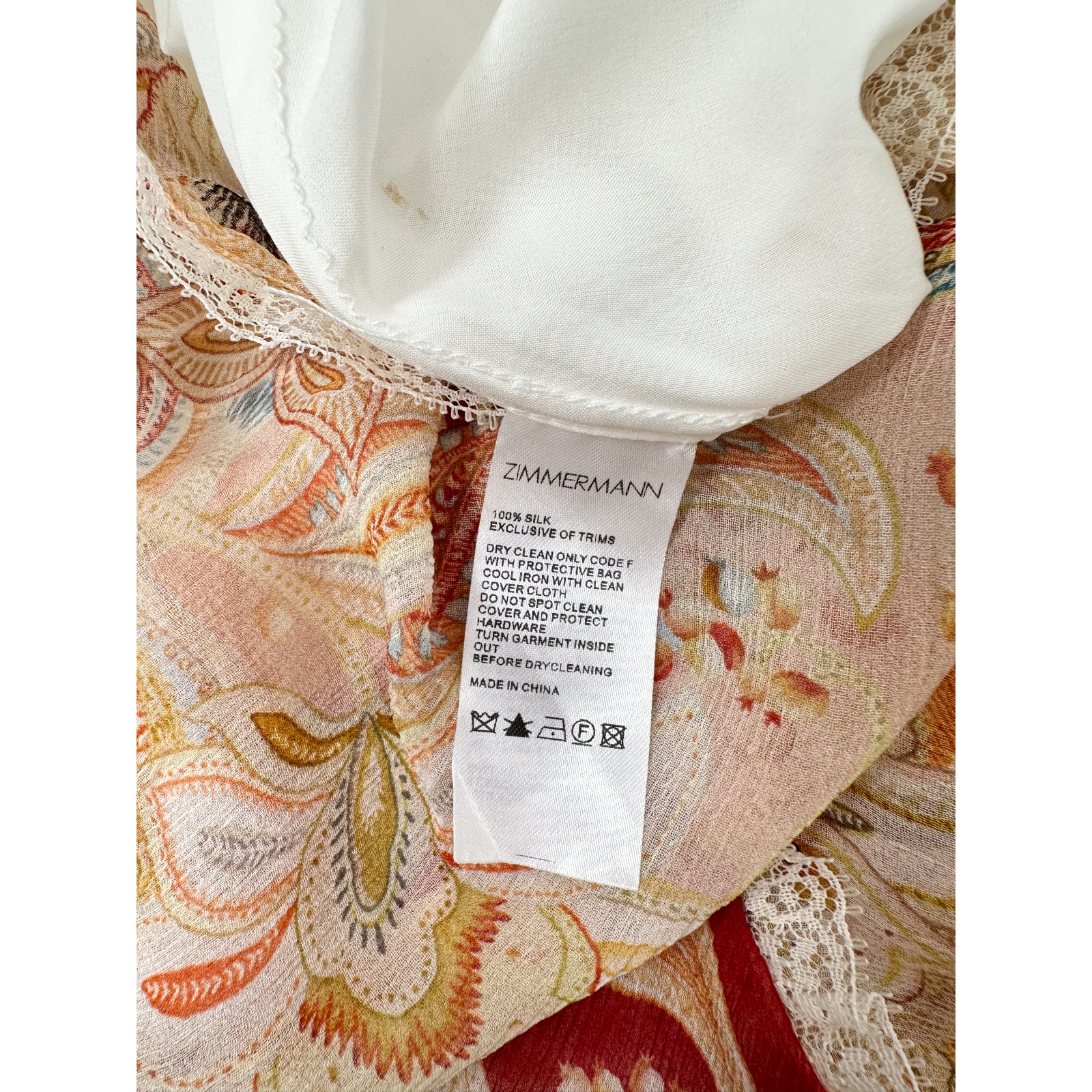 "Wielobarwna jedwabna spódnica w motyw kwiatowy wykończona białą koronką, taliowana, długość maxi, rozkloszowany, asymetryczny dół z falbaną, zapinana w tylnej części na kryty suwak, biała podszewka. Rozmiar z metki 1. Skład: 100% jedwab. Wymiary: długość całkowita 102cm, szerokość w pasie 35cm."
