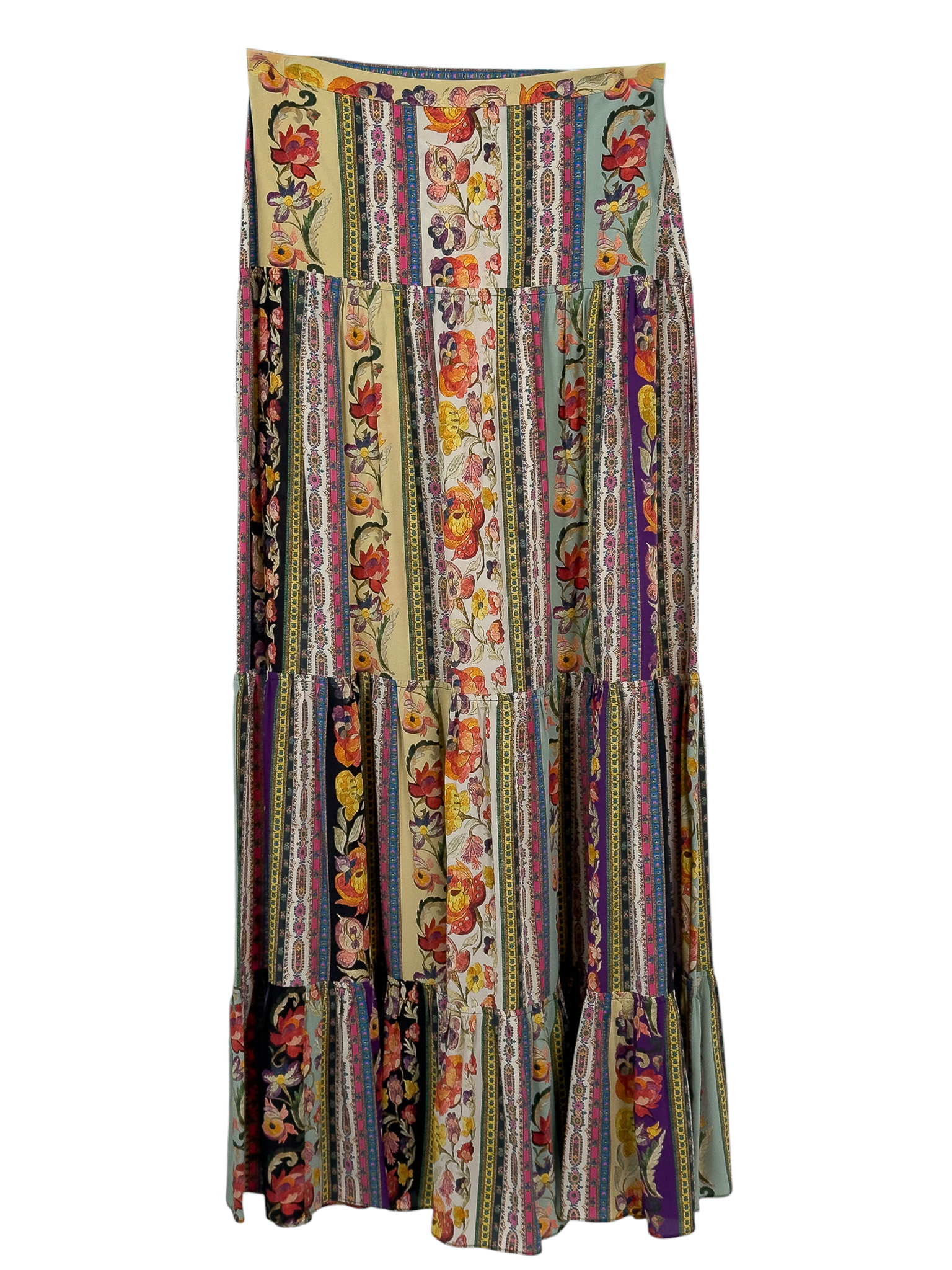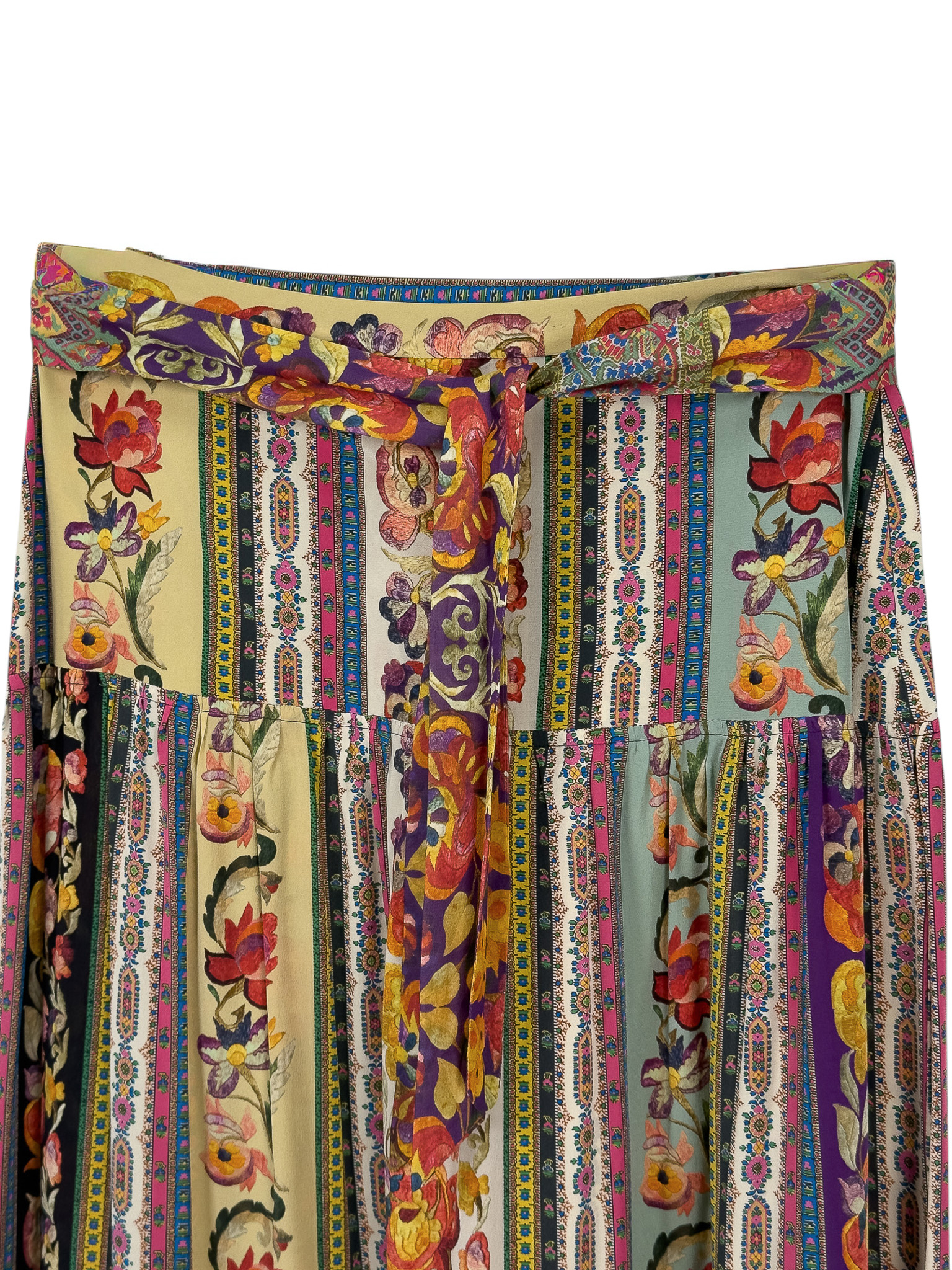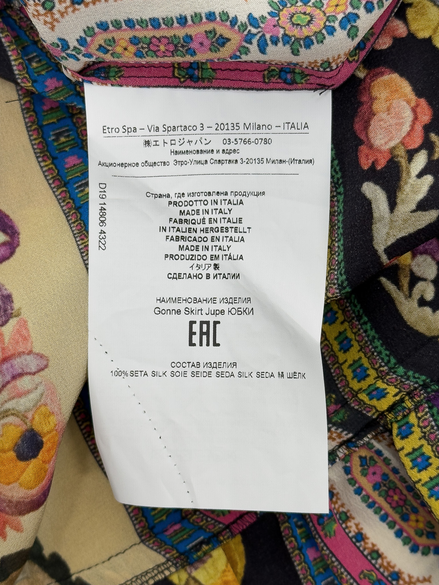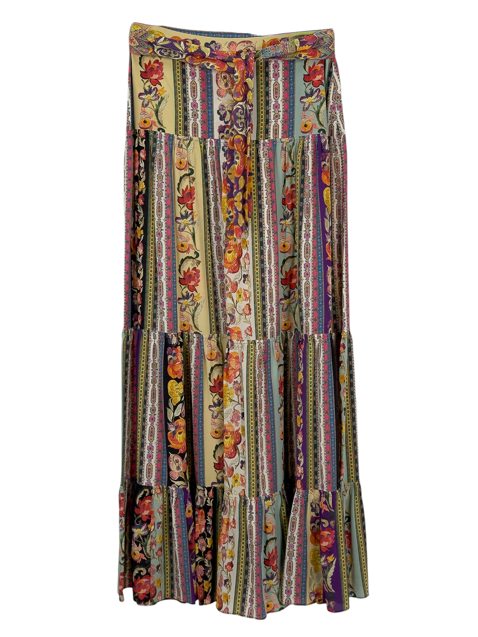 "Wielobarwna jedwabna spódnica ozdobiona wzorami kwiatów, długość maxi, rozkloszowany krój, wiązany pasek w pasie, zapinana w bocznej części na kryty suwak oraz haftkę. Stan bardzo dobry. Rozmiar z metki IT 46. Skład: 100% jedwab. Wymiary: szerokość w pasie 40cm, długość całkowita 114cm."