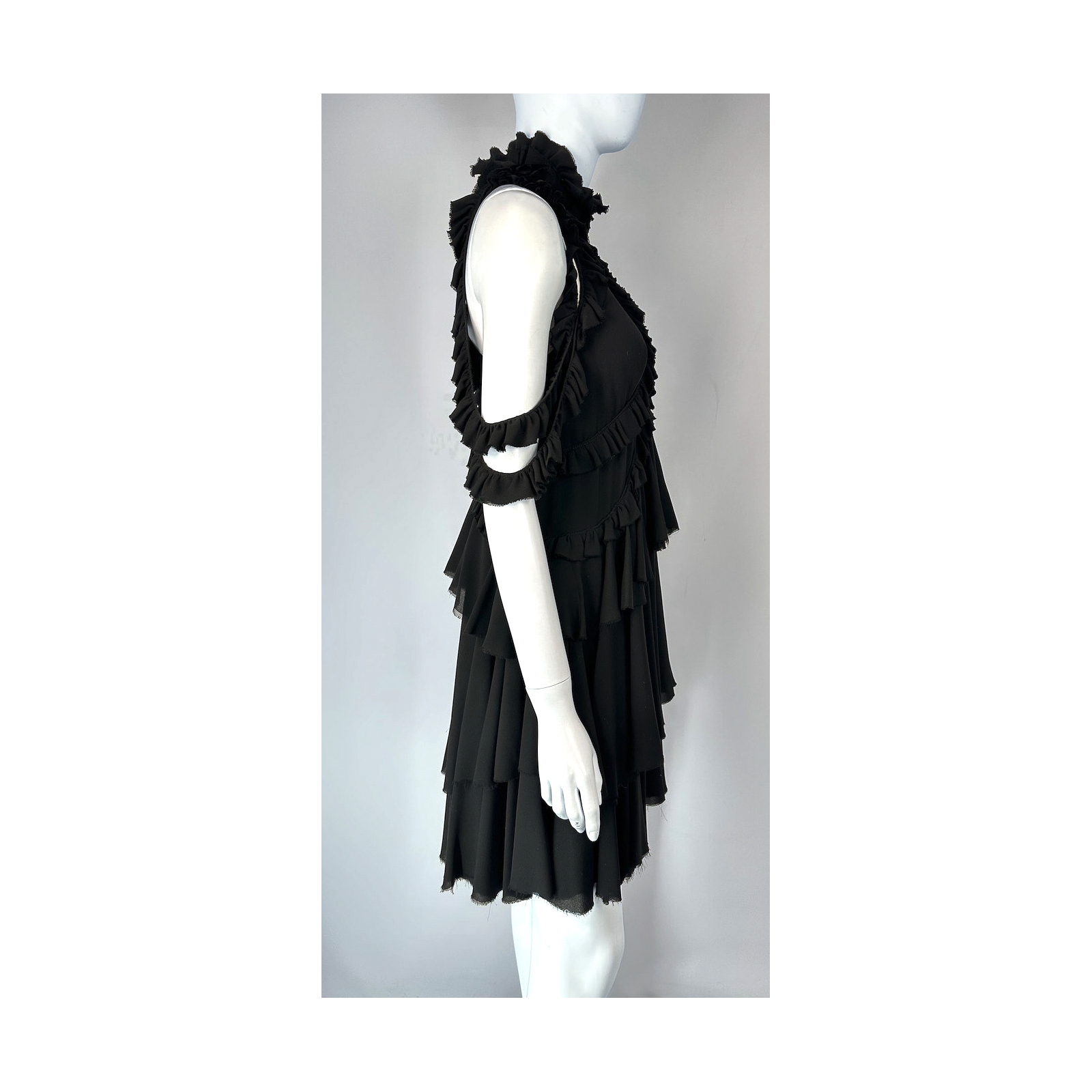 "Czarna jedwabna sukienka ozdobiona falbanami, bez rękawów, regulowany dekolt w serek, zapinany na guziki z pętelkami, cztery dekoracyjne paski z falbanami na ramiona, rozkloszowany dół, zapinana z tyłu na kryty suwak, haftkę oraz guzik z pętelką. Rozmiar z metki IT 38. Skład: 100% jedwab. Wymiary: szerokość mierzona od pachy do pachy 42cm, długość całkowita 89cm."
