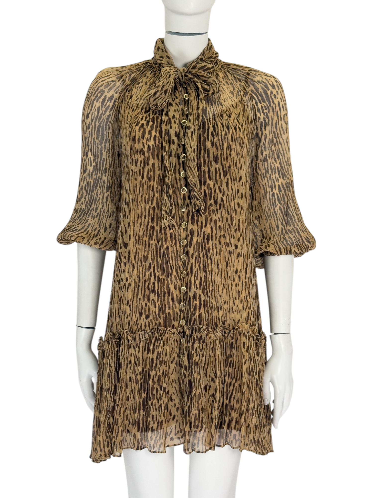 "Brązowa jedwabna sukienka w print pantery, długość do kolan, zapinana w centralnej części na złote guziki, wiązana w okolicy dekoltu, bufiaste rękawy, mankiety wykończone gumą, w zestawie z halką na ramiączkach. Rozmiar z metki 0. Skład: 100% jedwab; halka: 90% poliester, 10% elastan. Wymiary: szerokość mierzona od pachy do pachy 52cm, długość całkowita 90cm."