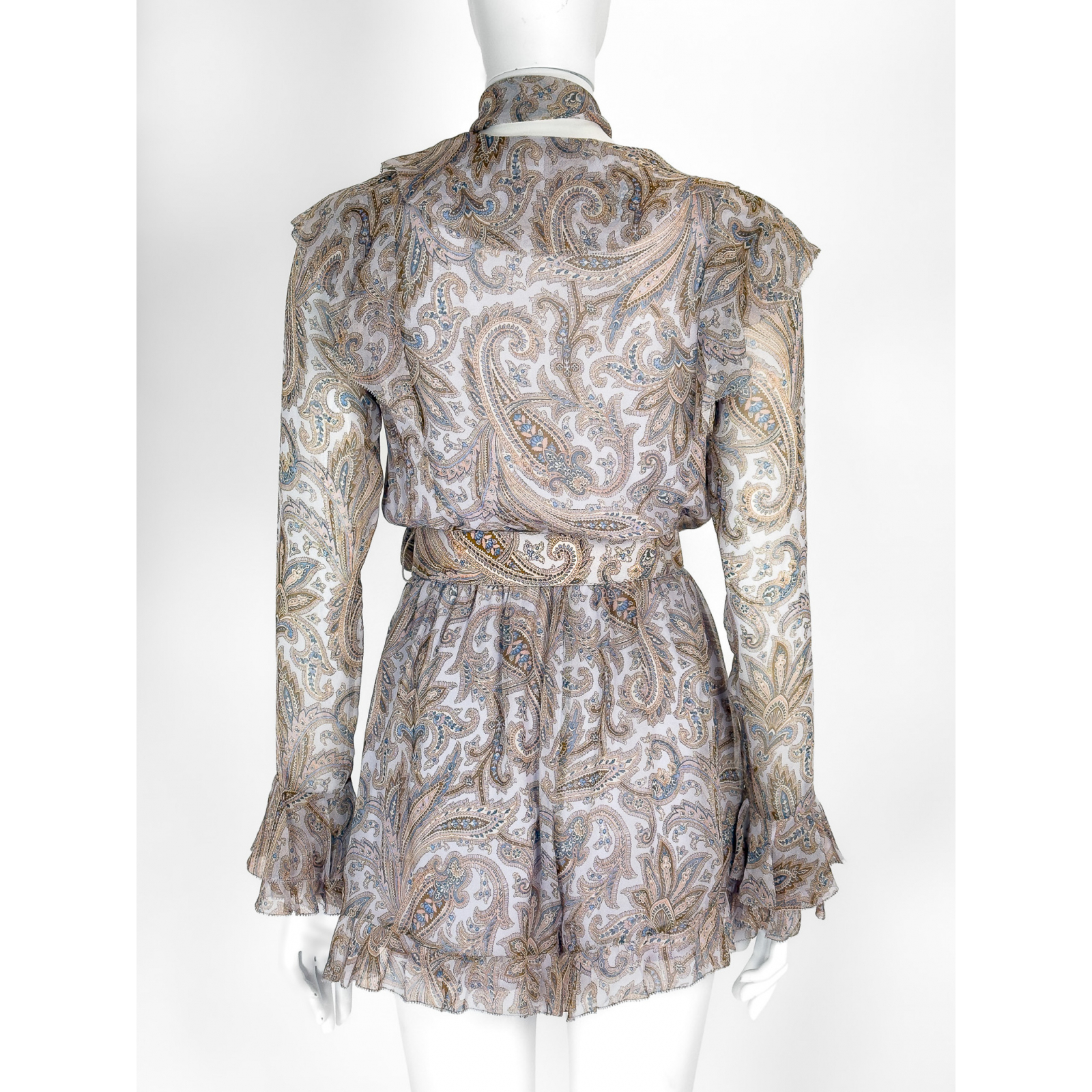 "Szara jedwabna sukienka ozdobiona wielobarwnym wzorem w odcieniach granatu, brązu oraz beżu, długość do kolan, zapinana w centralnej części na guziki, taliowana, guma oraz regulowany pasek w talii, transparentne rękawy, dekolt w serek, mankiety oraz dekolt wykończone falbanami, w zestawie z jedwabnym paskiem. Rozmiar z metki 0. Skład: 100% jedwab; podszewka: 100% wiskoza. Wymiary: szerokość mierzona od pachy do pachy 43cm, długość całkowita 79cm."
