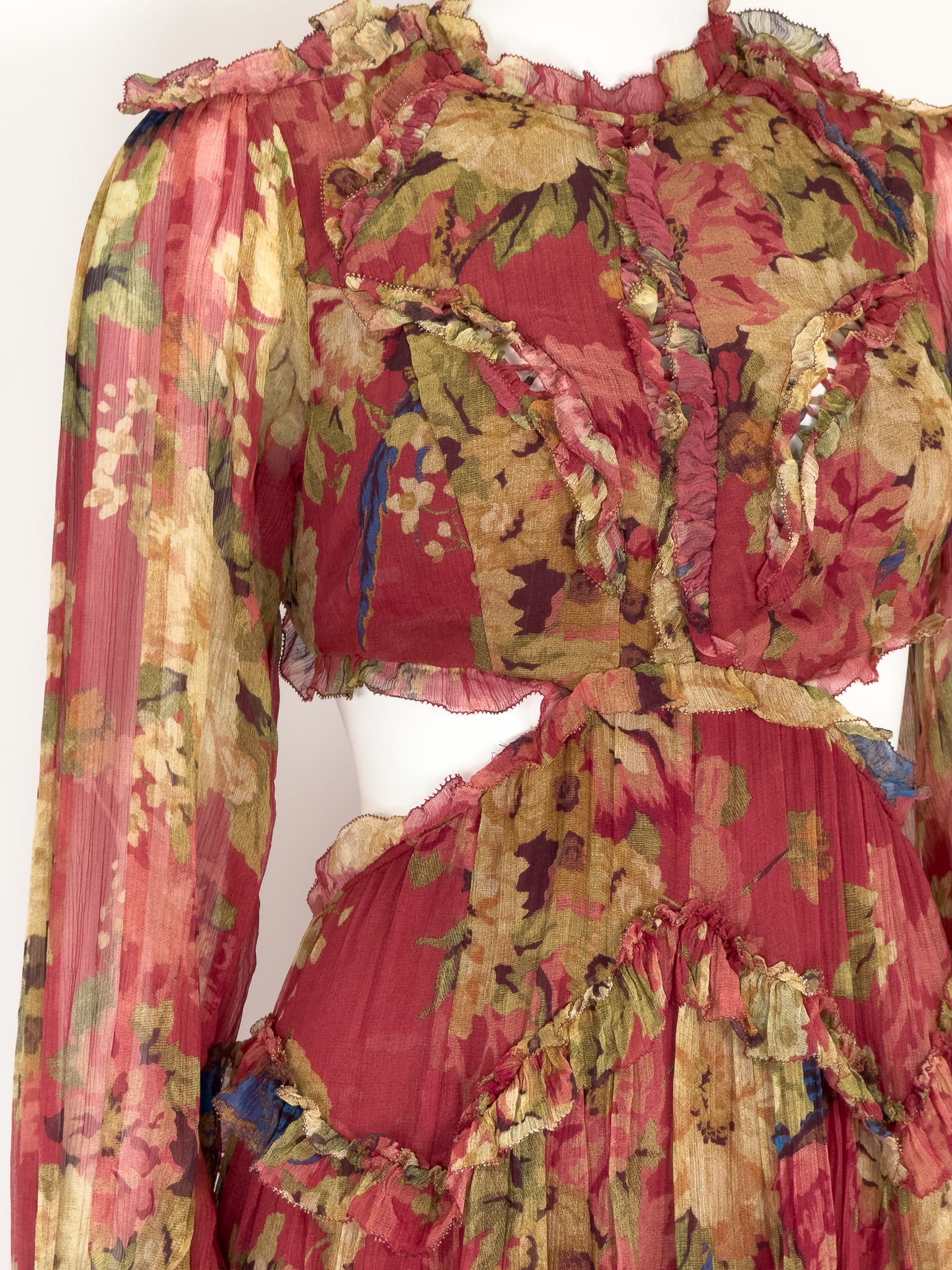 "Różowa jedwabna sukienka w motyw różowo-beżowo-niebieskich kwiatów, ozdobiona falbanami, długość przed kolano, wycięcie oraz wiązanie na plecach, zapinana na dwa guziki oraz suwak, półtransparentne rękawy wykończone gumą, różowa podszewka. Rozmiar z metki 2. Skład: 100% jedwab; podszewka: 100% wiskoza."