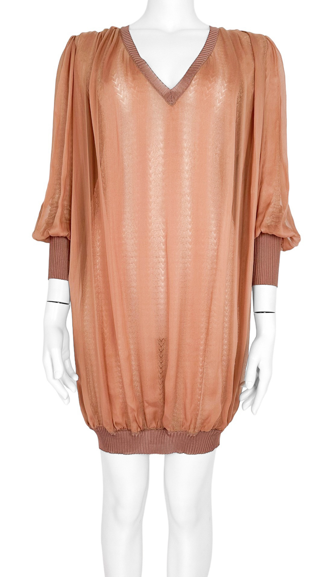 "Różowa/miedziana jedwabna tunika z długim rękawem, delikatnie transparentna, dekolt w szpic, mankiety, dół oraz dekolt wykończone prążkowanym ściągaczem, brokatowa podszewka. Skład: 45% jedwab, 35% kupro, 20% poliester. Rozmiar z metki 38. Wymiary: szerokość mierzona od pachy do pachy 52cm, długość całkowita 92cm."