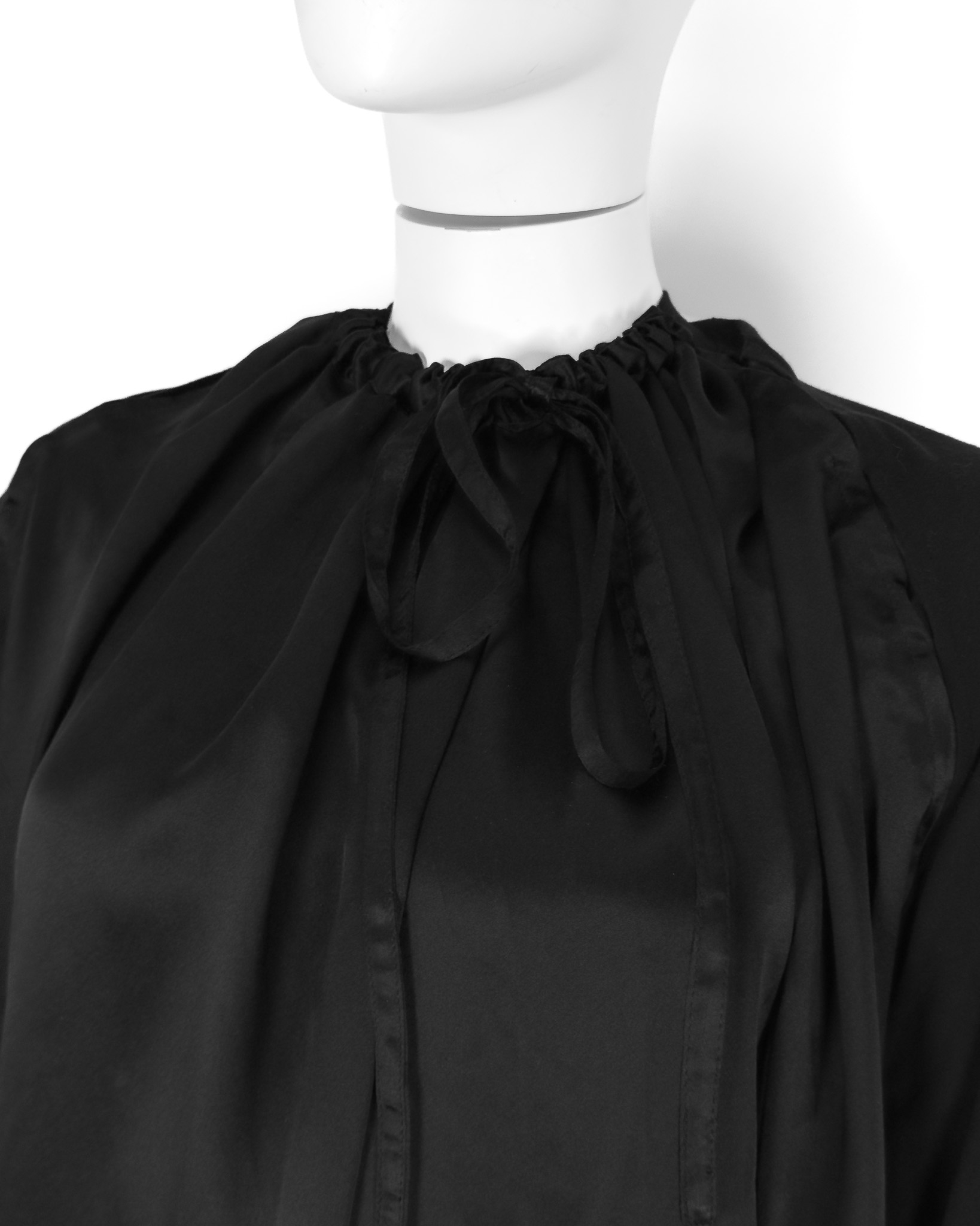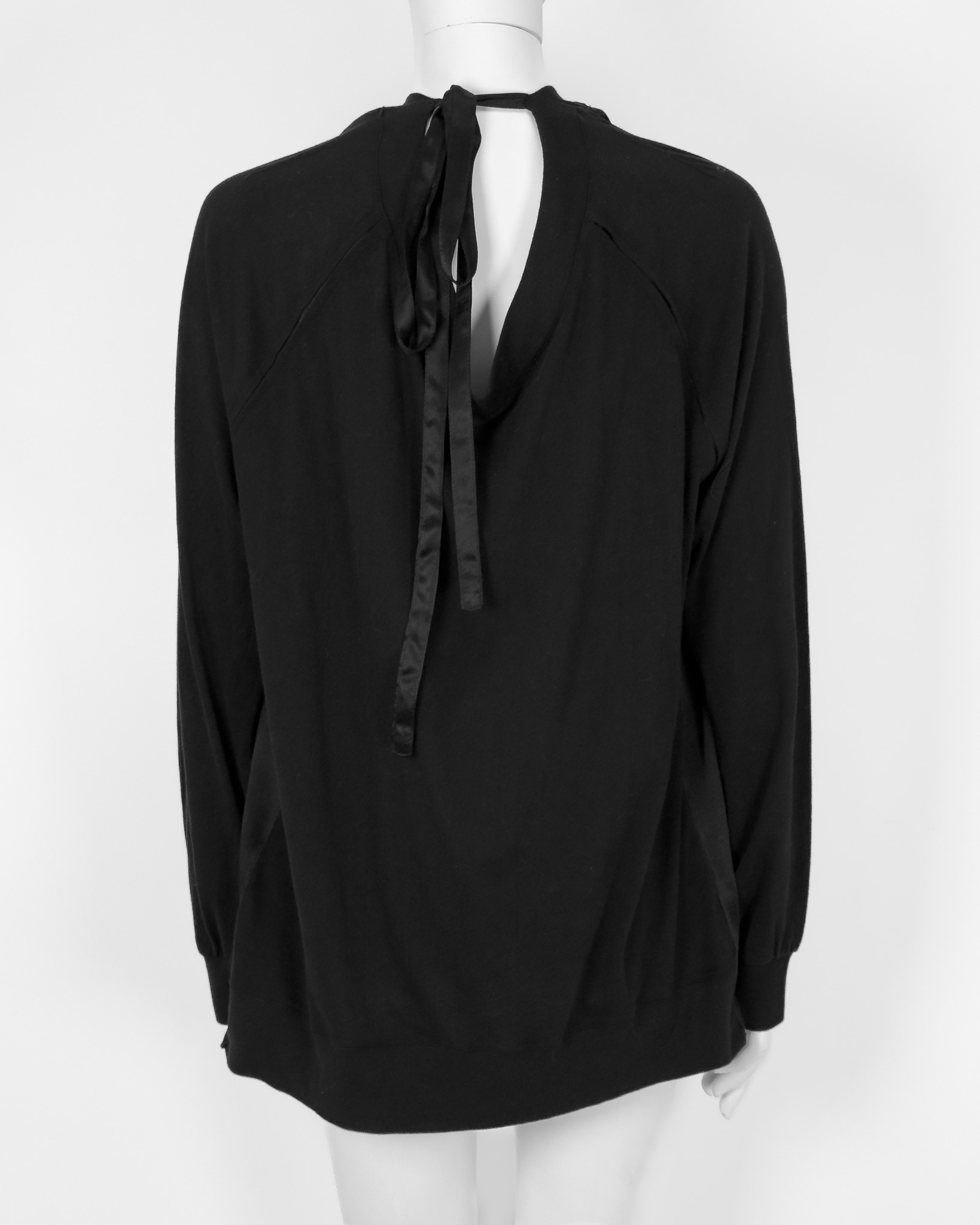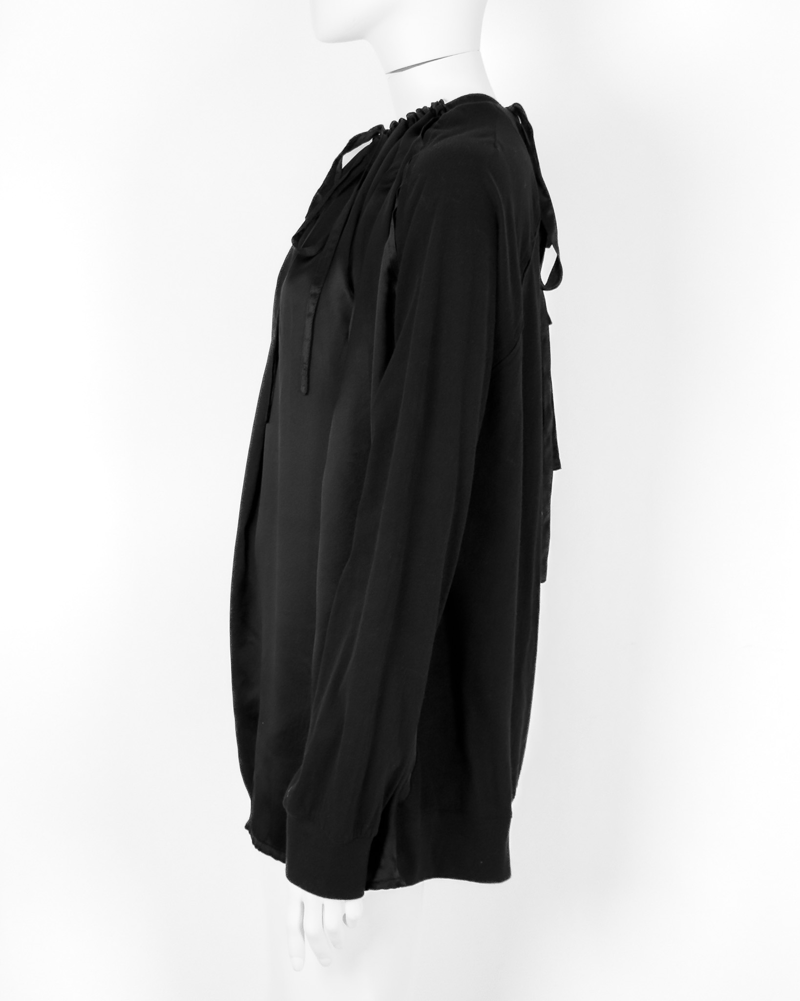 "Jedwabno-bawełniana czarna bluzka, ściągana przy dekolcie, lejący materiał, mankiety wykończone ściągaczem, wiązanie na plecach. Stan bardzo dobry. Rozmiar z metki 40. Skład: 100% jedwab + 100% bawełna. Wymiary: szerokość mierzona od pachy do pachy 73cm, długość całkowita 79cm."