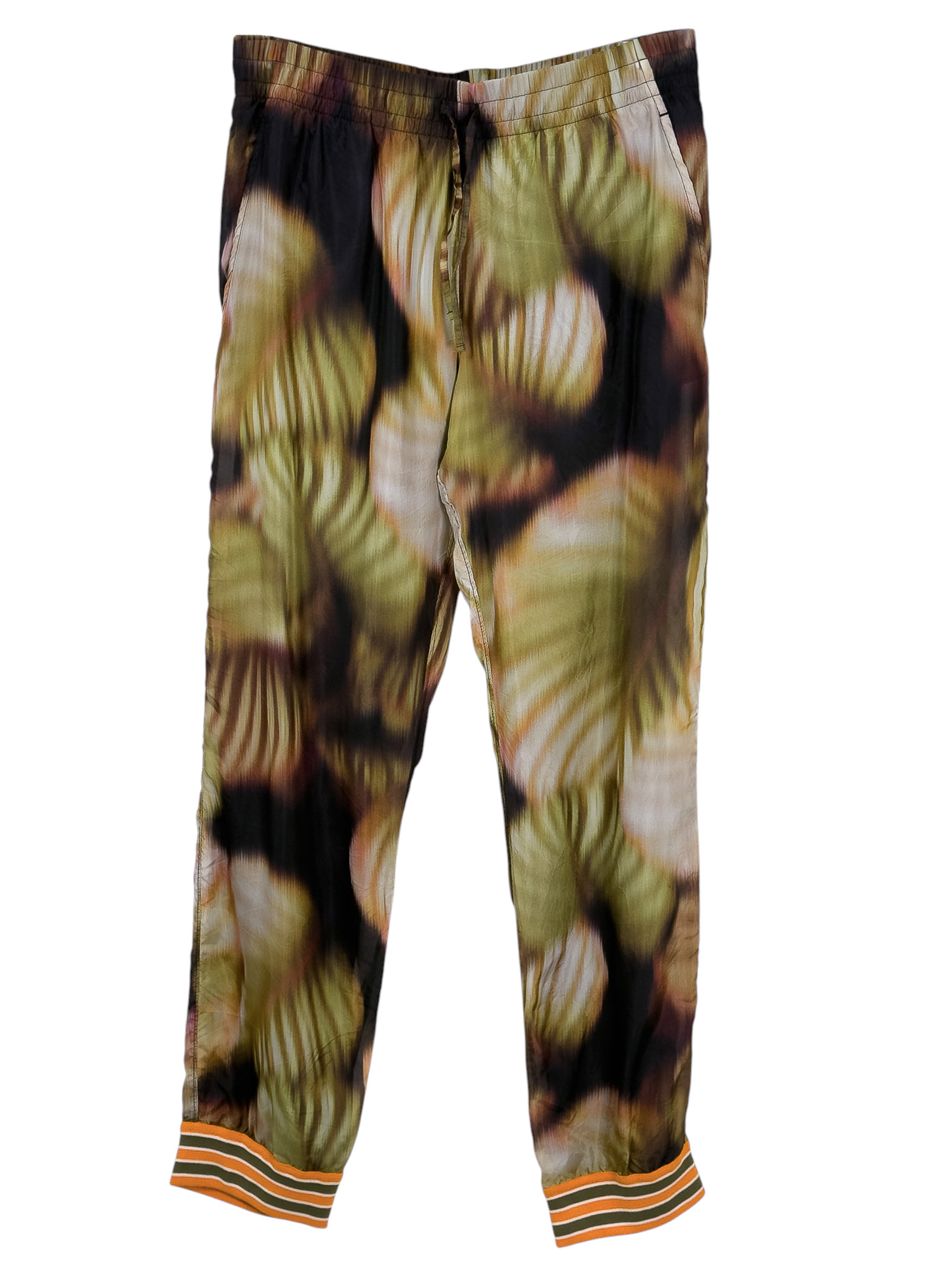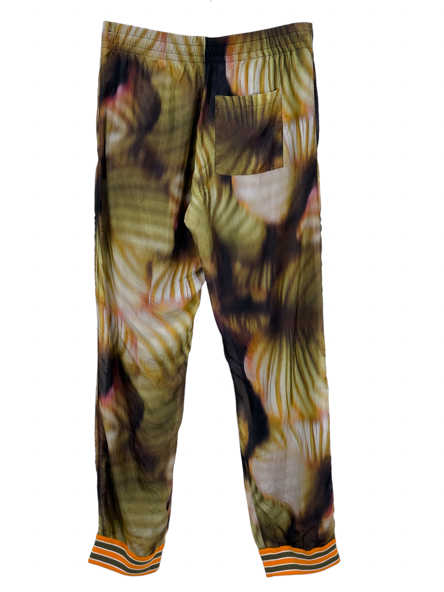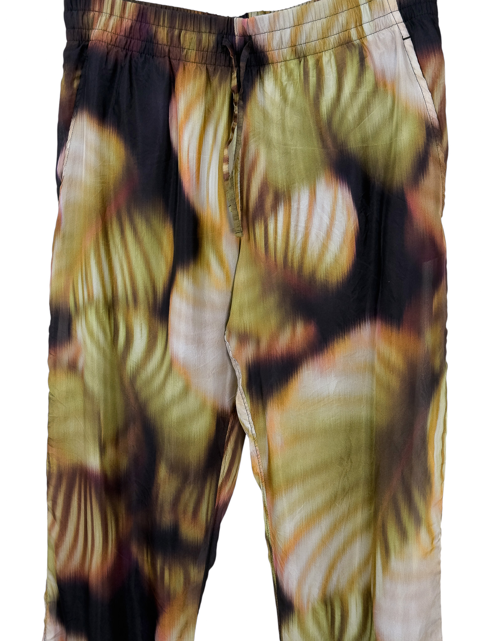 "Jedwabno-bawełniane wielobarwne spodnie w motyw delikatnych liści, nogawka wykończona zielono-pomarańczowym ścigaczem w prążek, dwie kryte kieszenie po bokach oraz jedna w tylnej części, guma oraz sznurek w pasie, wysoki stan. Stan nowe z metką. Rozmiar z metki L. Skład: 50% jedwab, 50% bawełna. Wymiary: szerokość w pasie 41cm, długość całkowita mierzona od zewnętrznej strony nogawki 108cm."