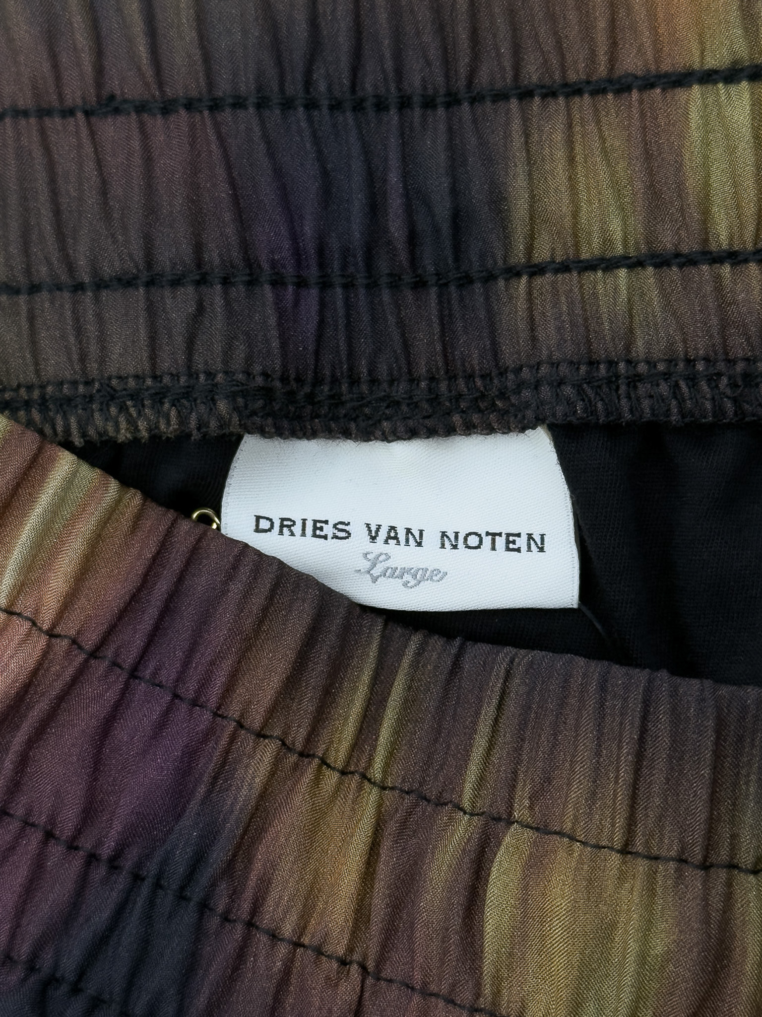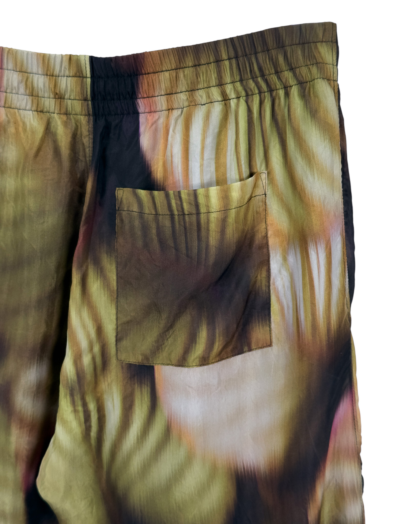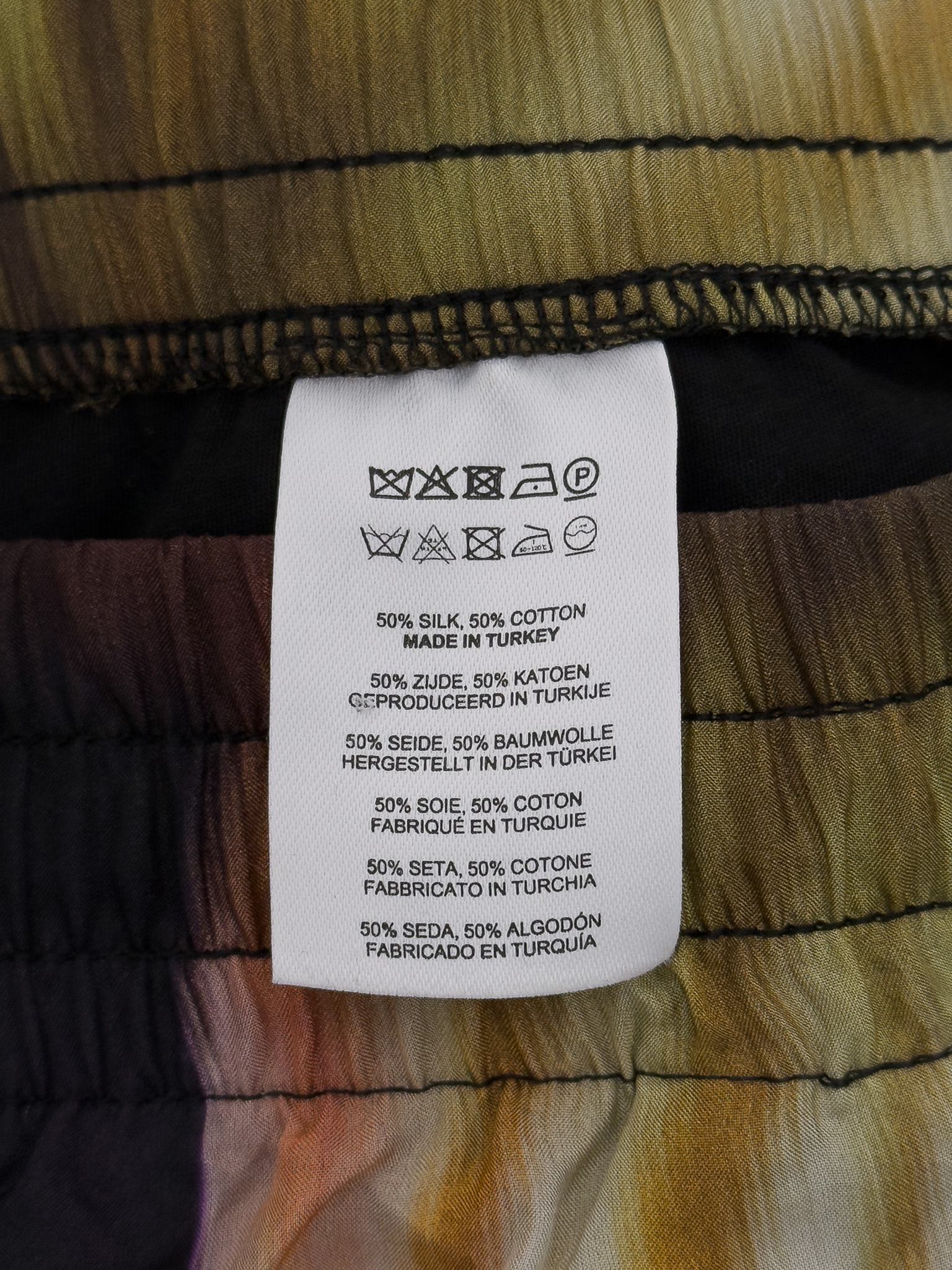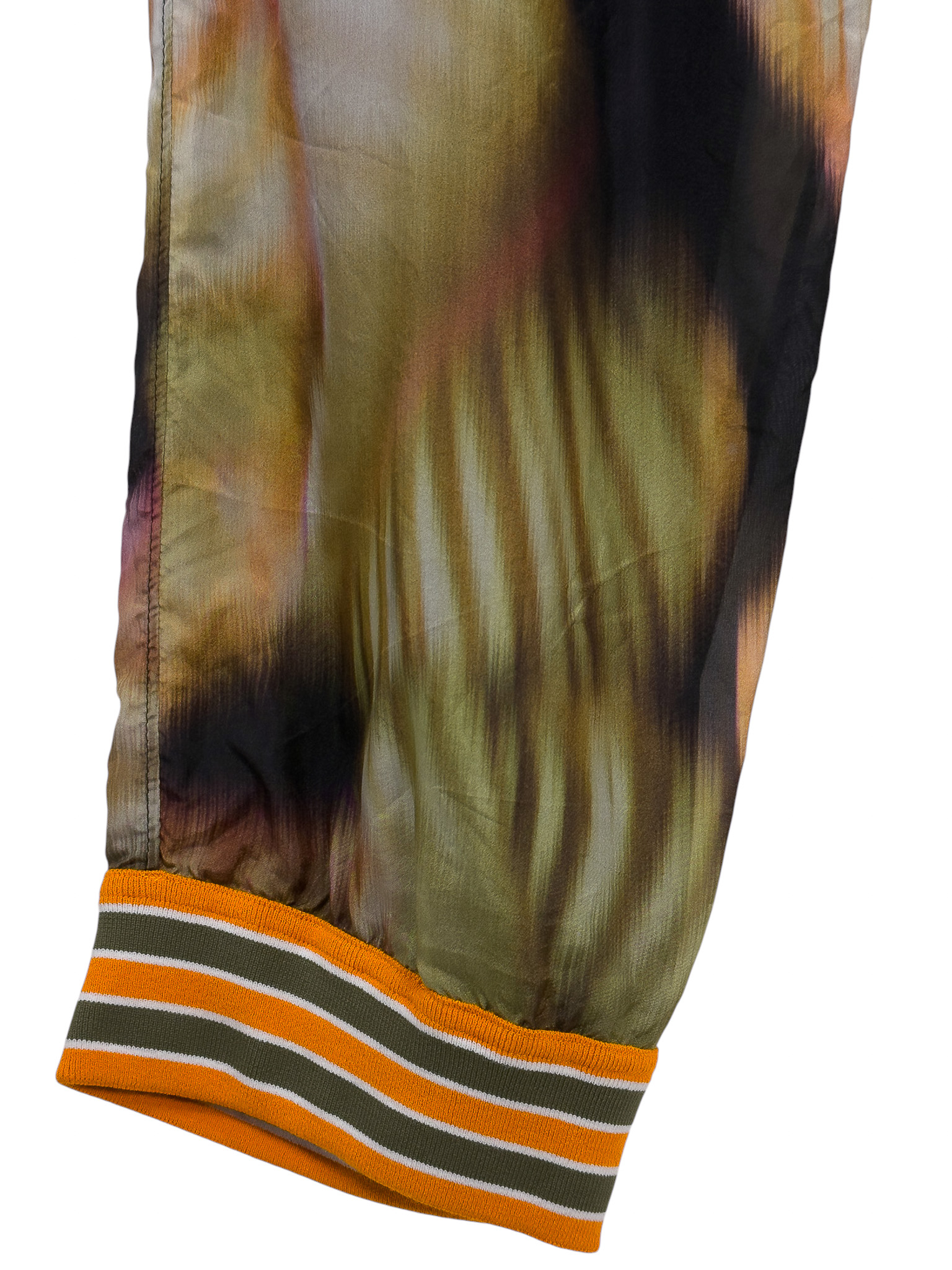 "Jedwabno-bawełniane wielobarwne spodnie w motyw delikatnych liści, nogawka wykończona zielono-pomarańczowym ścigaczem w prążek, dwie kryte kieszenie po bokach oraz jedna w tylnej części, guma oraz sznurek w pasie, wysoki stan. Stan nowe z metką. Rozmiar z metki L. Skład: 50% jedwab, 50% bawełna. Wymiary: szerokość w pasie 41cm, długość całkowita mierzona od zewnętrznej strony nogawki 108cm."
