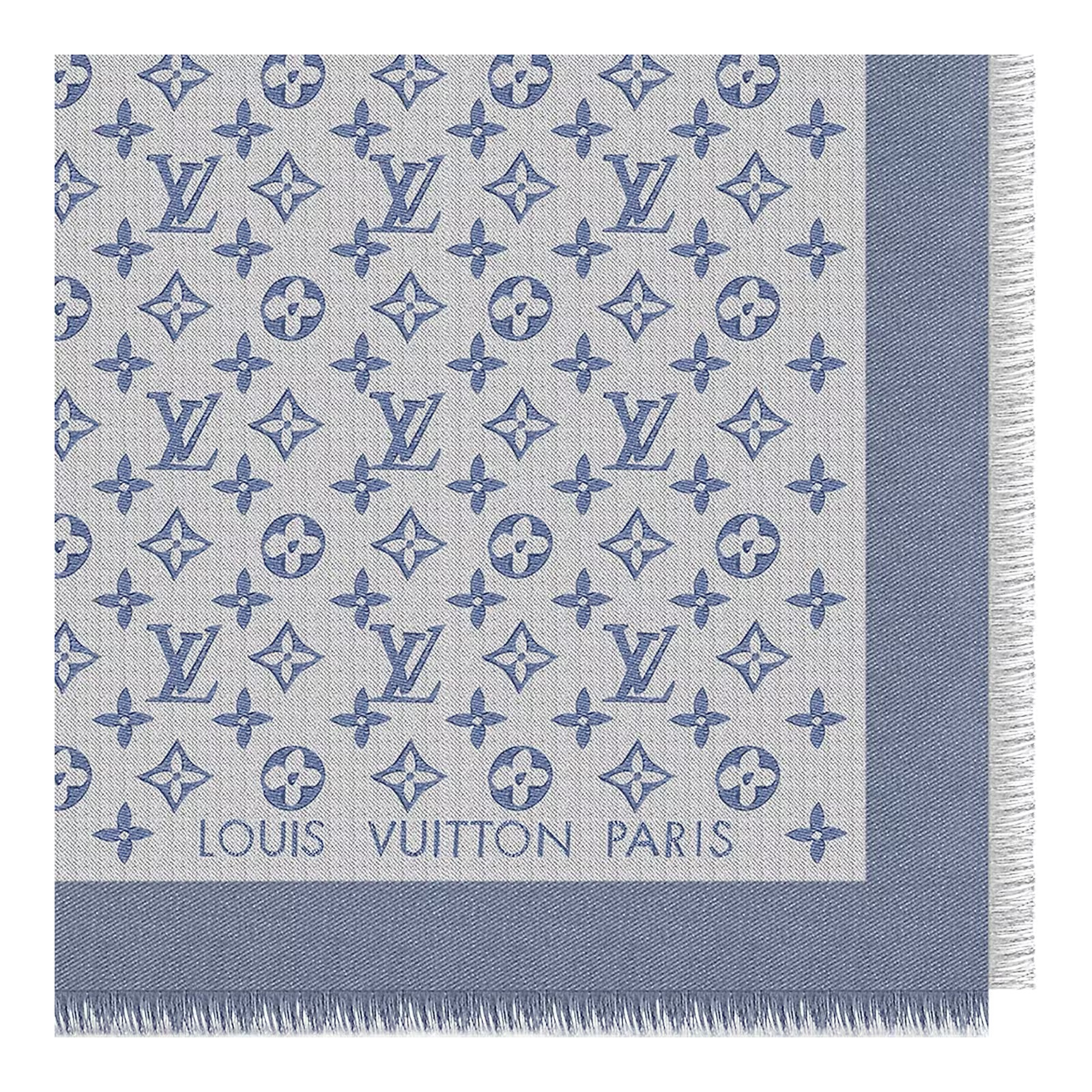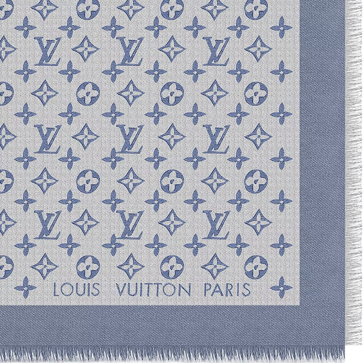 "Jedwabno-wełniana błękitna chusta z monogramem, wyszywana białą nicią w charakterystyczny monogram, brzegi wykończone drobnymi frędzlami, logo marki przy jednym rogu. Stan: nowy, bez pudełka. Skład: 60% jedwab, 40% wełna. Wymiary: 144cm x 142cm."
