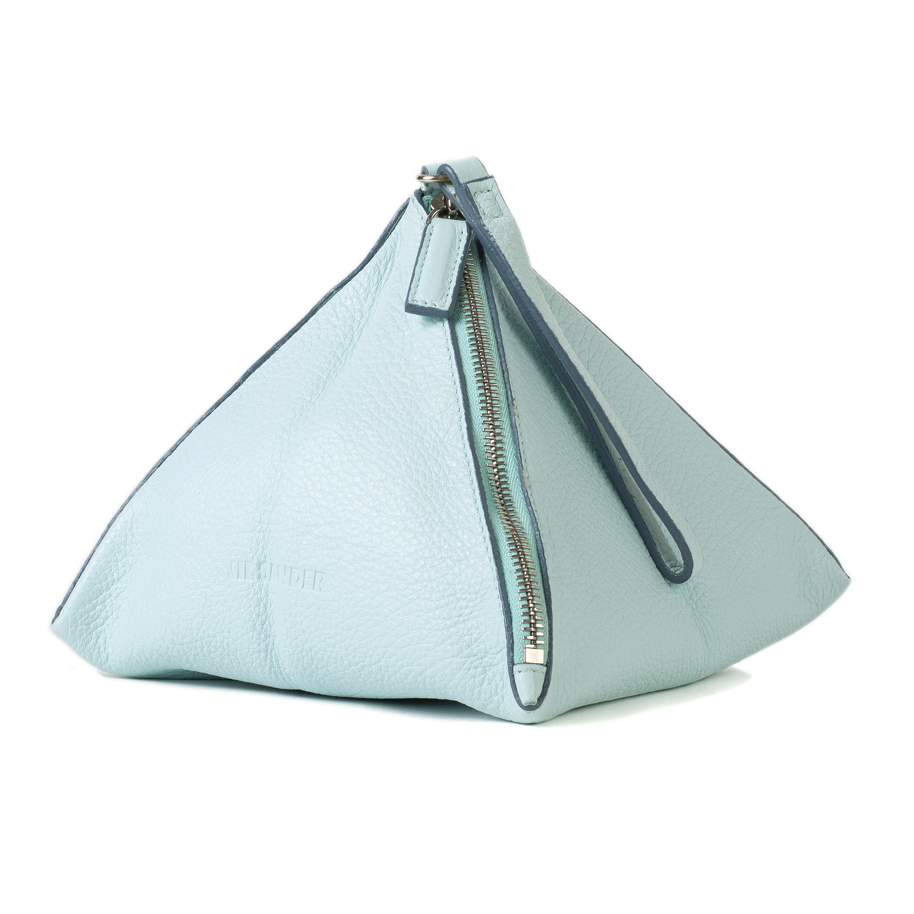 "mała, skórzana torebka w kształcie bryły. Zapinana na suwak. Logowanie na przodzie torebki. Delikatnie zdarta skóra przy suwaku."
