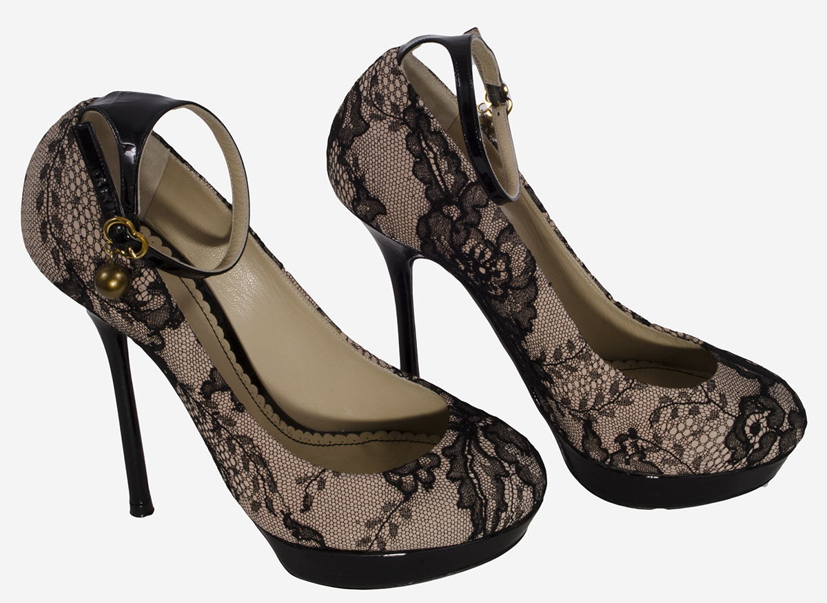 "John Galliano szpilki czarne koronkowe, z paskiem przy kostce, nowe, rozmiar 36."