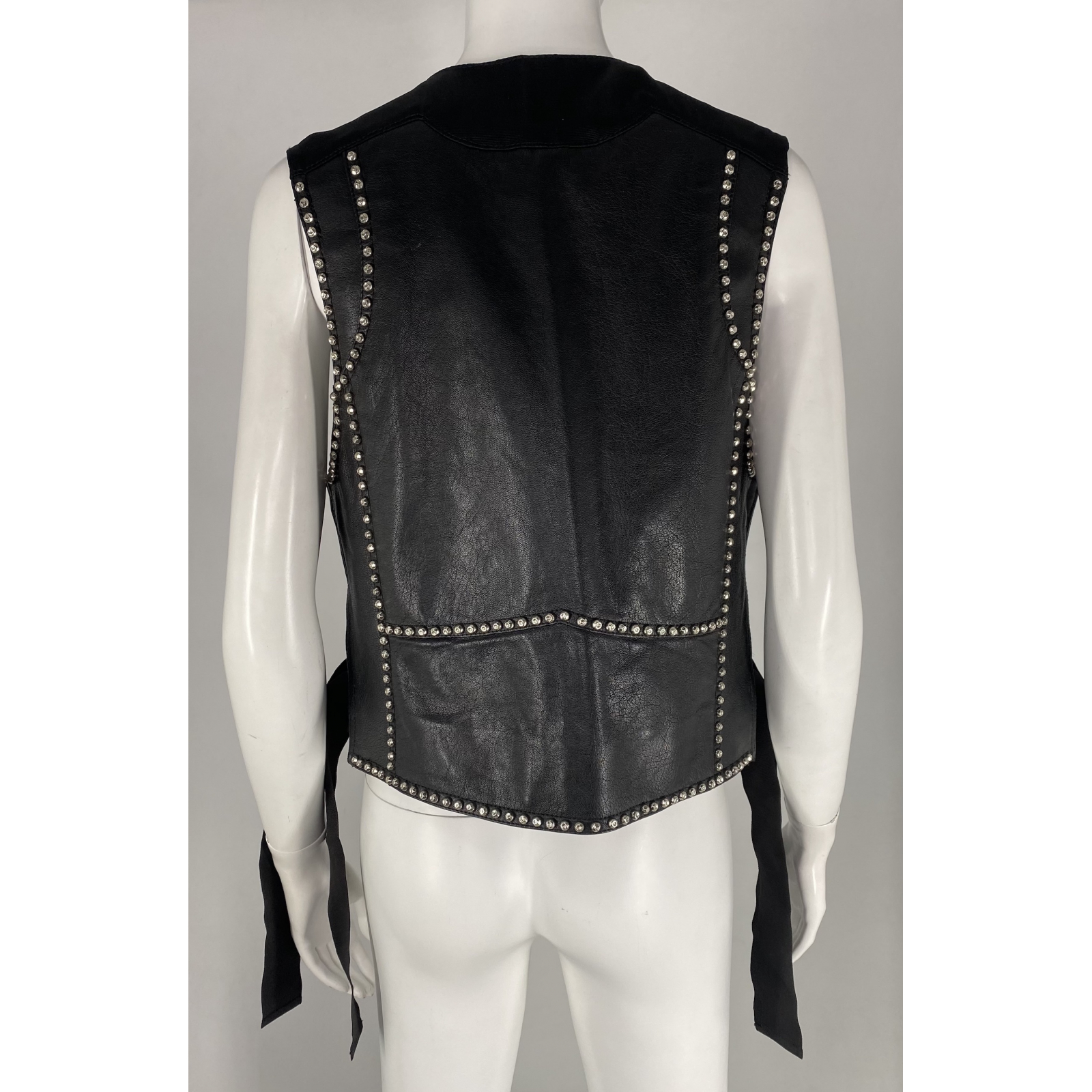 "skórzana kamizelka z srebrnymi nitami, zapinana na 5 guzików, z boku doszyty czarne taśmy. Długość 58 cm, szerokość biust 43 cm"