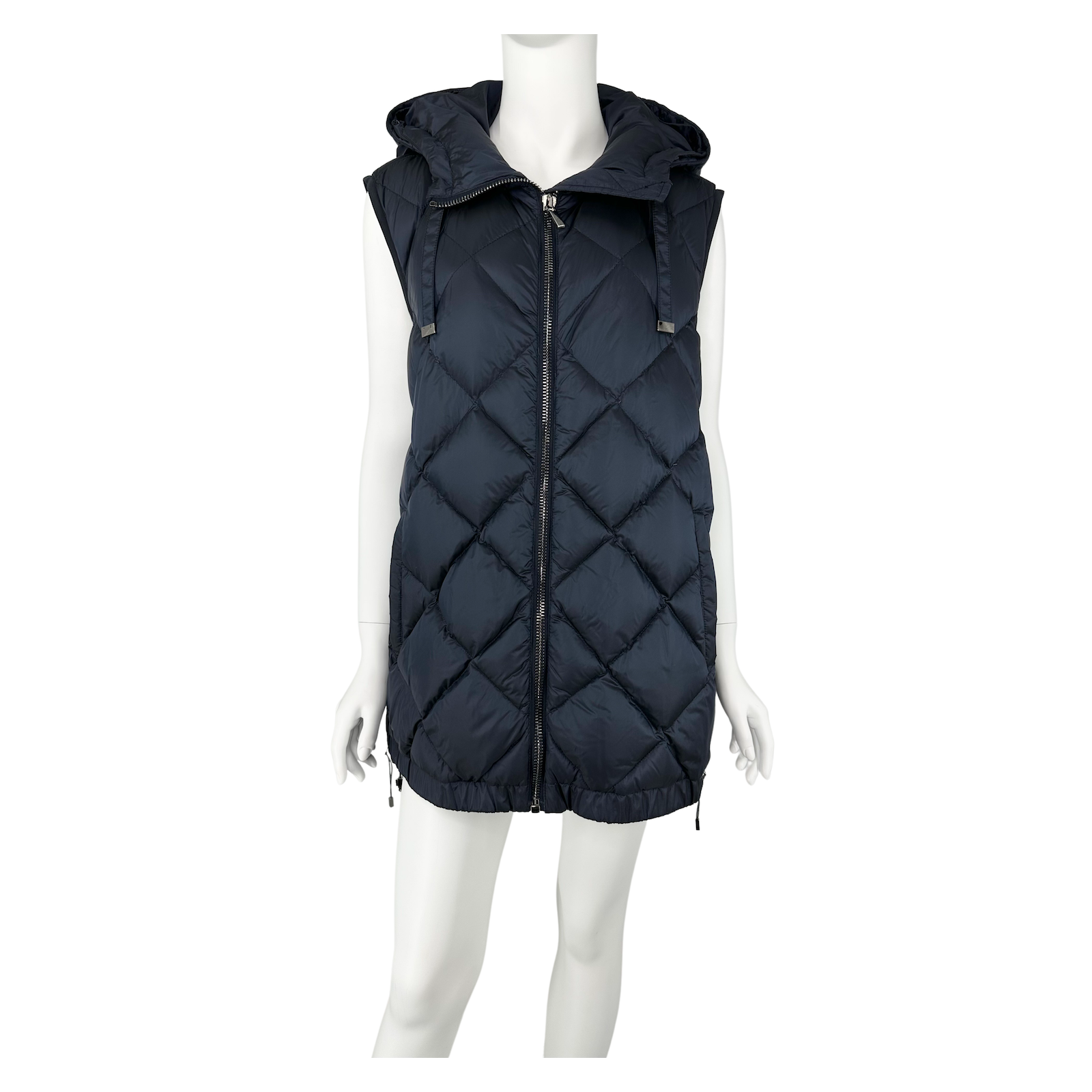 "granatowa pikowana kamizelka z kapturem, zapinana z przodu na srebrny suwak, ściągacz u dołu, zapinane suwaki po bokach. Rozmiar S. Skład: 100% poliamid. Wymiary: szer. ramion 43 cm, szer. biustu 50 cm, szer. talii 55 cm, dł. całkowita 73 cm."
