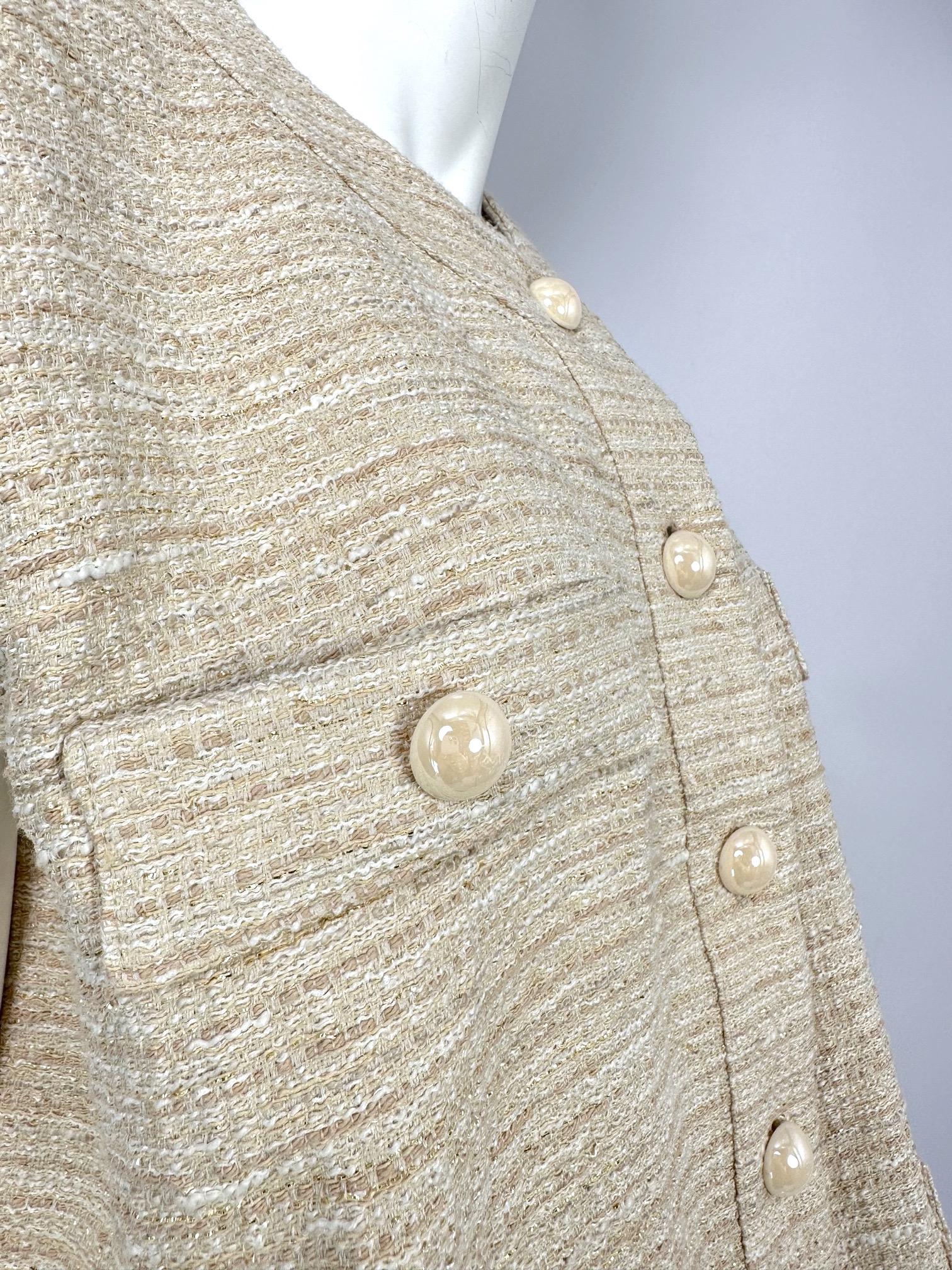"beżowa kamizelka zapinana z przodu, ozdobiona perłowymi guzikami, bez rękawów, oversize. Brak metki z rozmiarem i składem. Wymiary: szer. ramion 50 cm, szer. biustu 57 cm, szer. talii 58 cm, dł. całkowita 60 cm."