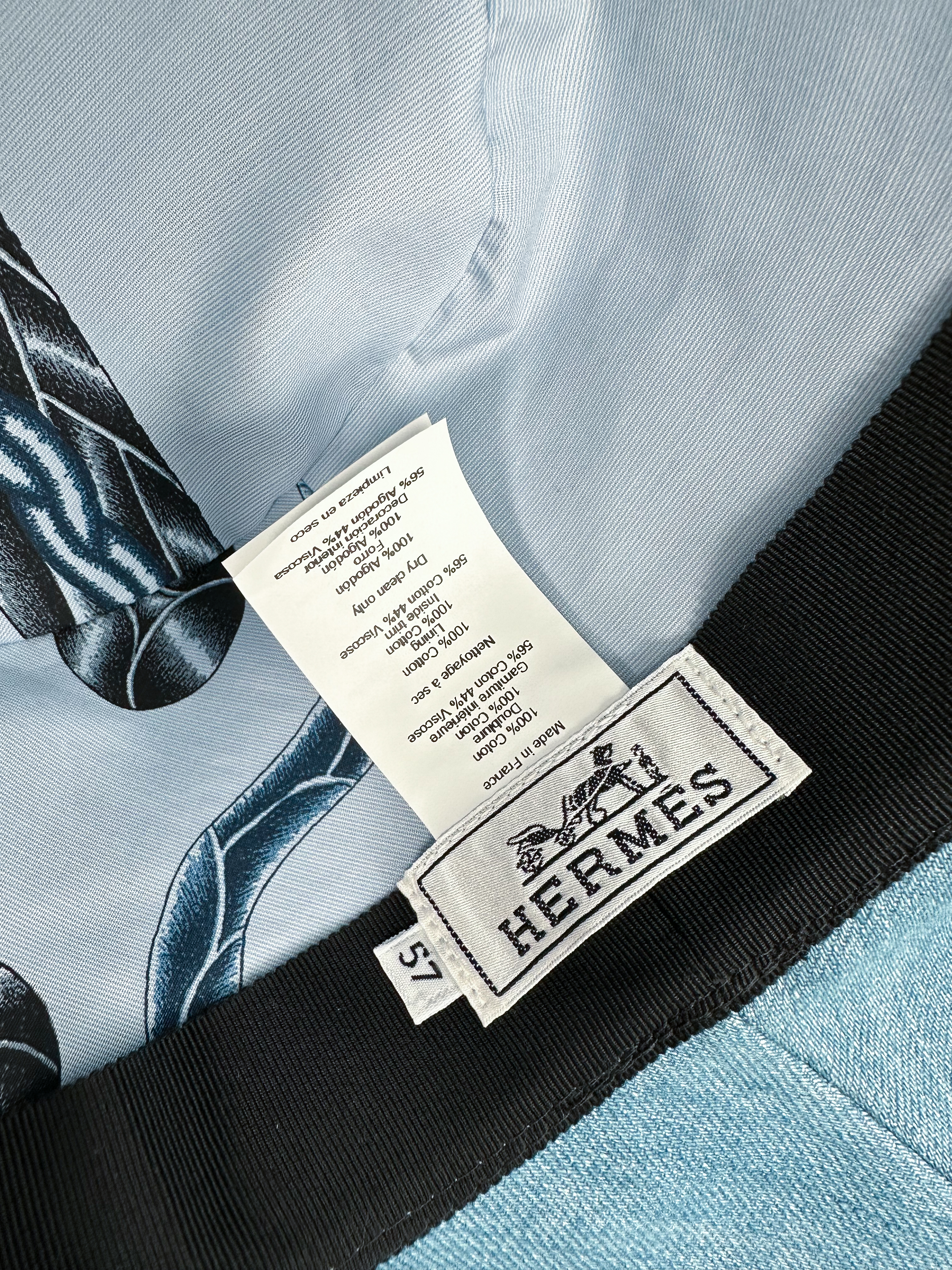 "Niebieski jeansowy kapelusz ozdobiony srebrnym medalikiem z logo marki, szerokie okrągłe rondo, płaska główka, częściowa błękitna podszewka ozdobiona grafiką. Rozmiar z metki 57. Skład: 100% bawełna."