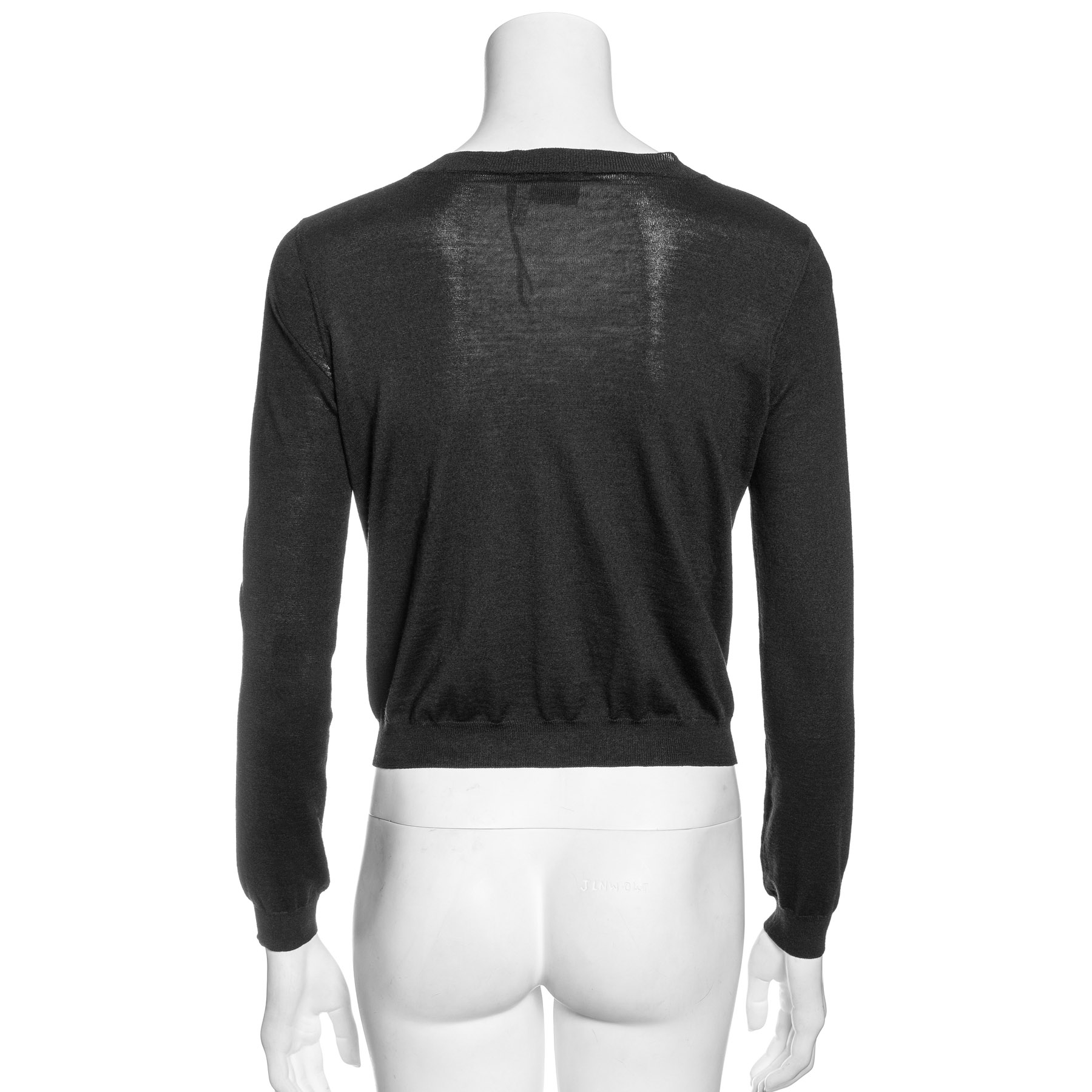 "Czarny krótki kardigan z długim rękawem, zapinany na zatrzaski, przód niezwykle efektowny dzięki naszytym ozdobnym kamykom, roz. XS, wymiary: ramiona 39 cm, biust 44 cm, dł. rękawa 59 cm, dł. całkowita 48 cm; skład: 100% wełna"
