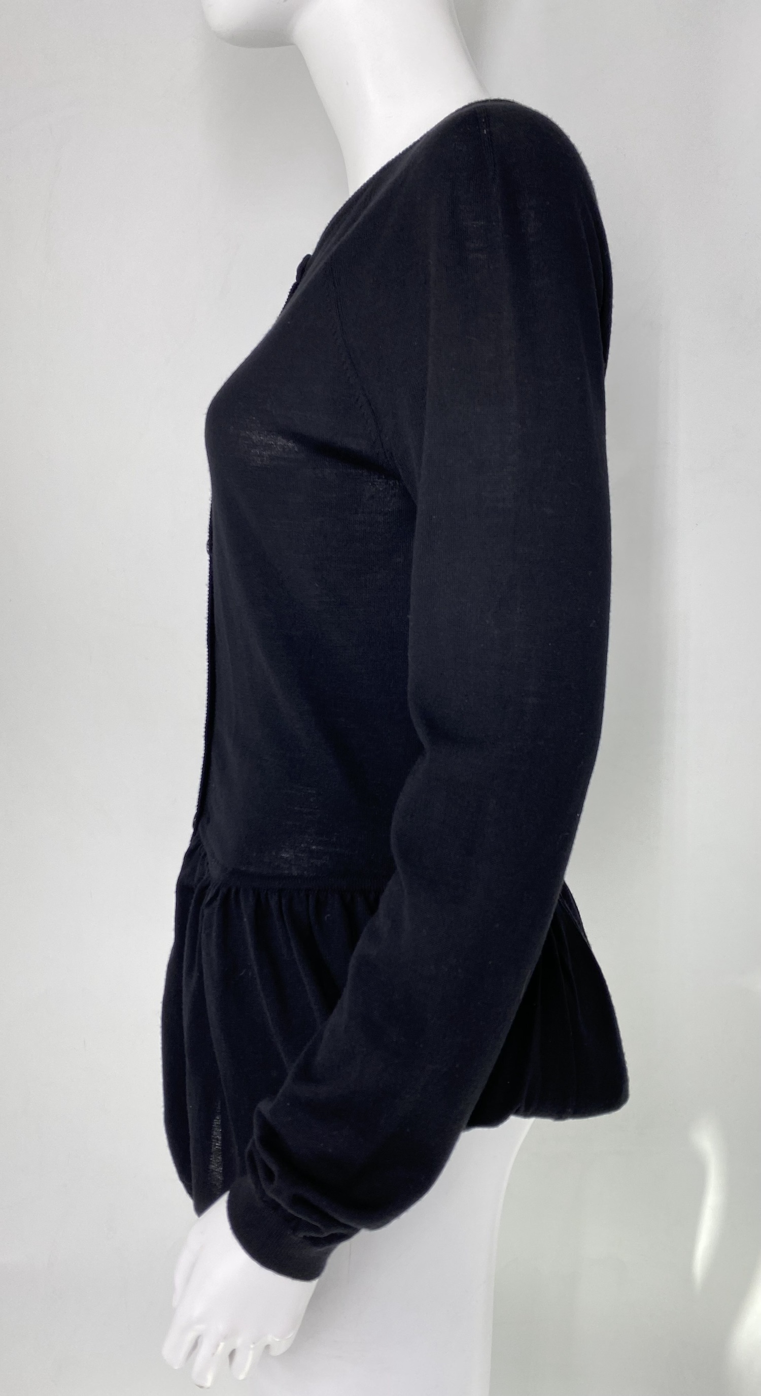 "czary kardigan zapinany na guziczki, długie rękawy, zakończony falbanką. Mocno zmechacony. Rozmiar 40. Skład 100% wełna. Wymiary: szer. biust 46 cm, dł. rękaw 63 cm, dł. całkowita 75 cm."