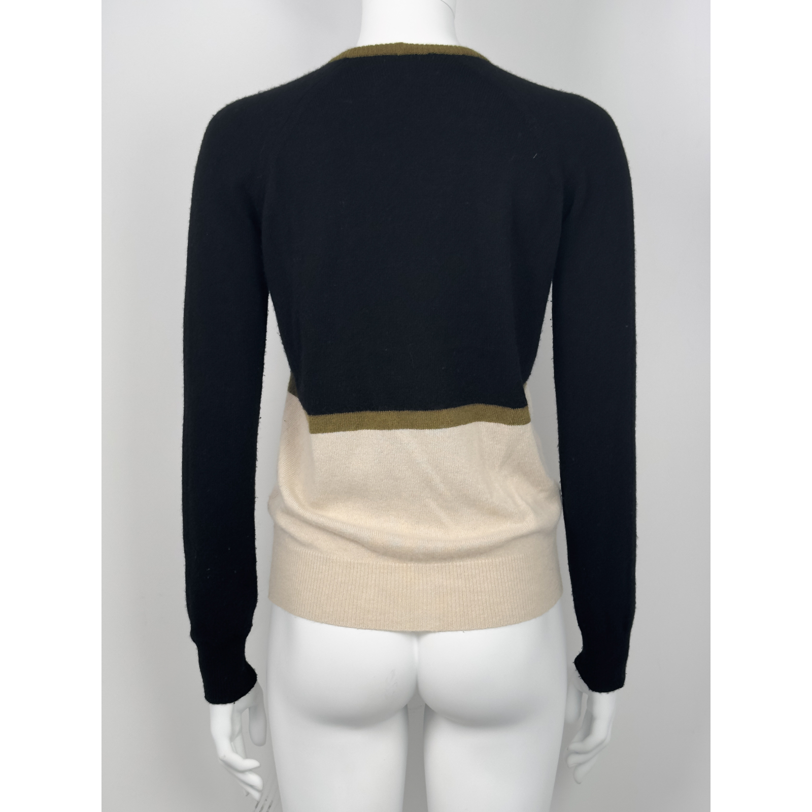 "Czarno-zielono-beżowy kardigan z domieszką kaszmiru oraz wełny w składzie, zapinany na brązowe logowane guziki, dekolt w serek, dopasowany krój, mankiety oraz dół wykończone prążkowanym ściągaczem. Rozmiar z metki IT 40. Skład: 30% kaszmir, 30% wiskoza, 20% wełna, 20% poliamid. Wymiary: szerokość mierzona od pachy do pachy 47cm, długość całkowita 58cm."