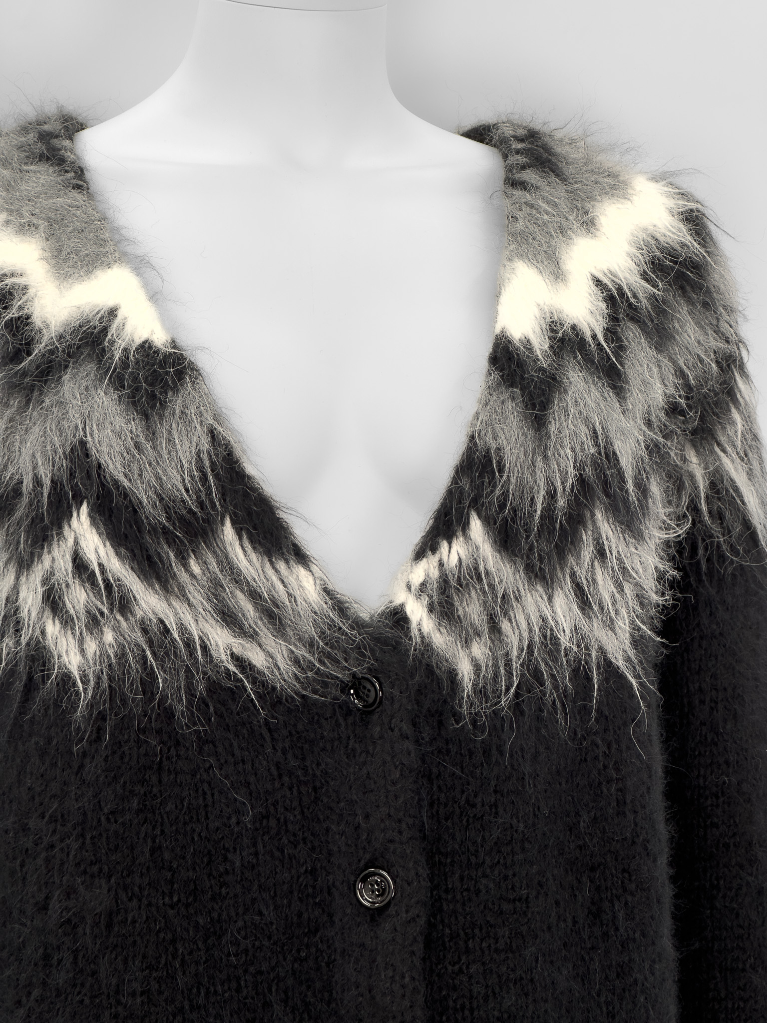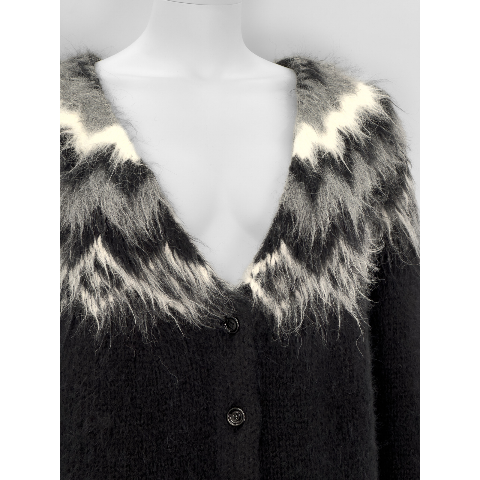 "Czarny kardigan ozdobiony biało-szarym futrzanym wzorem w okolicy dekoltu, prosty krój, dekolt w szpic, zapinany na czarne logowane guziki. Rozmiar z metki M. Skład: 74% alpaka, 22% wełna, 4% poliamid. Kolekcja 2019. Wymiary: szerokość mierzona od pachy do pachy 55cm, długość całkowita 66cm."