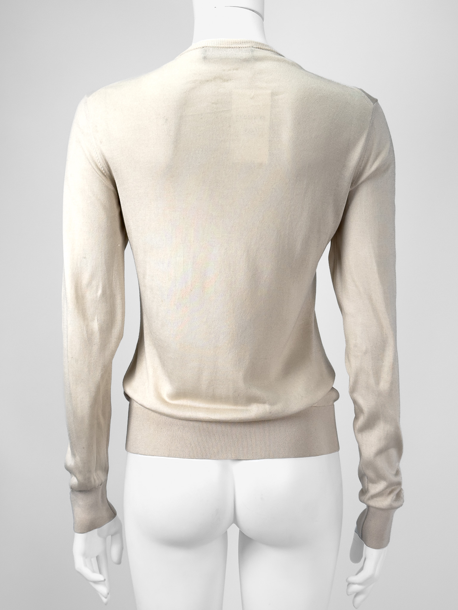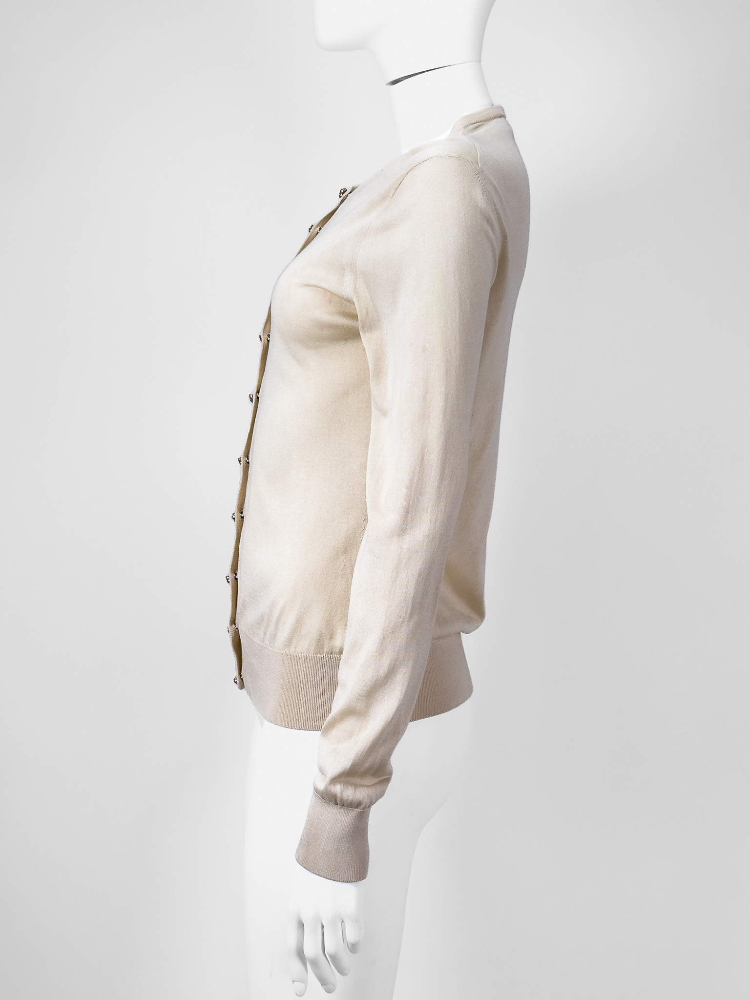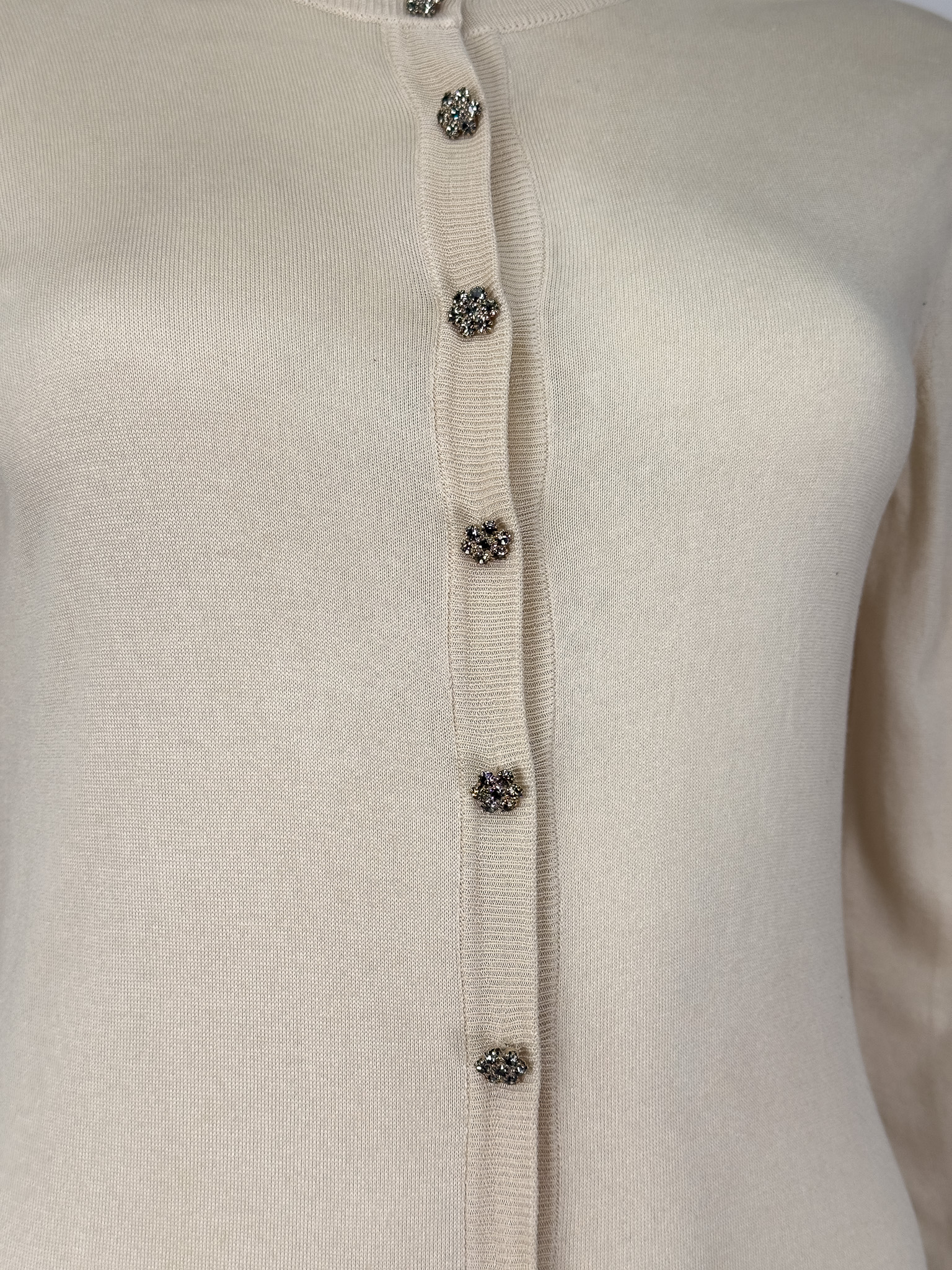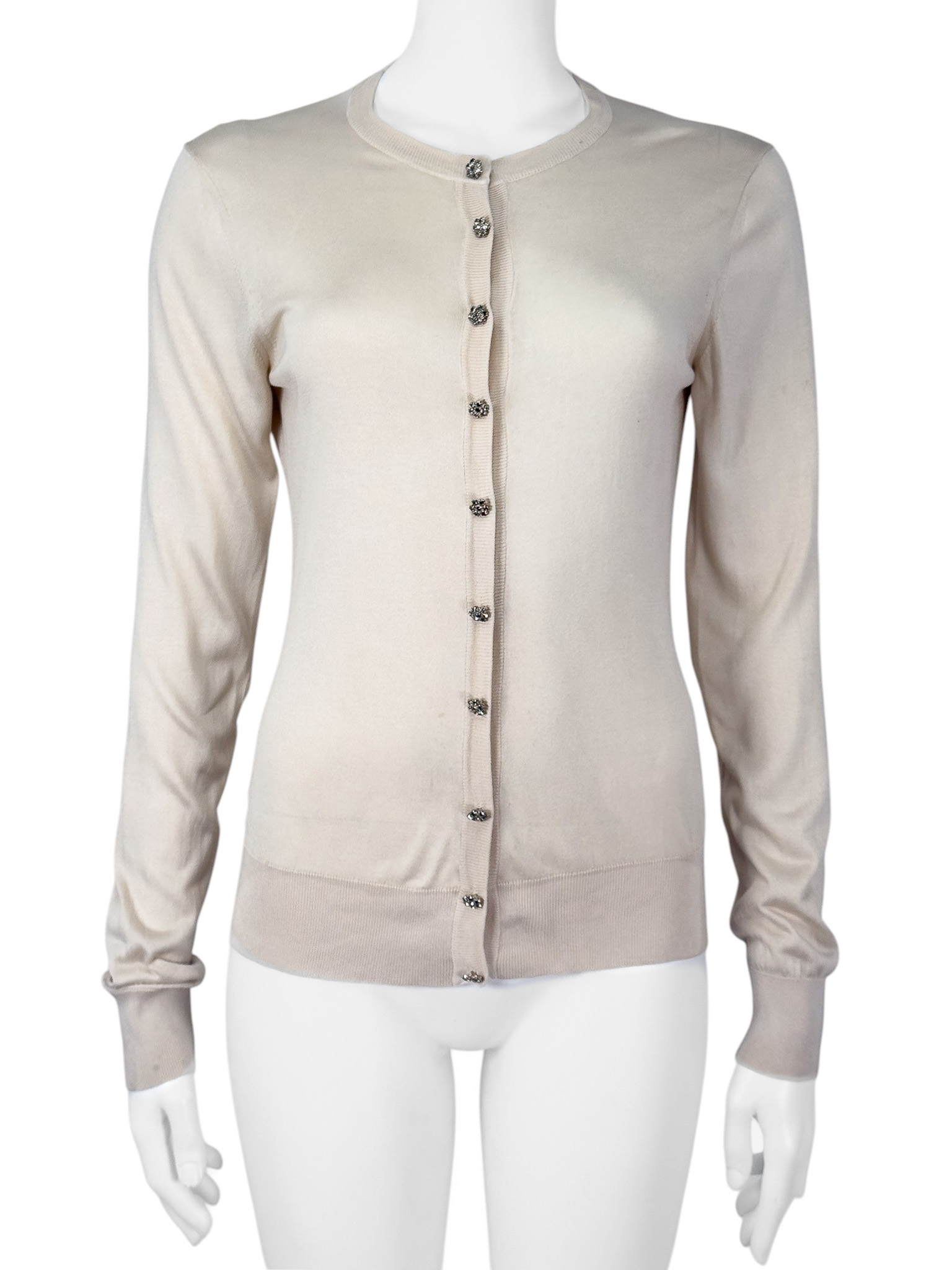 "Beżowy kardigan zapinany na srebrne kryształowe guziki w kształcie kwiatów, prosty, dopasowany krój, zaokrąglony dekolt, wykończony prążkowanym ściągaczem.Stan: bardzo dobry, posiada plamki oraz zaciągnięcie z tylnej strony. Brak metki ze składem i rozmiarem. Rozmiarowo wypada jak S. Wymiary: szerokość mierzona od pachy do pachy 44cm, długość całkowita 60cm."