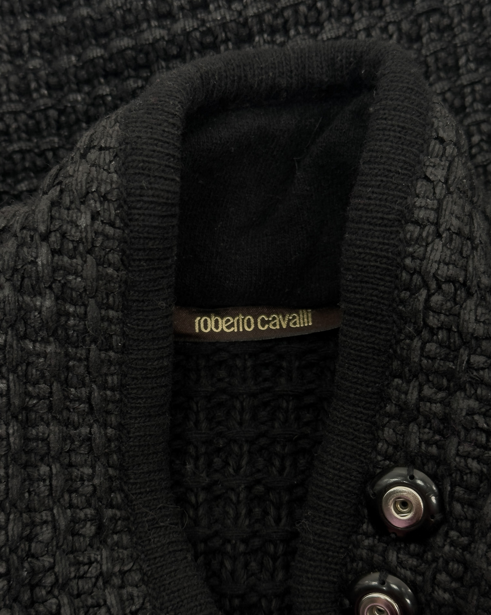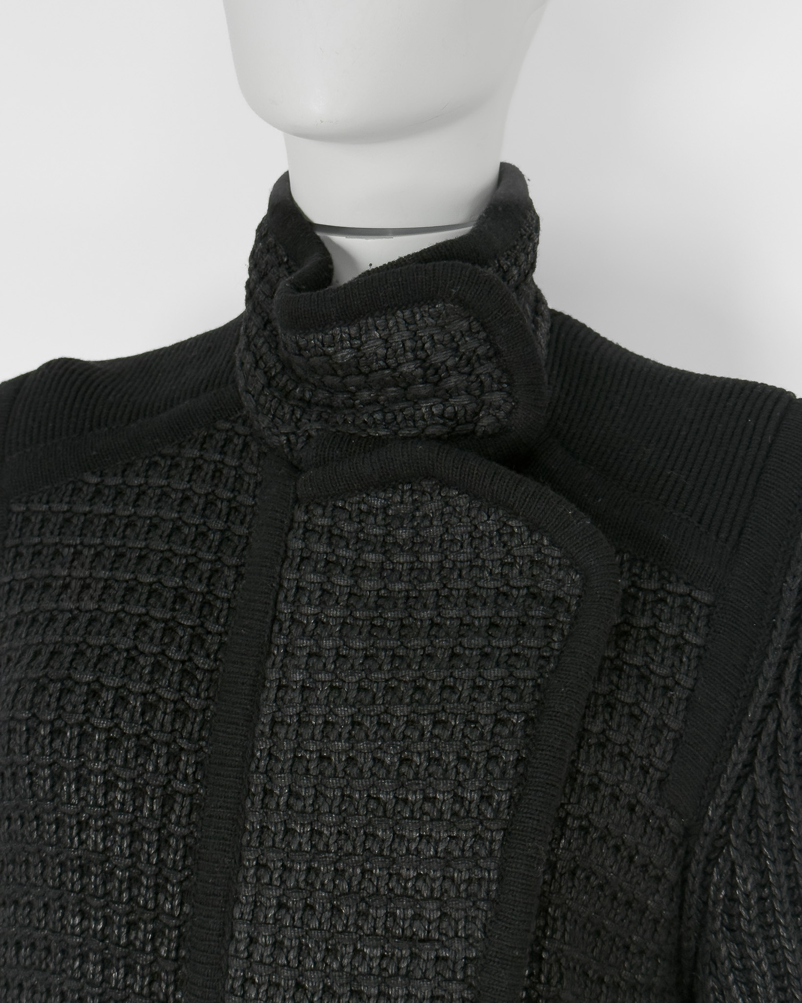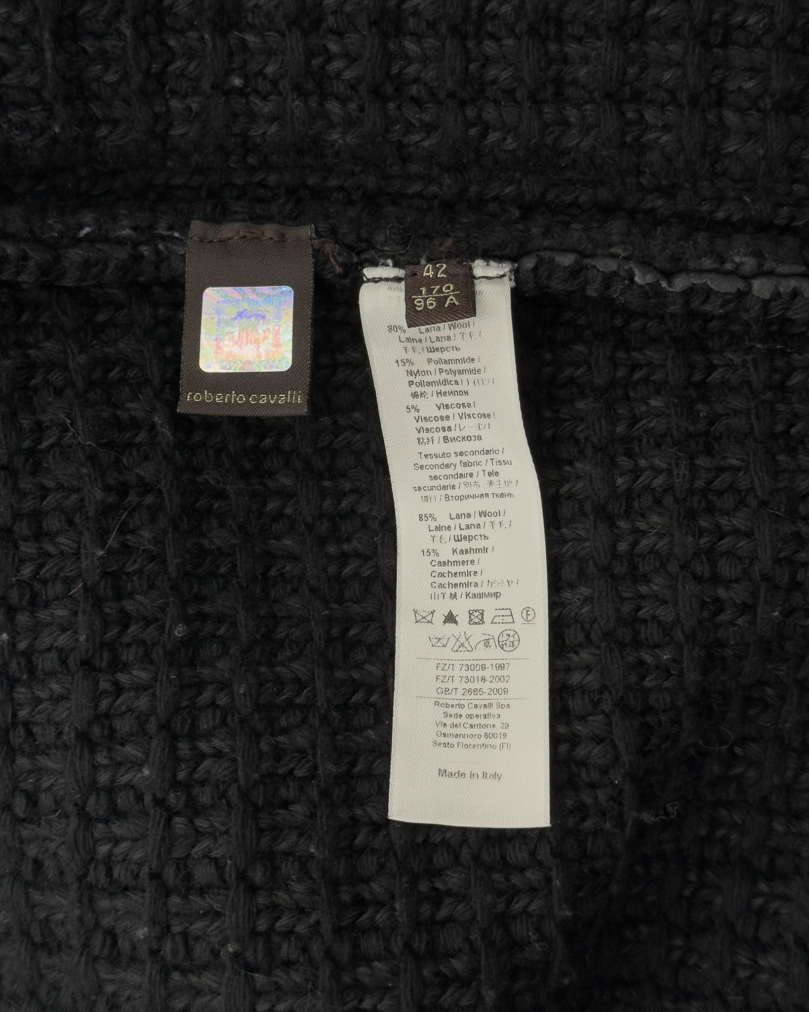 "Grafitowo-czarny długi kardigan z domieszką wełny w składzie, z kołnierzem zapinanym pod szyję, wykonany z błyszczącej, woskowanej nitki, zapinany na napy po całej długości. Posiada dwie duże kieszenie z przodu. Rozmiar z metki IT 42. Stan bardzo dobry. Skład: 80% wełna, 15% poliamid, 5% wiskoza. Wymiary: szerokość mierzona od pachy do pachy 46cm, długość całkowita 92cm."