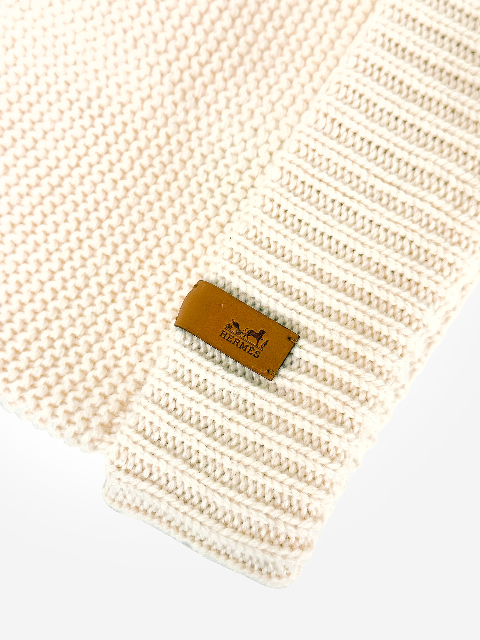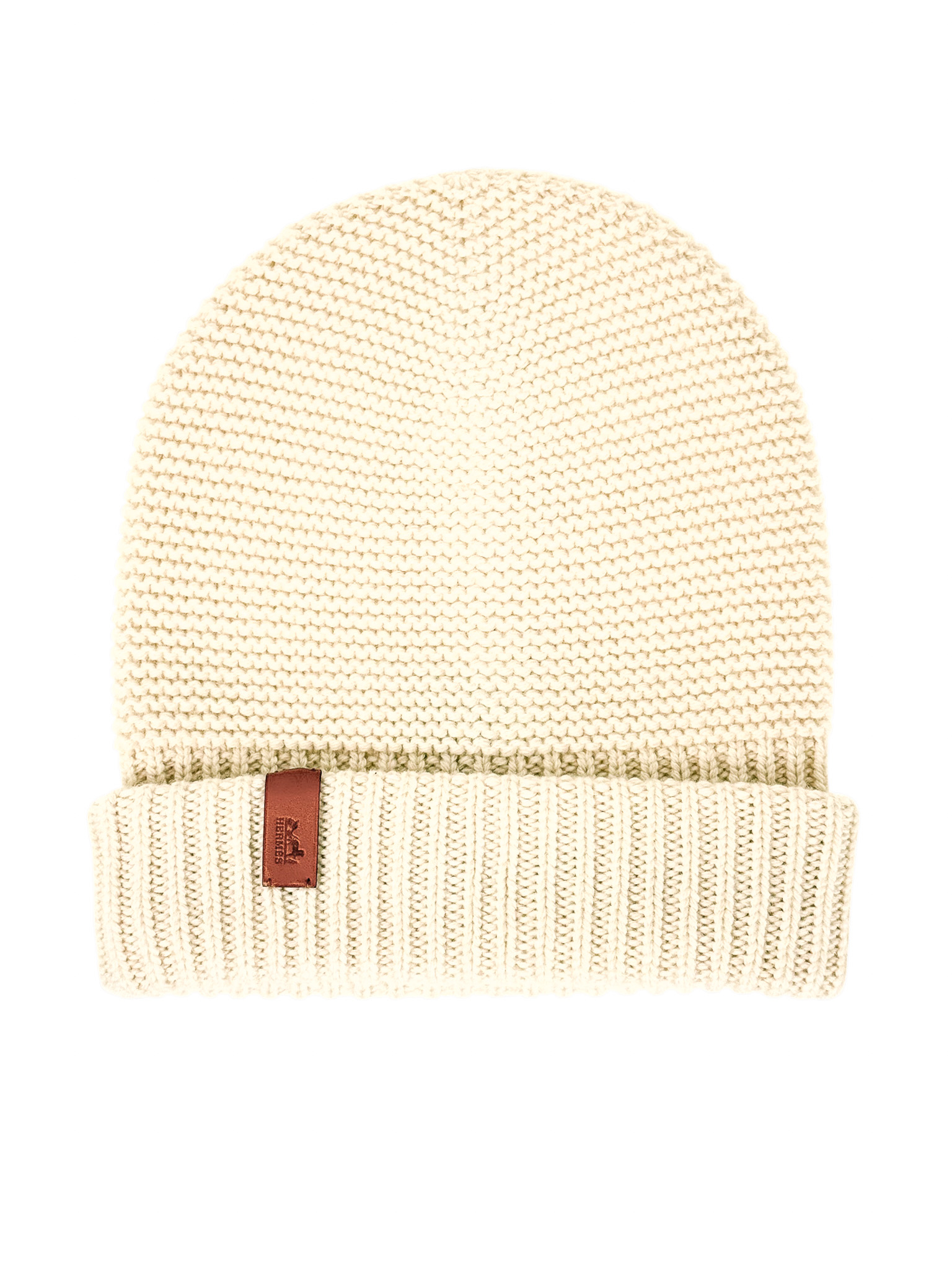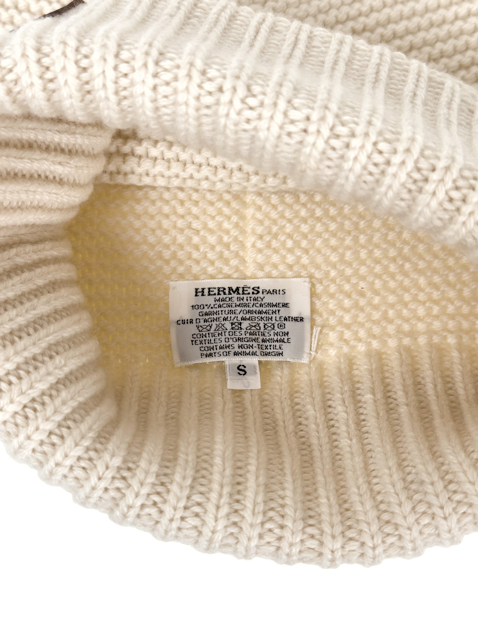 "Beżowa kaszmirowa czapka, odwijana, ozdobiona skórzaną brązową metką z logo marki. Stan bardzo dobry. Rozmiar z metki S. Skład: 100% kaszmir."