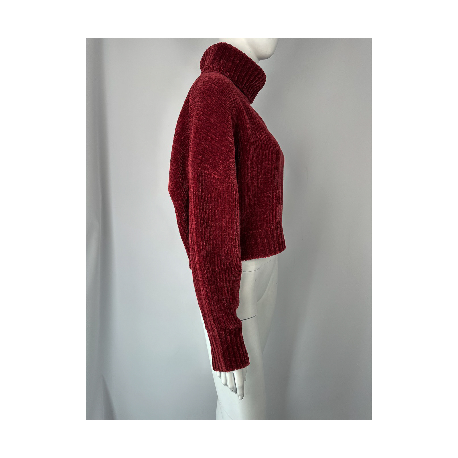 "Bordowy aksamitny kaszmirowo-jedwabny prążkowany sweter, odwijany golf, krój oversize, krótki, obniżona linia ramion, szerokie rękawy, zakończony ściągaczem. Rozmiar z metki S. Skład: 65% kaszmir, 28% jedwab, 7% poliamid. Wymiary: szerokość mierzona od pachy do pachy 59cm, długość całkowita 45,5cm, długość rękawa 43cm."