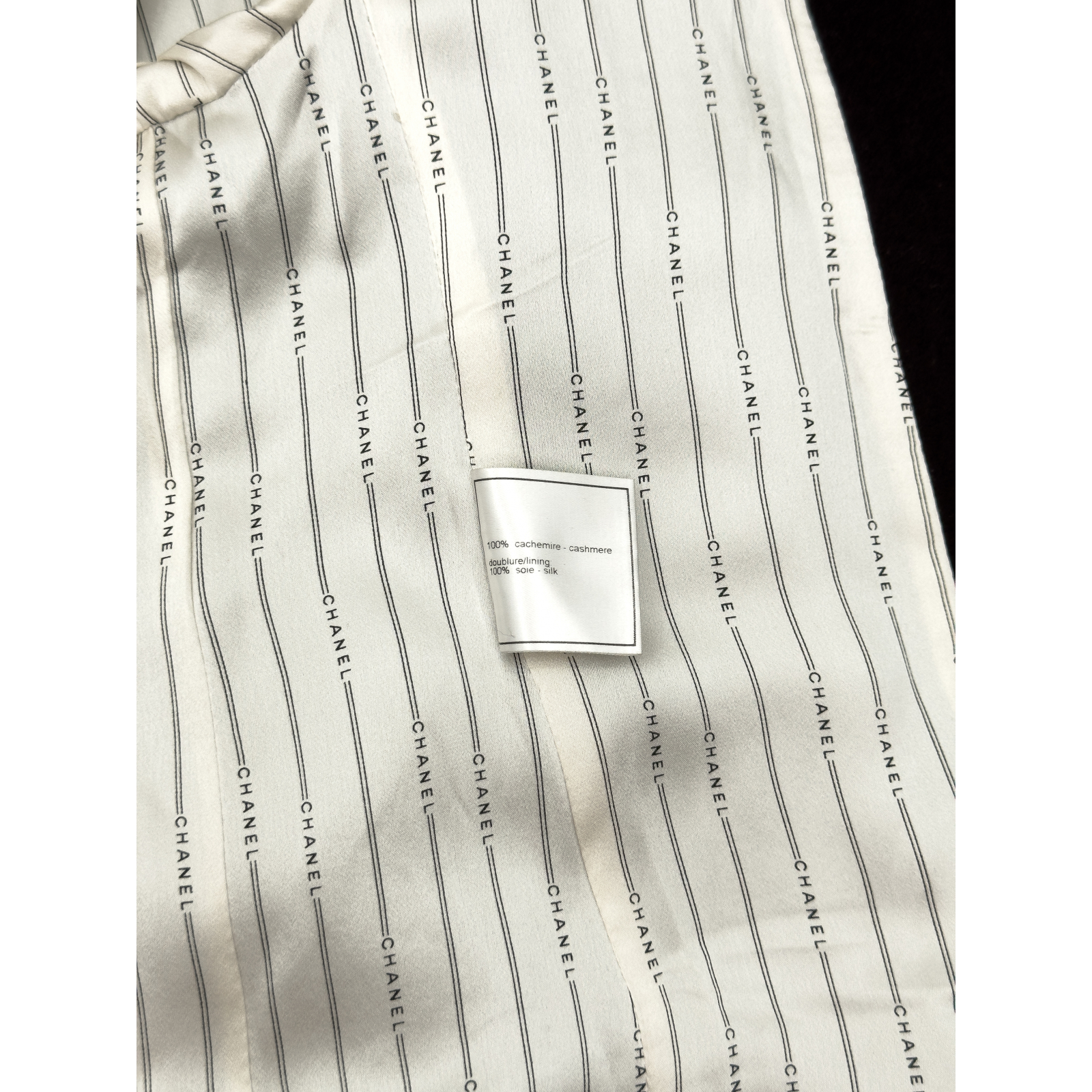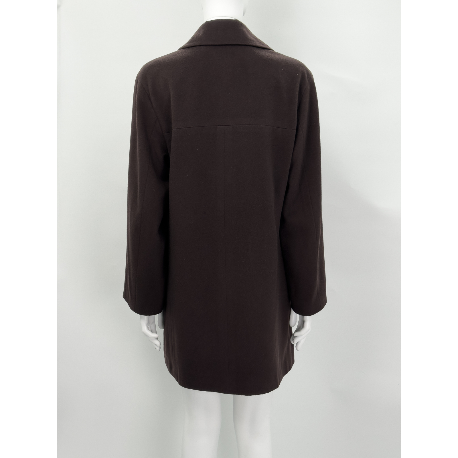 "Czekoladowy kaszmirowy płaszcz, zapinany na dwie ciemnozłote logowane klamry, prosty krój, długość przed kolano, głęboki dekolt, odwijany kołnierz, dwie kryte kieszenie po bokach, jedwabna logowana podszewka w kolorze ecrue. Rozmiar z metki FR 40. Skład: 100% kaszmir; podszewka; 100% jedwab. Wymiary: szerokość mierzona od pachy do pachy 53cm, długość całkowita 84cm."