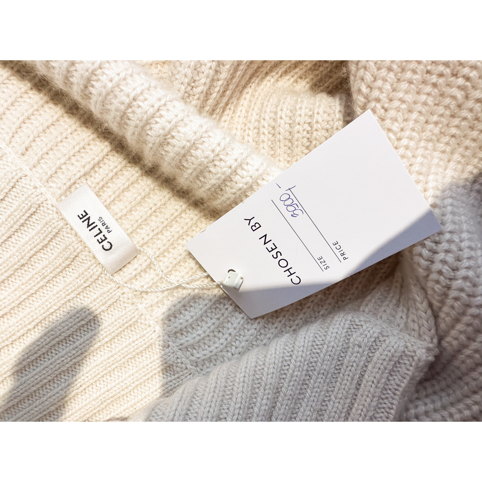 "Prążkowany kaszmirowy sweter w kolorze ecrue, dwie zaszyte kieszenie w dolnej części ze złotymi ozdobami z logo w kształcie charakterystycznym dla marki, odwijany golf, głęboki dekolt w serek, dół oraz mankiety wykończone ściągaczem. Rozmiar z metki M. Skład: 100% kaszmir. Wymiary: szerokość mierzona od pachy do pachy 61cm, długość całkowita 60cm."