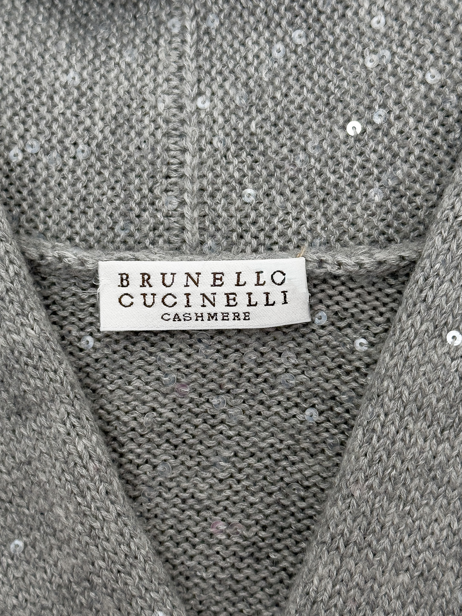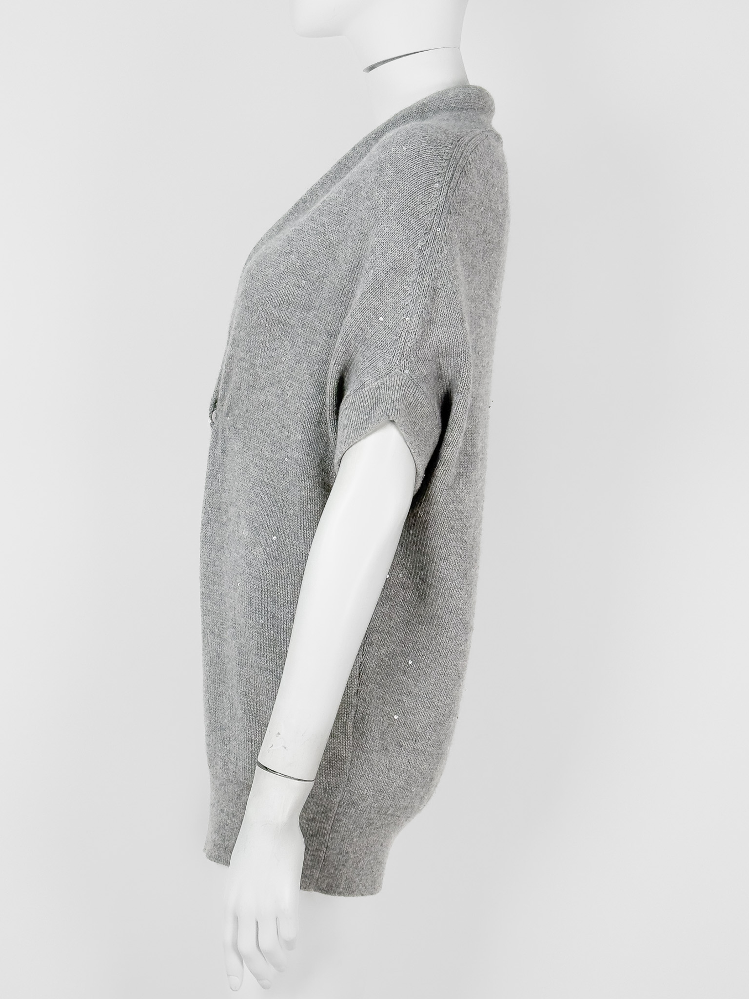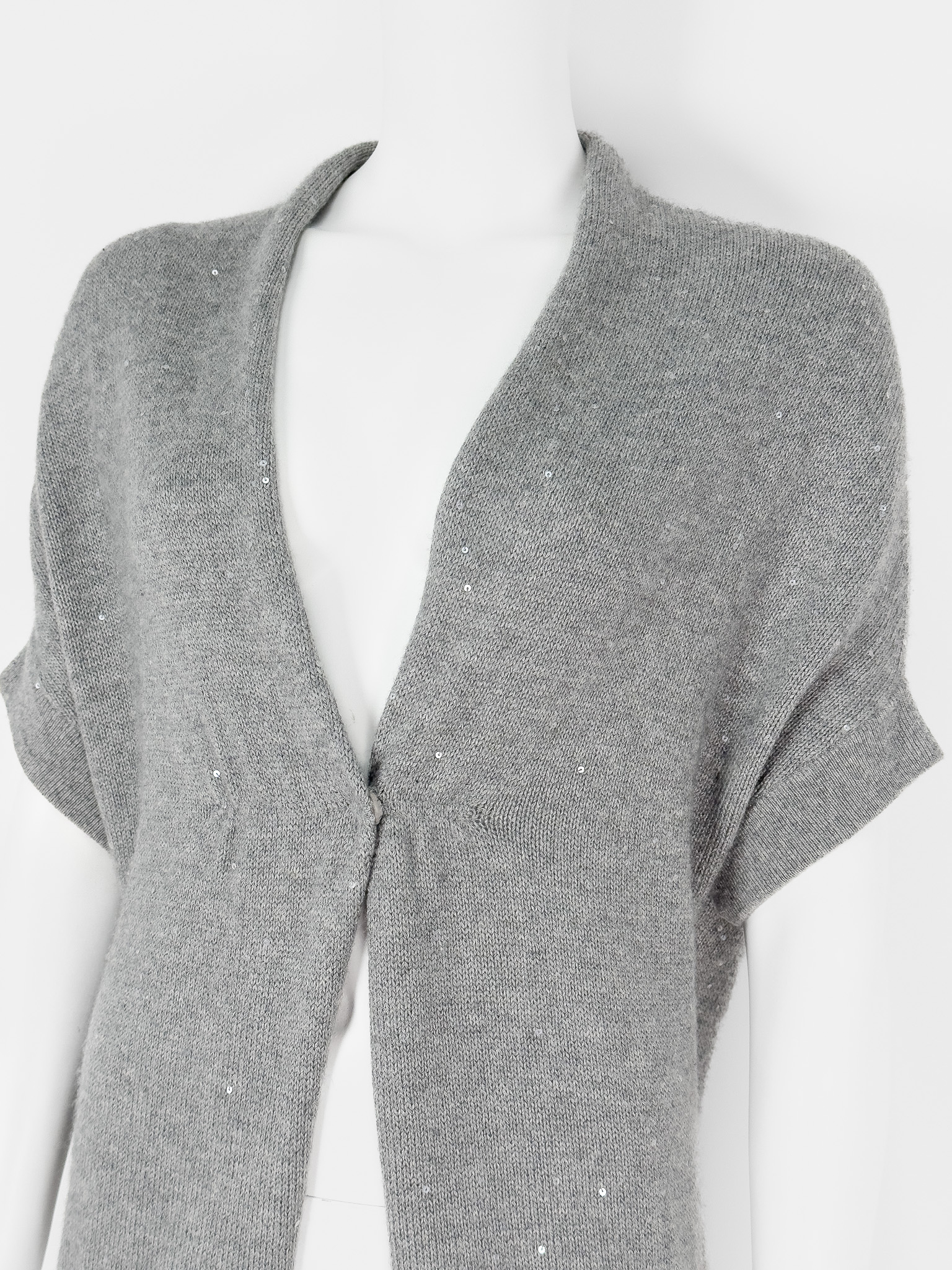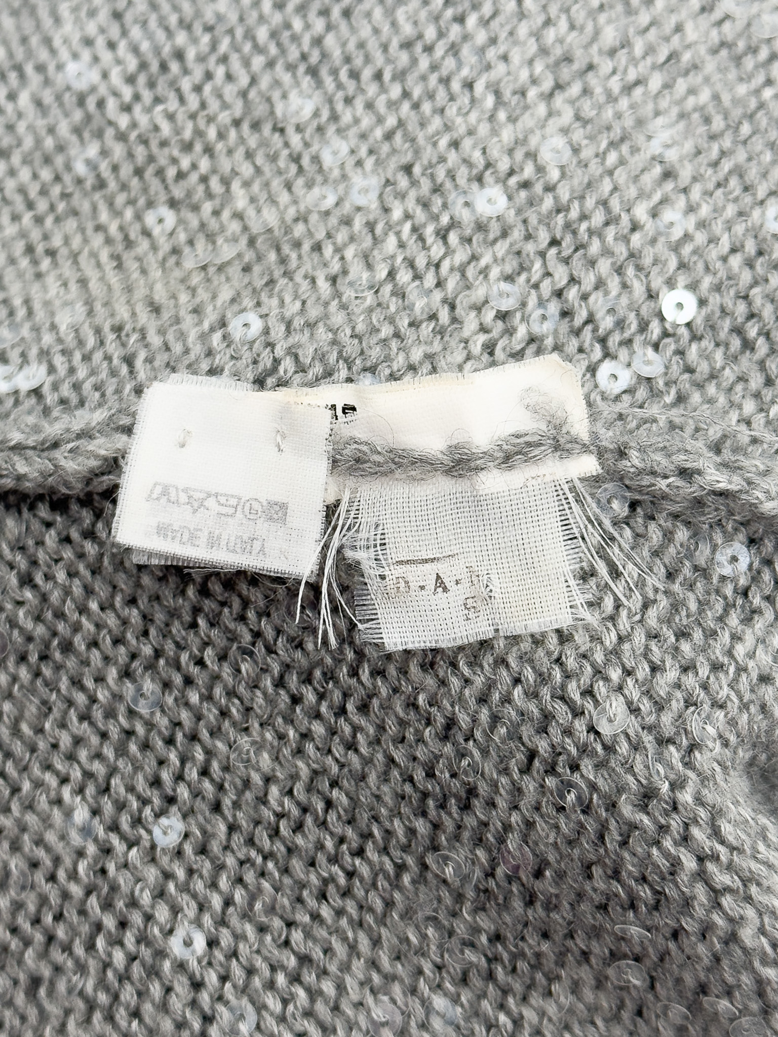 "Szary kaszmirowy sweterek ozdobiony cekinami, krótki rękaw, zapinany na zatrzask. Głęboki dekolt w szpic. Wykończony prążkowanym ściągaczem w dolnej części oraz przy mankietach. Rozmiar z metki S. Wycięta metka z składem. Wymiary: szerokość mierzona od pachy do pachy 55cm, długość całkowita 76cm."