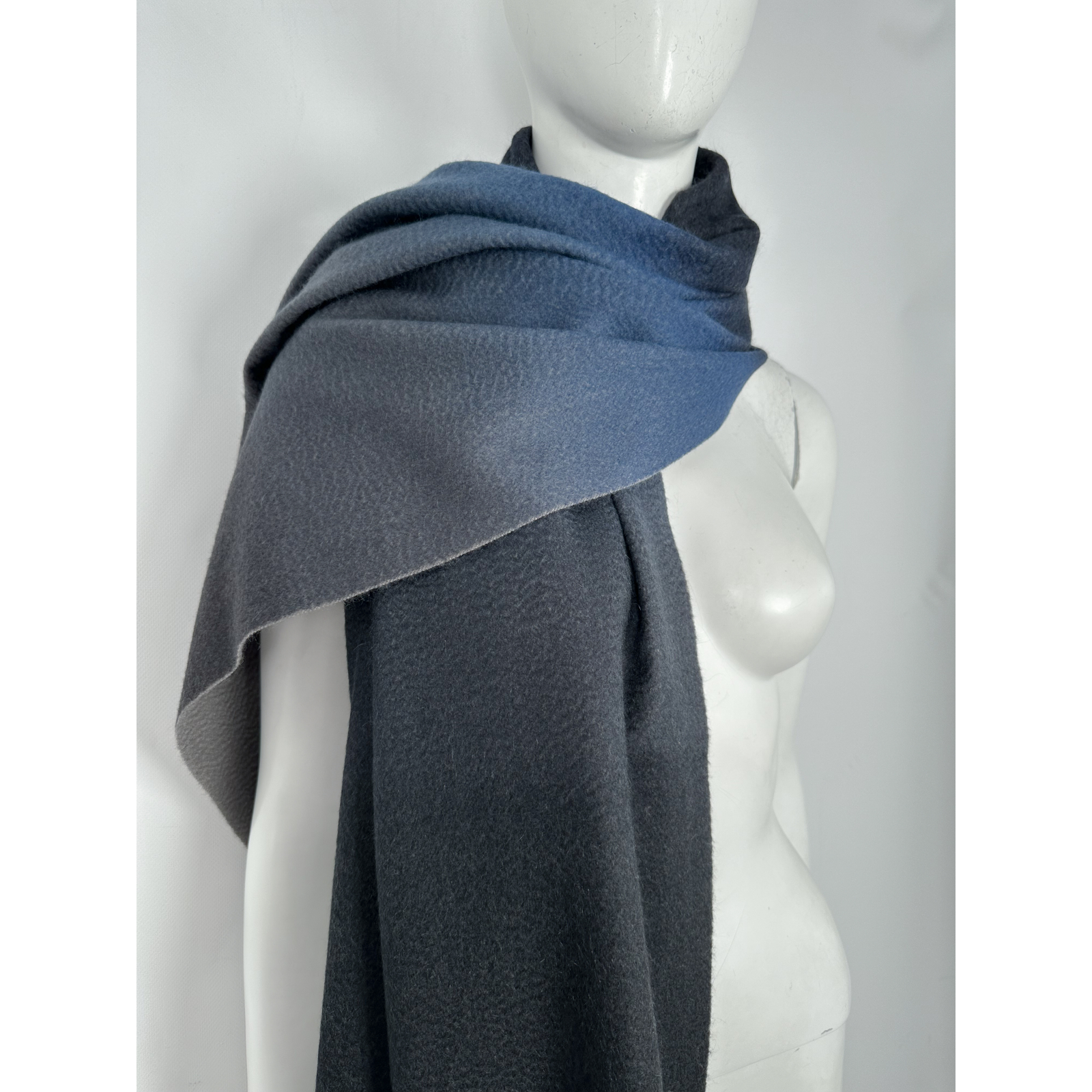 "Kaszmirowy cieniowany szal w odcieniach granatu i szarości, wykończony frędzlami, długi, prostokątny kształt, okrągły medalik z logo marki przy jednym rogu. Skład: 100% kaszmir. Wymiary: 70,5cm x 196cm."