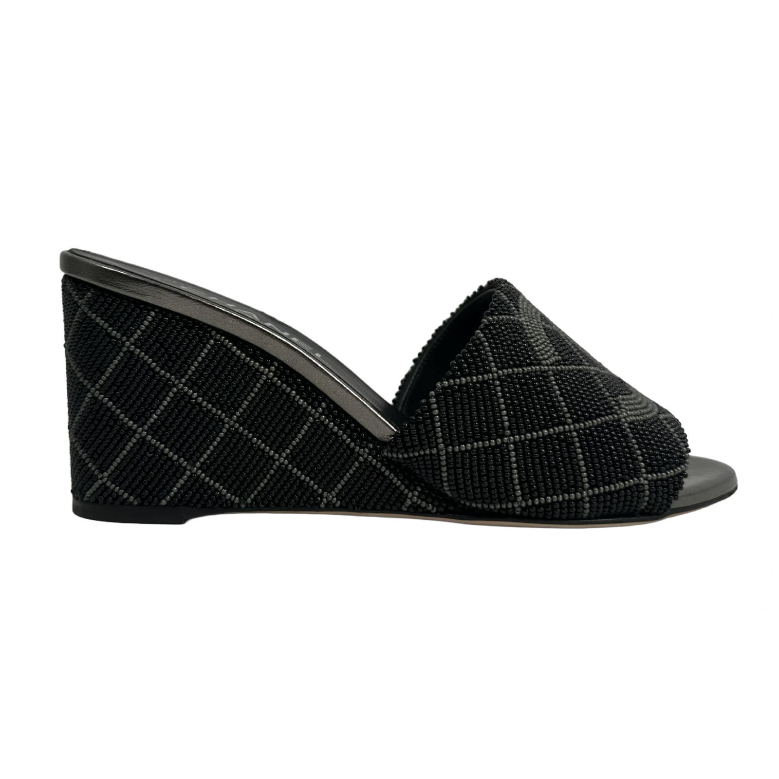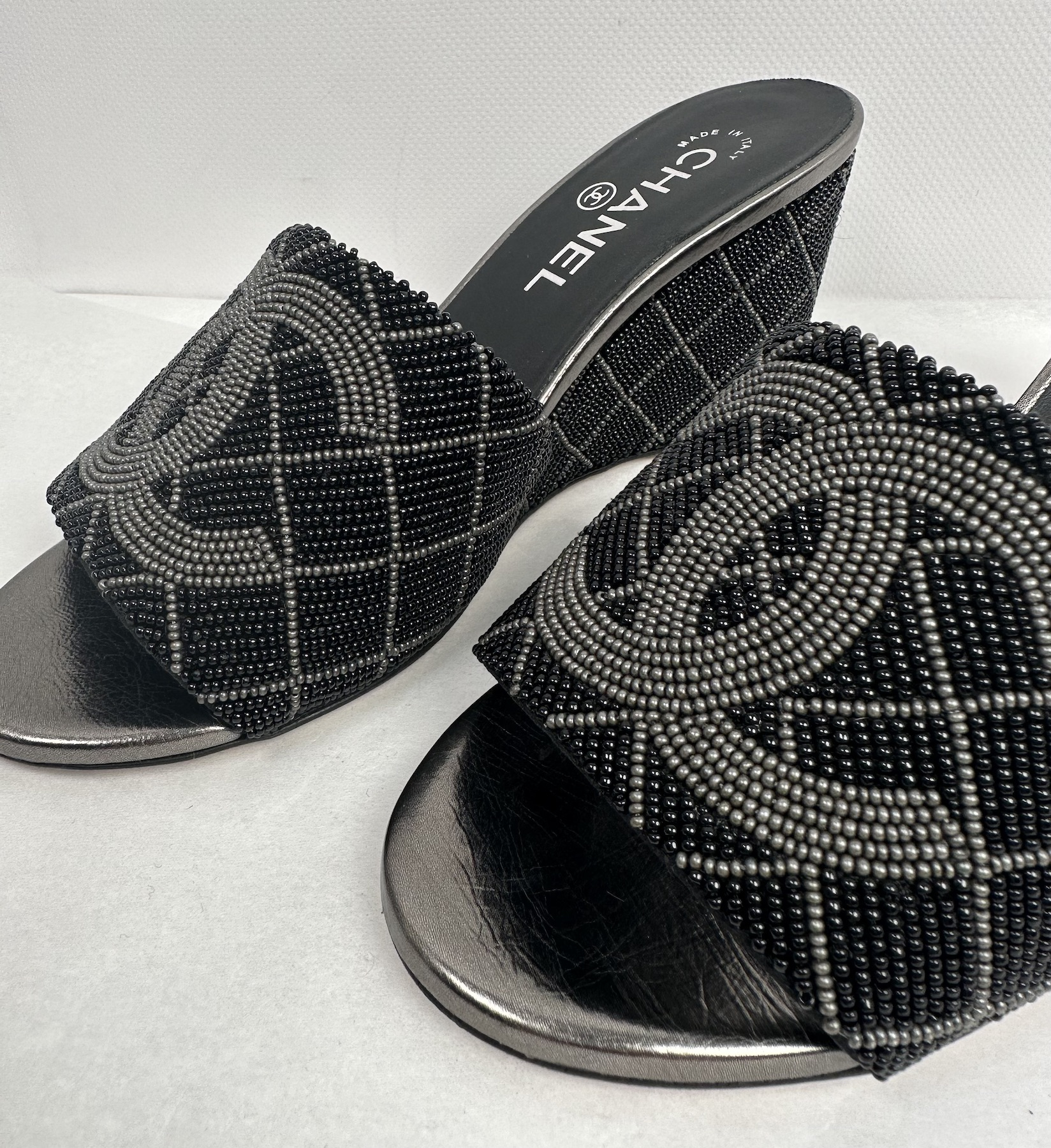 "Czarno-szare klapki na koturnie wysadzane koralikami z dużym logo marki na przodzie, zaokrąglone noski, wsuwane, czarna skórzana wkładka, w zestawie z workiem przeciwkurzowym. Stan nowe. Rozmiar 37,5."