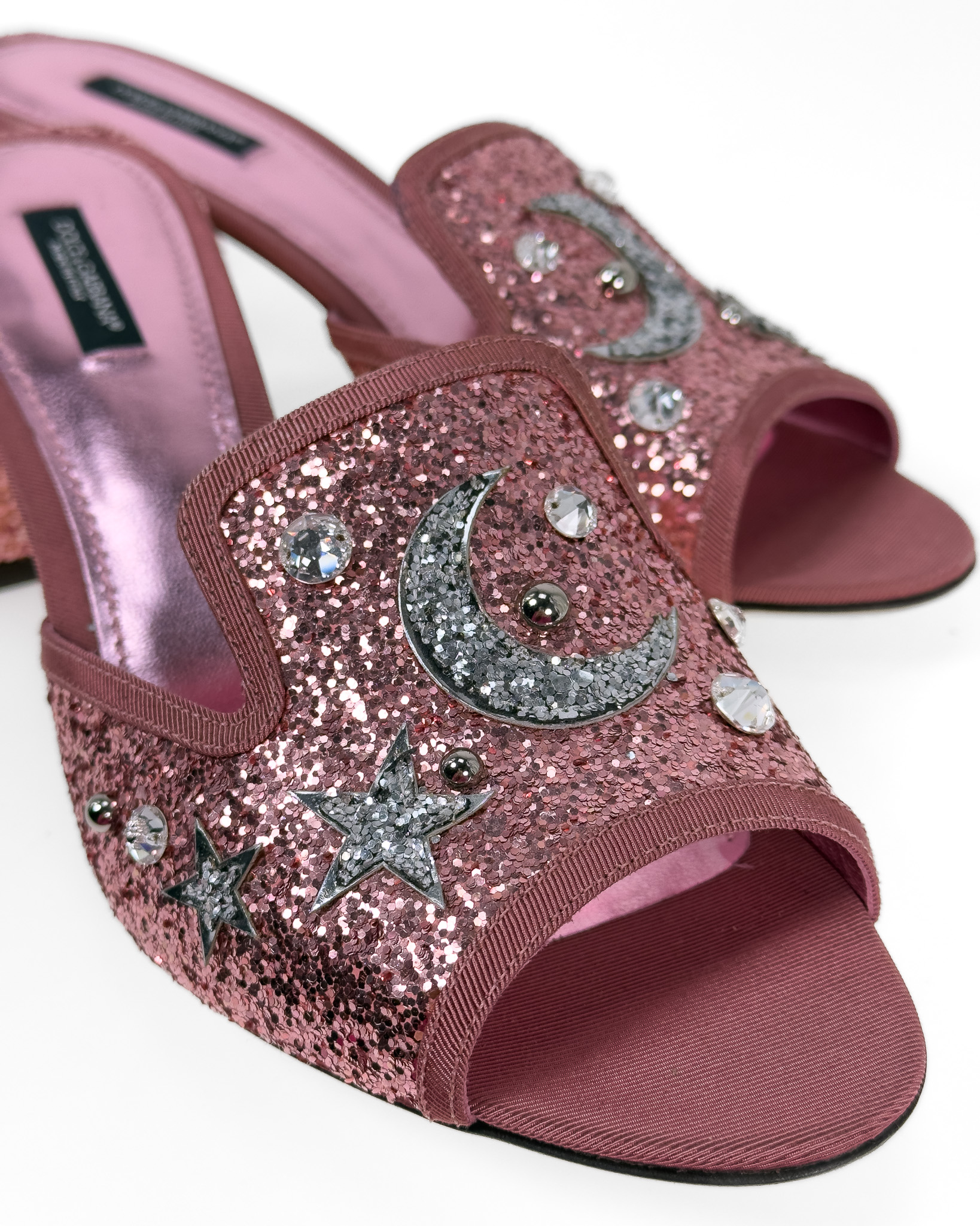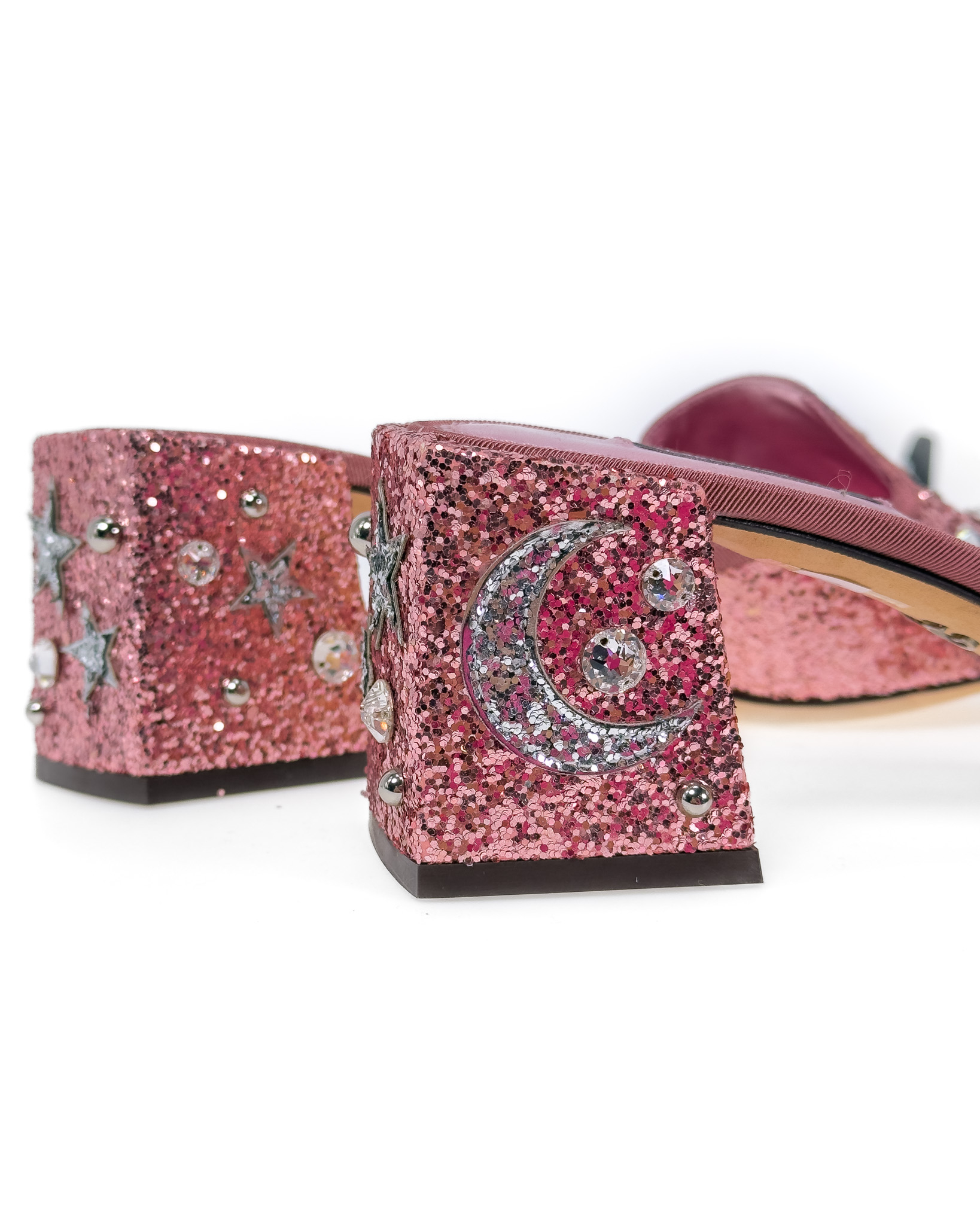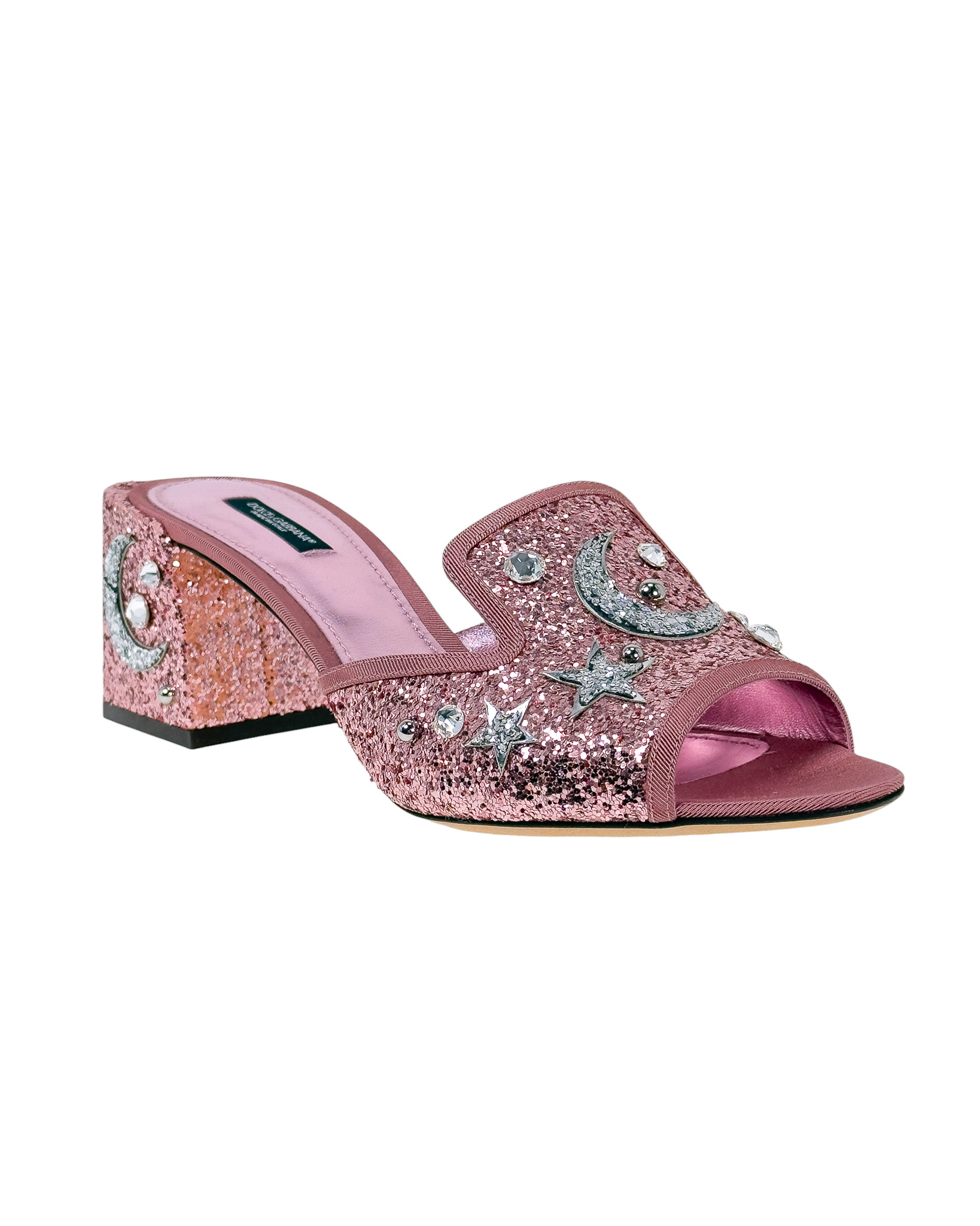 "Różowe brokatowe klapki na obcasie, wsuwane, ozdobione srebrnymi błyszczącymi dżetami o motywie gwiazd oraz księżyca, stożkowy obcas, materiałowa lamówka. Stan bardzo dobry, delikatne przetarcia na podeszwie. Rozmiar 41, wysokość obcasa 7cm."