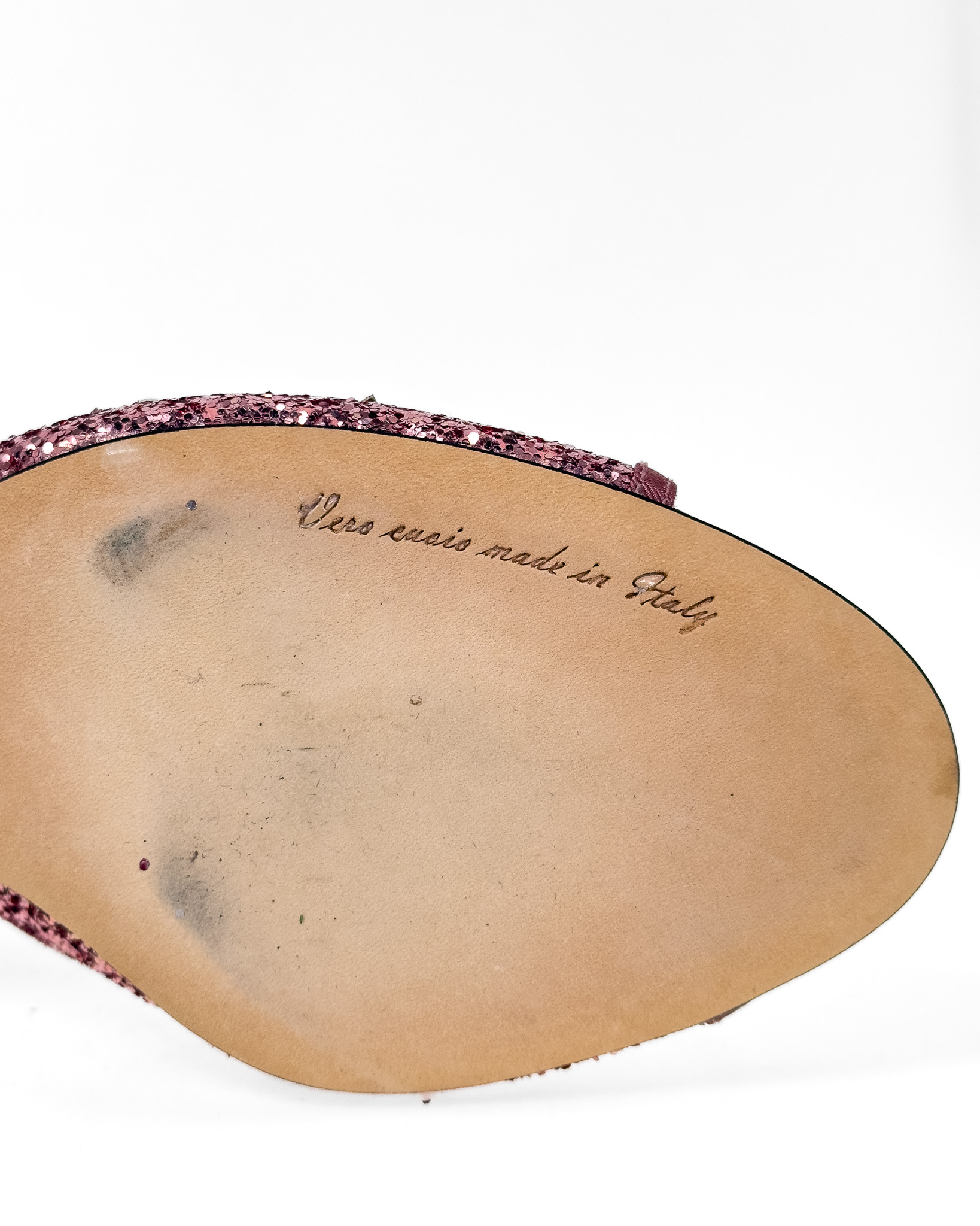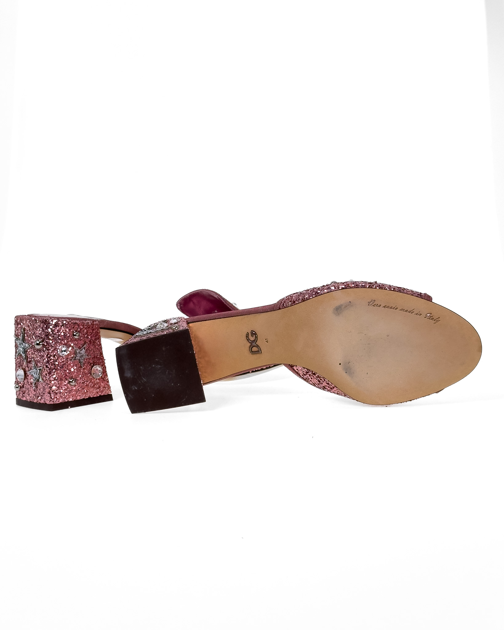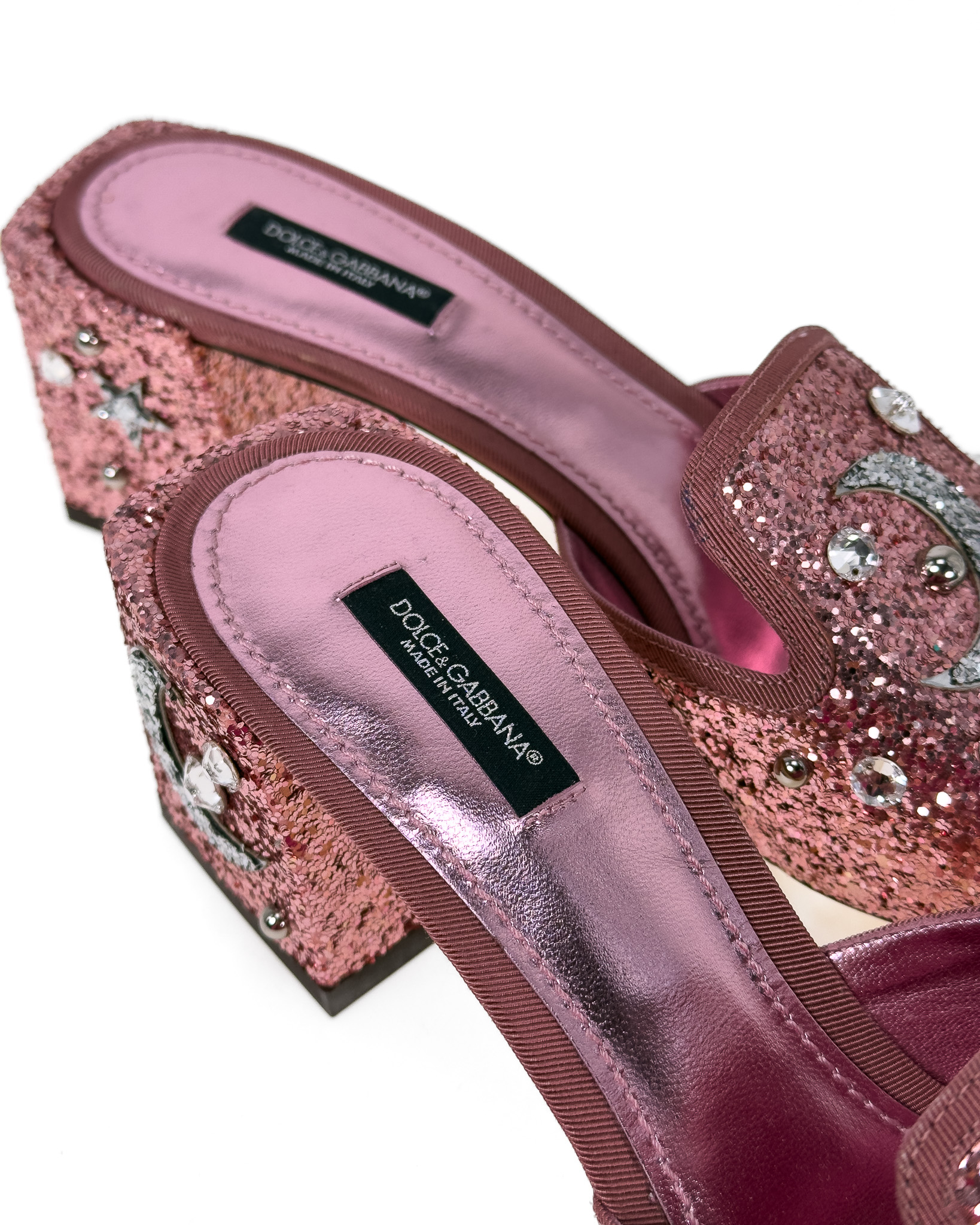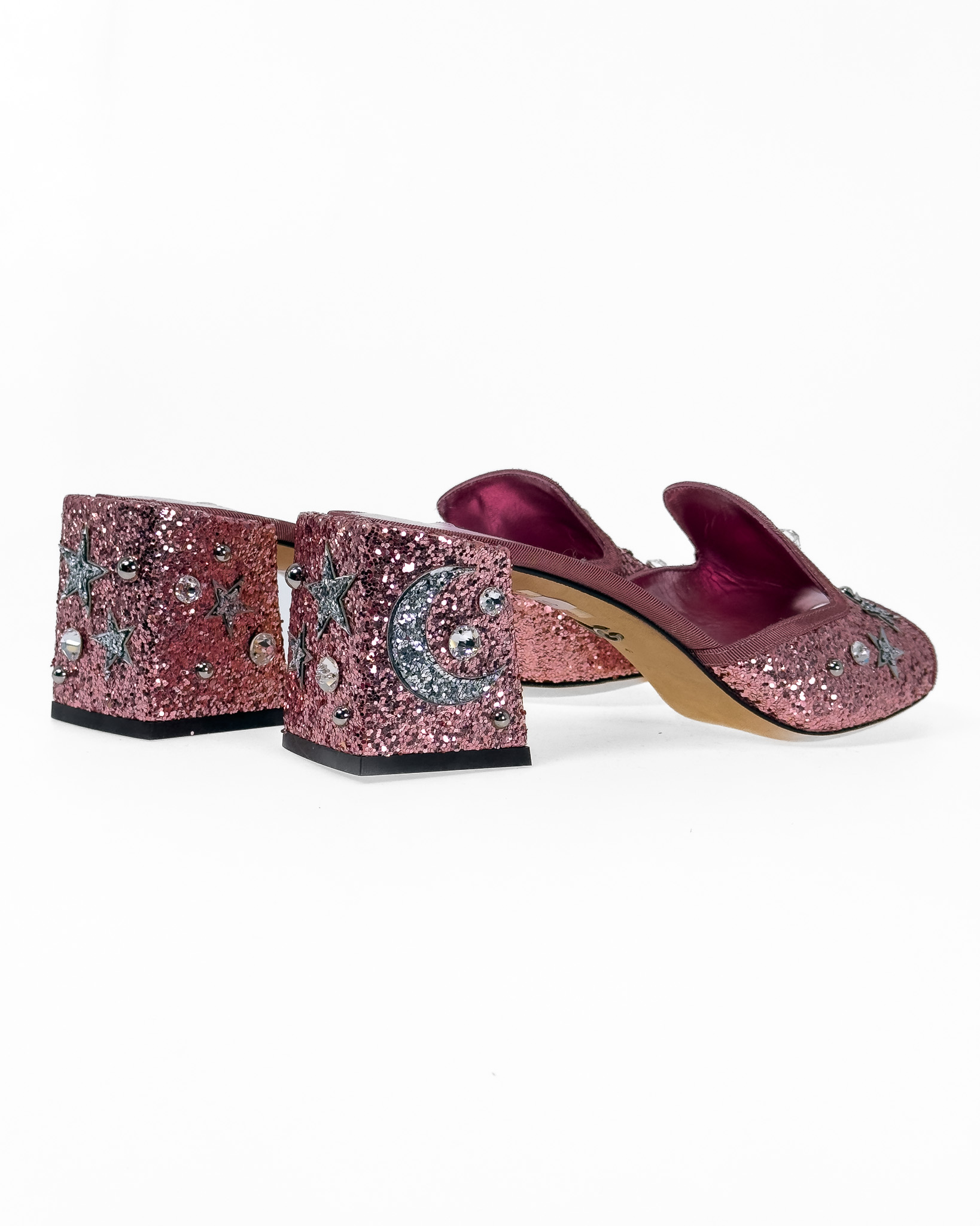 "Różowe brokatowe klapki na obcasie, wsuwane, ozdobione srebrnymi błyszczącymi dżetami o motywie gwiazd oraz księżyca, stożkowy obcas, materiałowa lamówka. Stan bardzo dobry, delikatne przetarcia na podeszwie. Rozmiar 41, wysokość obcasa 7cm."
