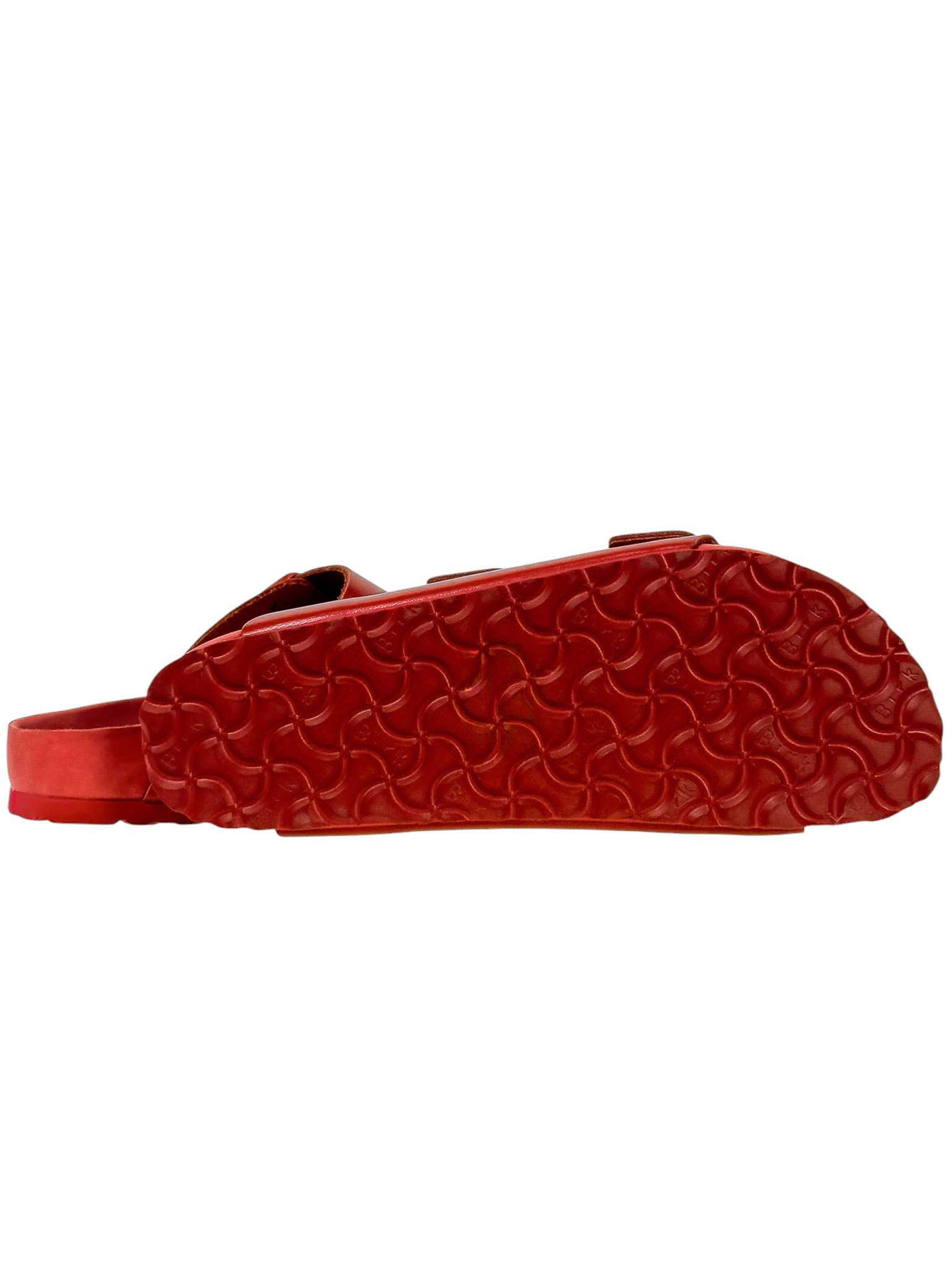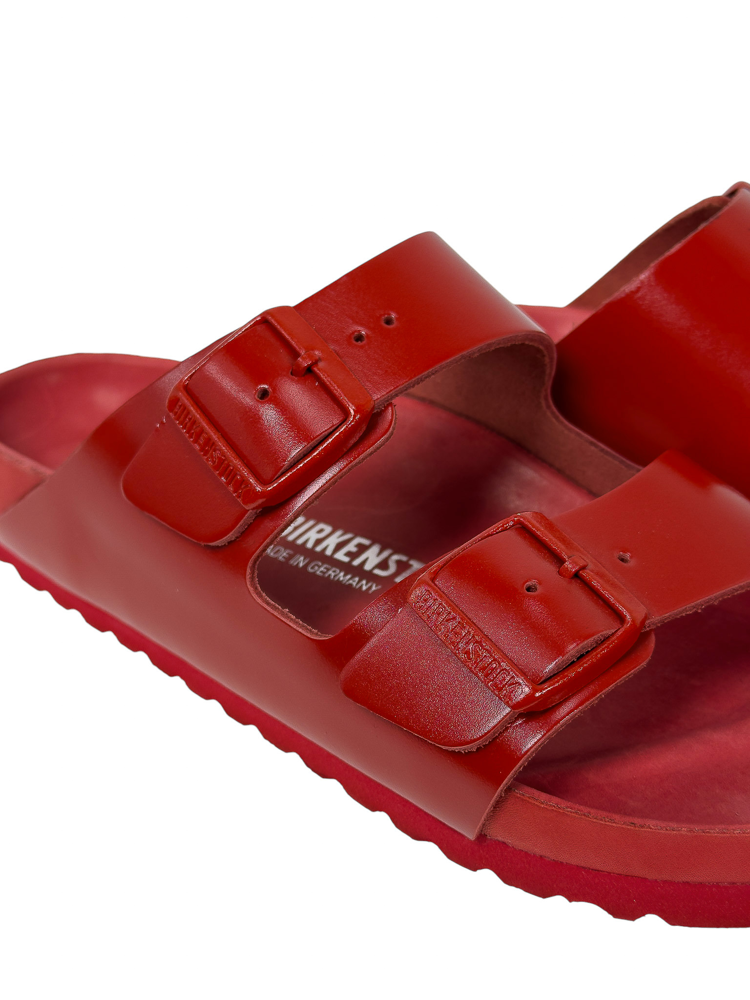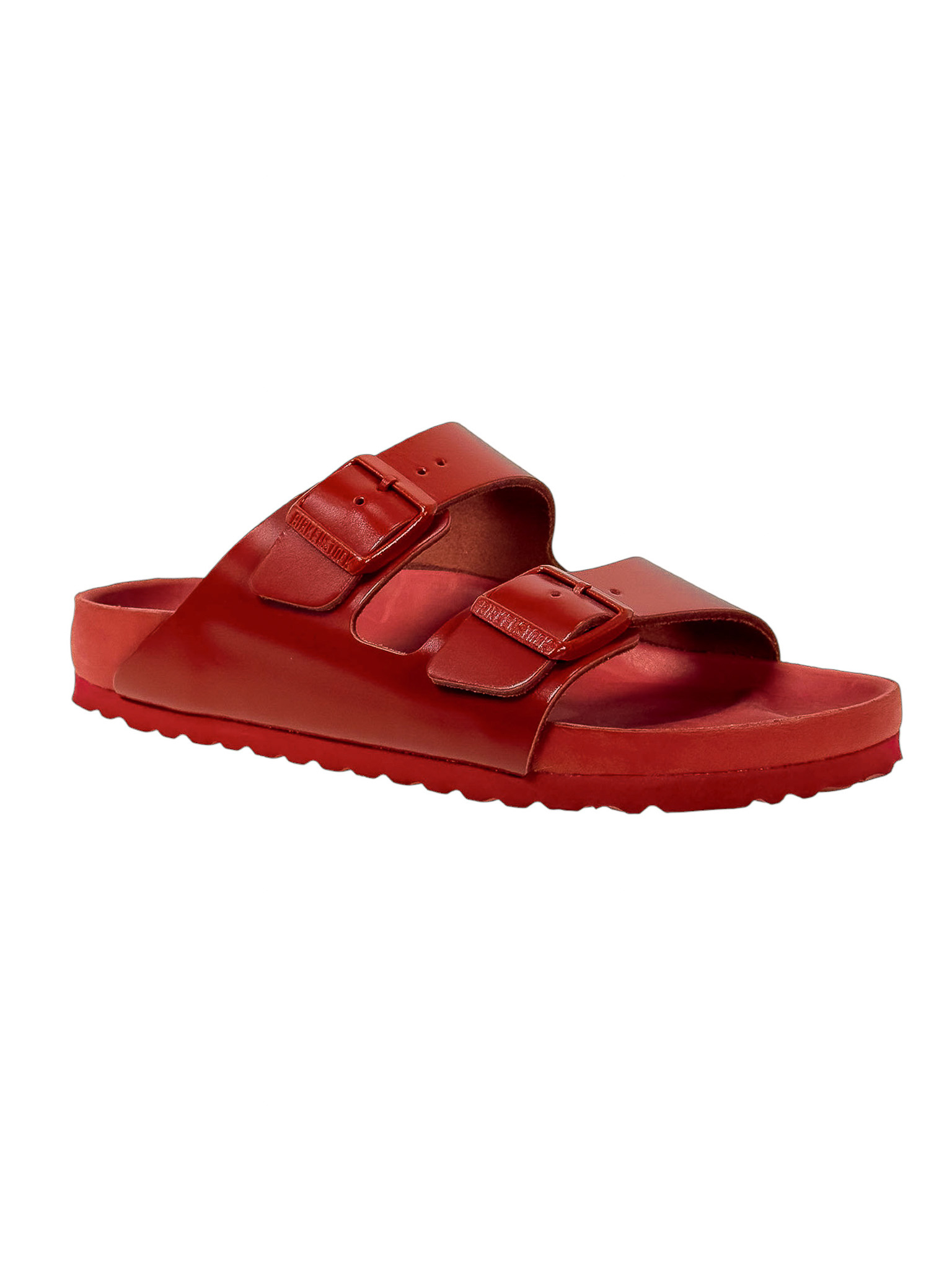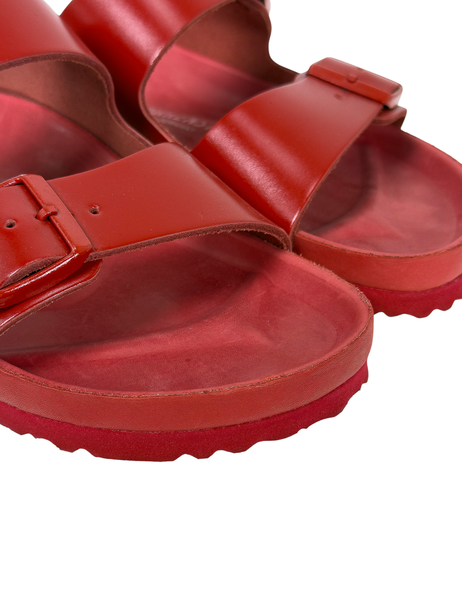 "Czerwone klapki, dwa regulowane skórzane paski na przodzie, zaokrąglone noski, wyprofilowana wkładka, gumowa podeszwa, logo marki od wewnętrznej strony oraz na klamrach. Stan bardzo dobry, posiadają delikatne rysy na wkładce. Rozmiar 40."